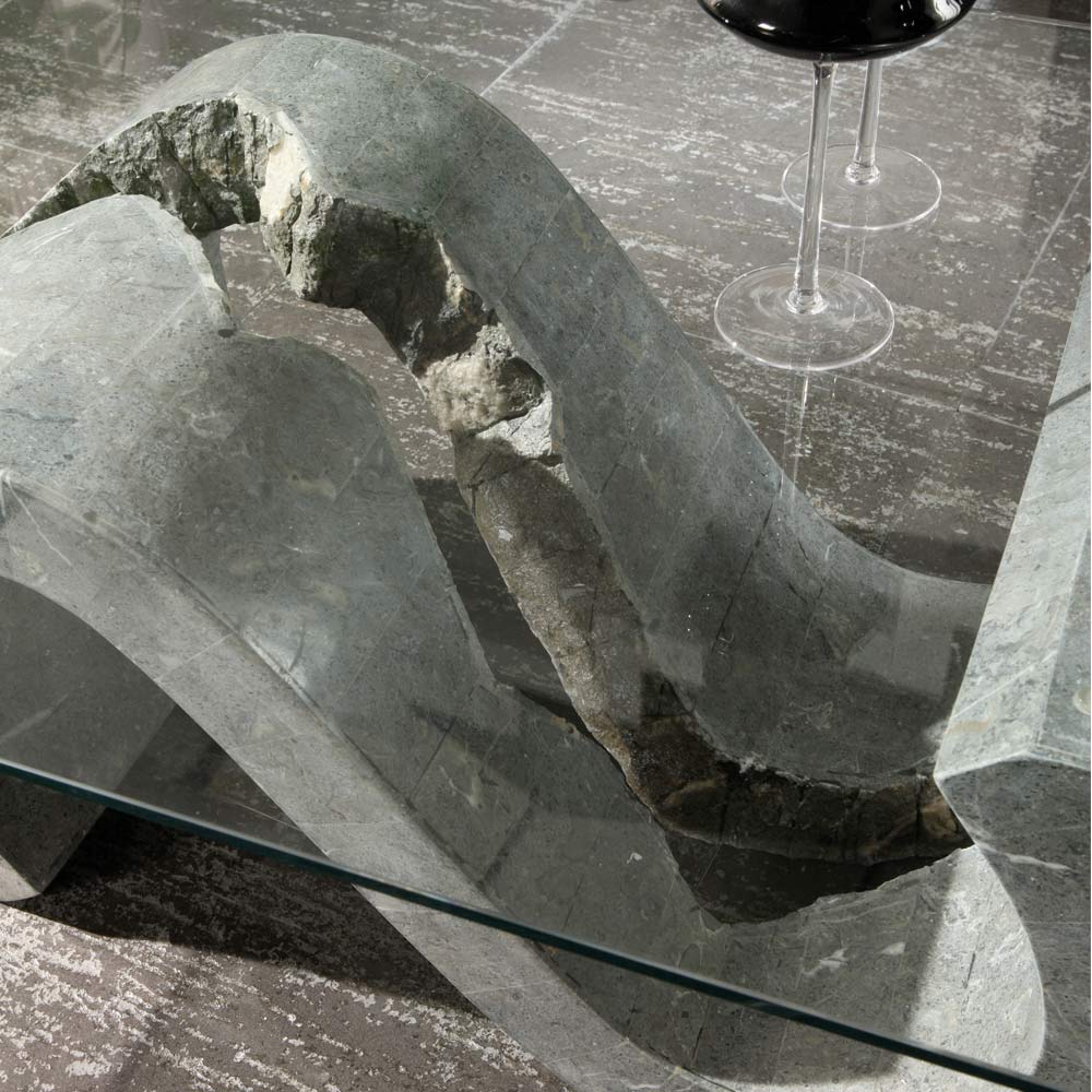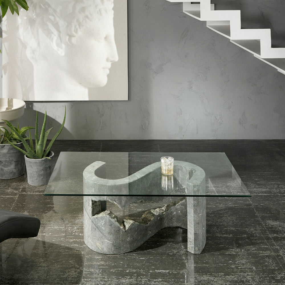 La mesa de centro está equipada con una tapa de cristal con canto pulido de 10 mm y una base de piedra fósil con acabado gris que presenta un diseño original y elegante.