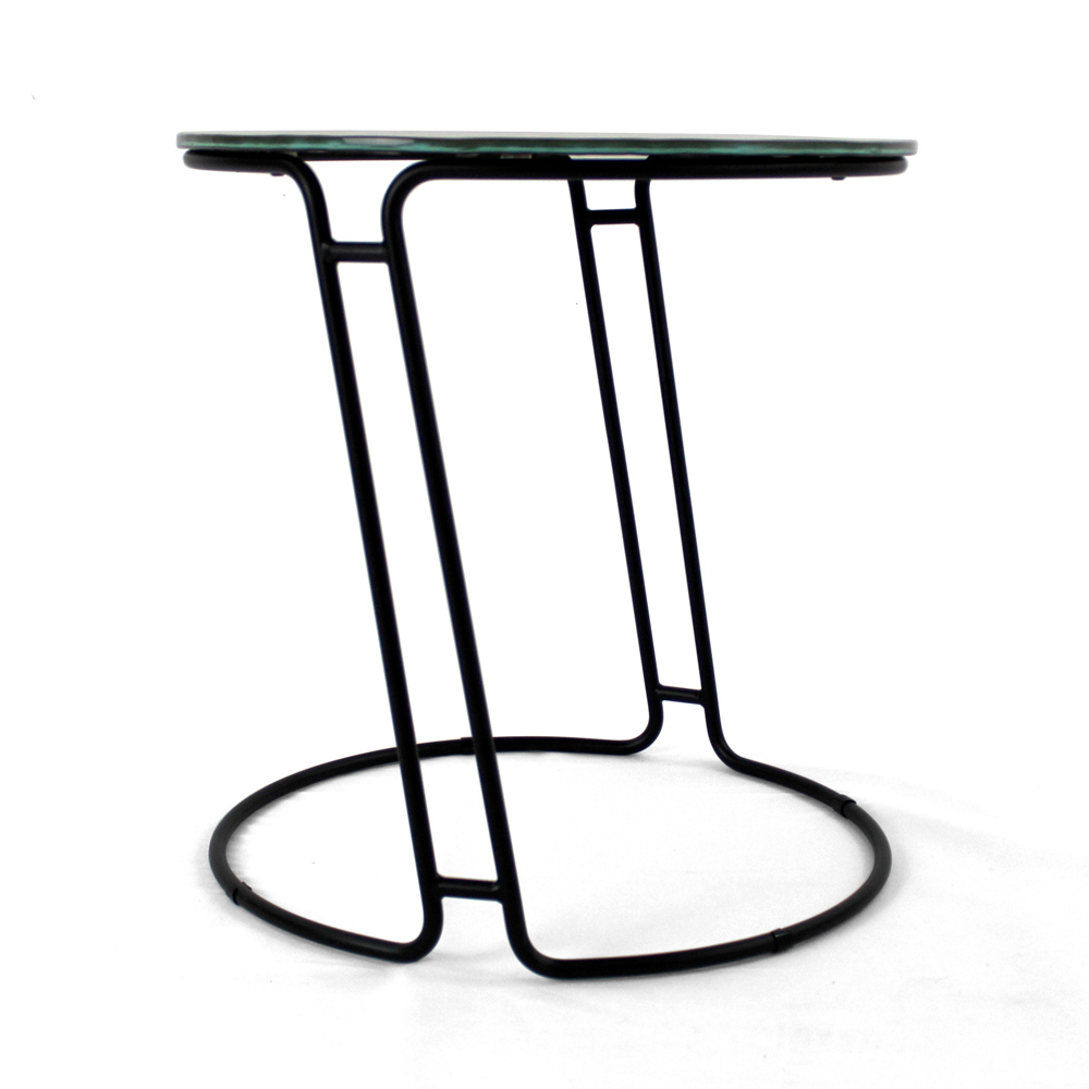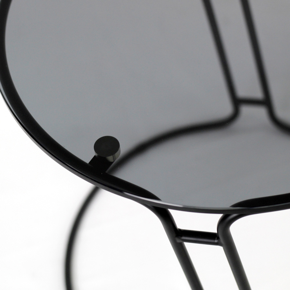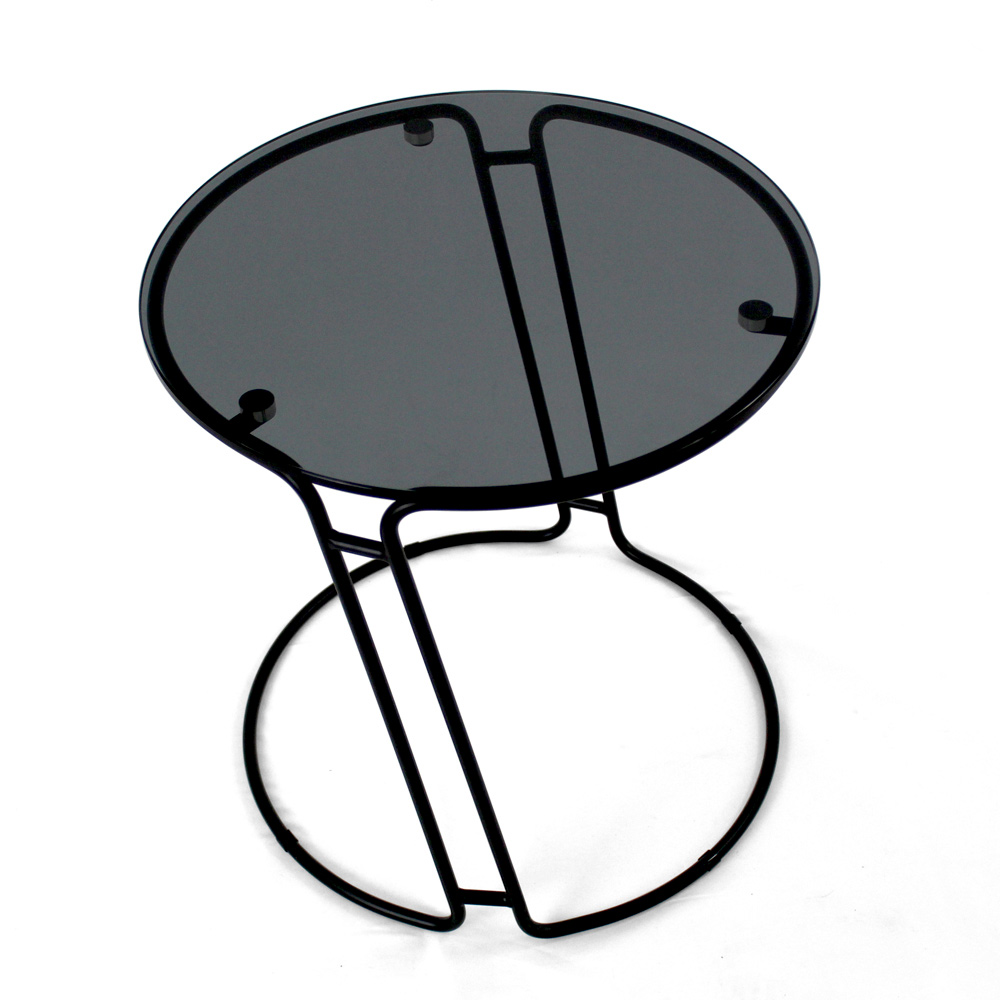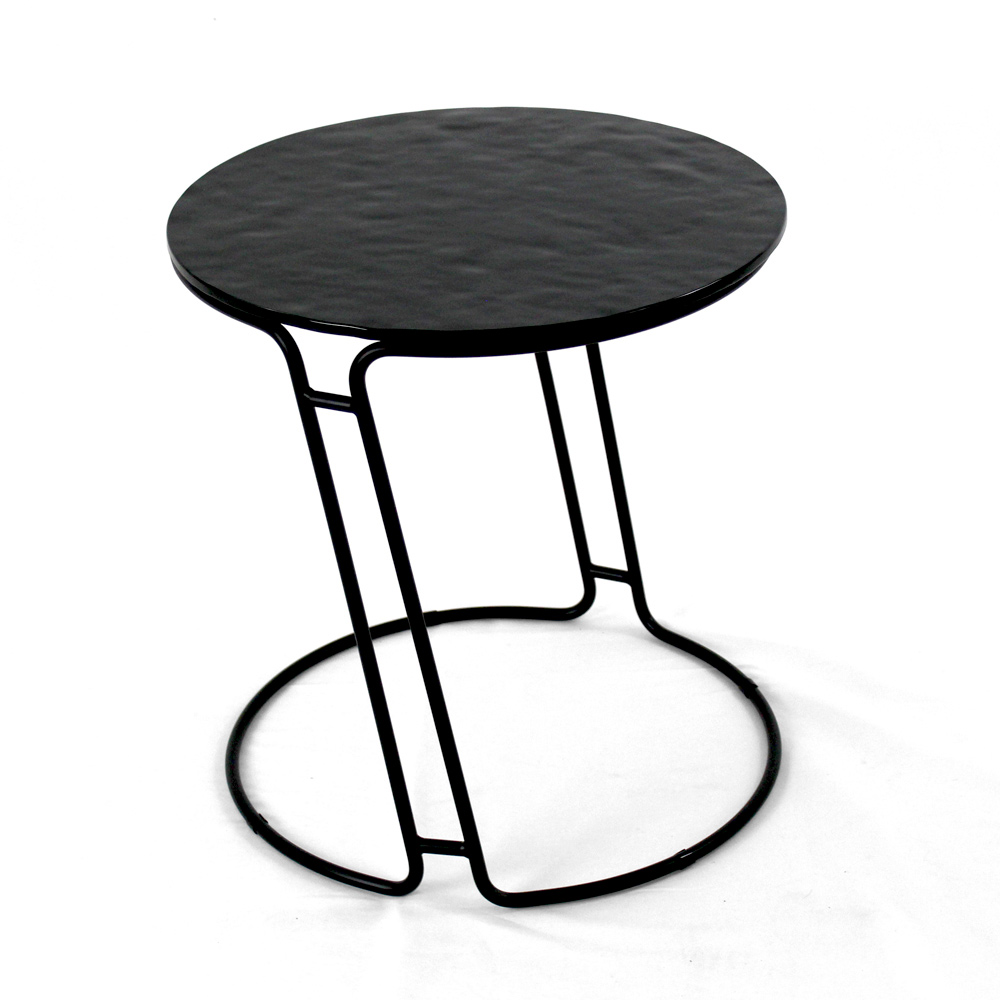 Mesita redonda con base de acero pintado y tapa de cristal.