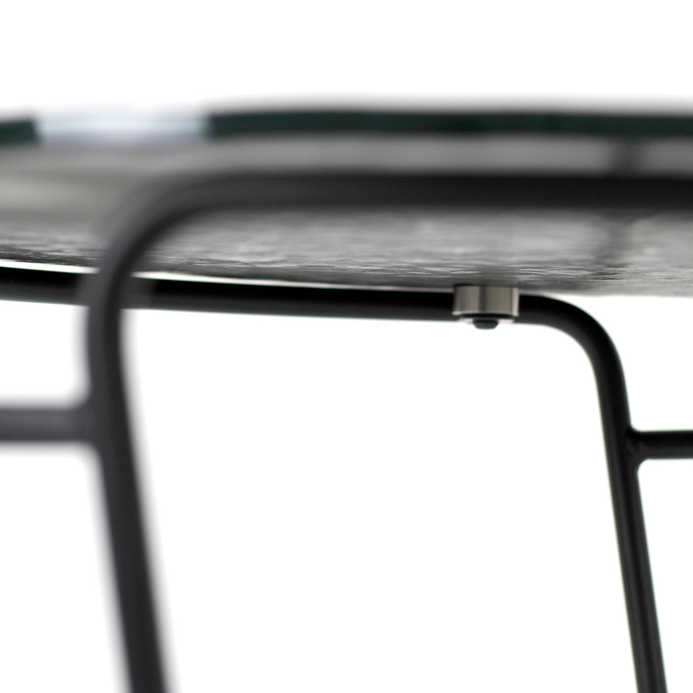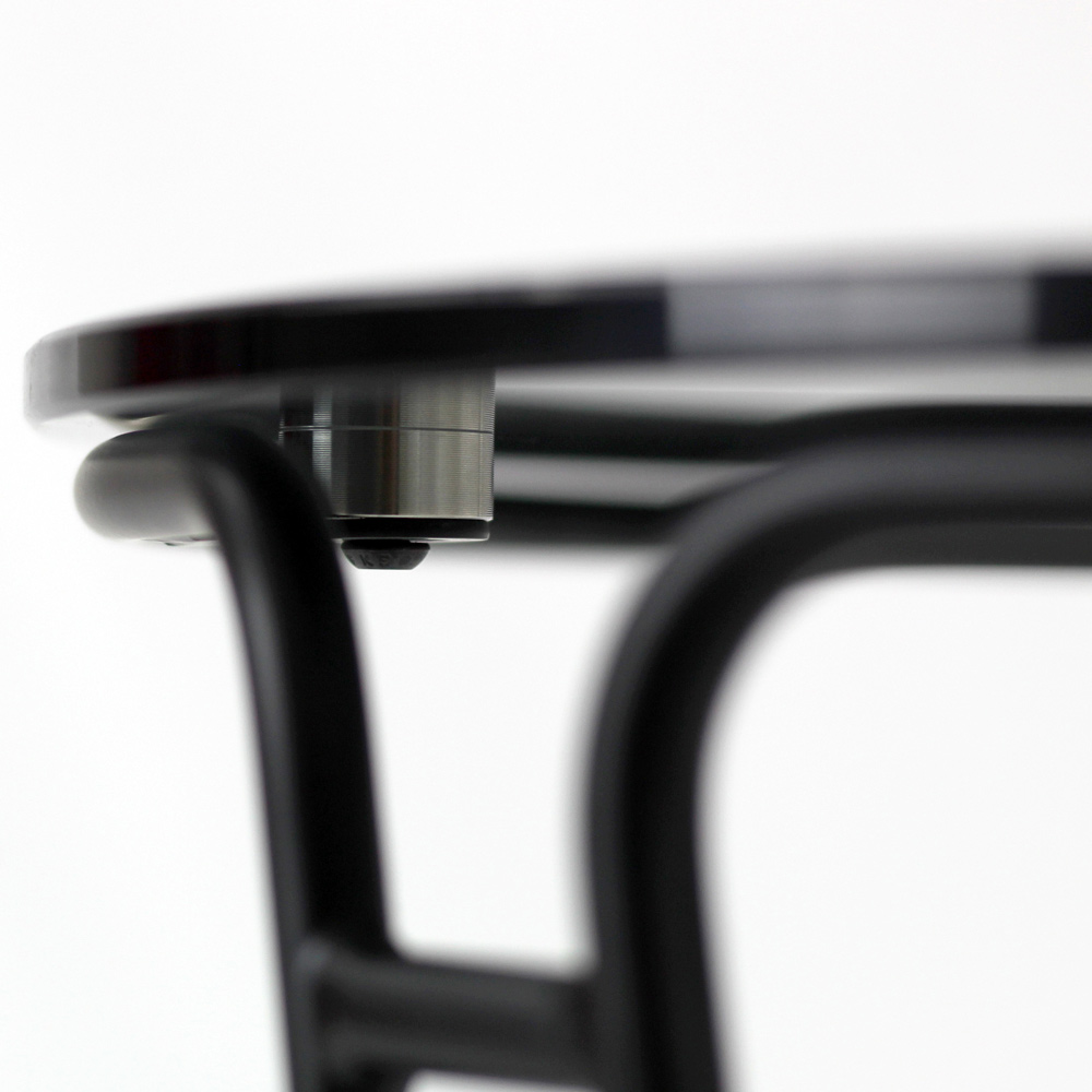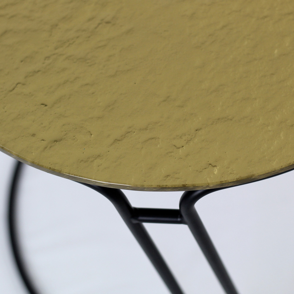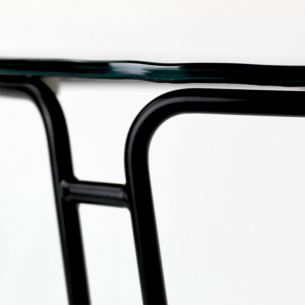 Mesita redonda con base de acero pintado y tapa de cristal.