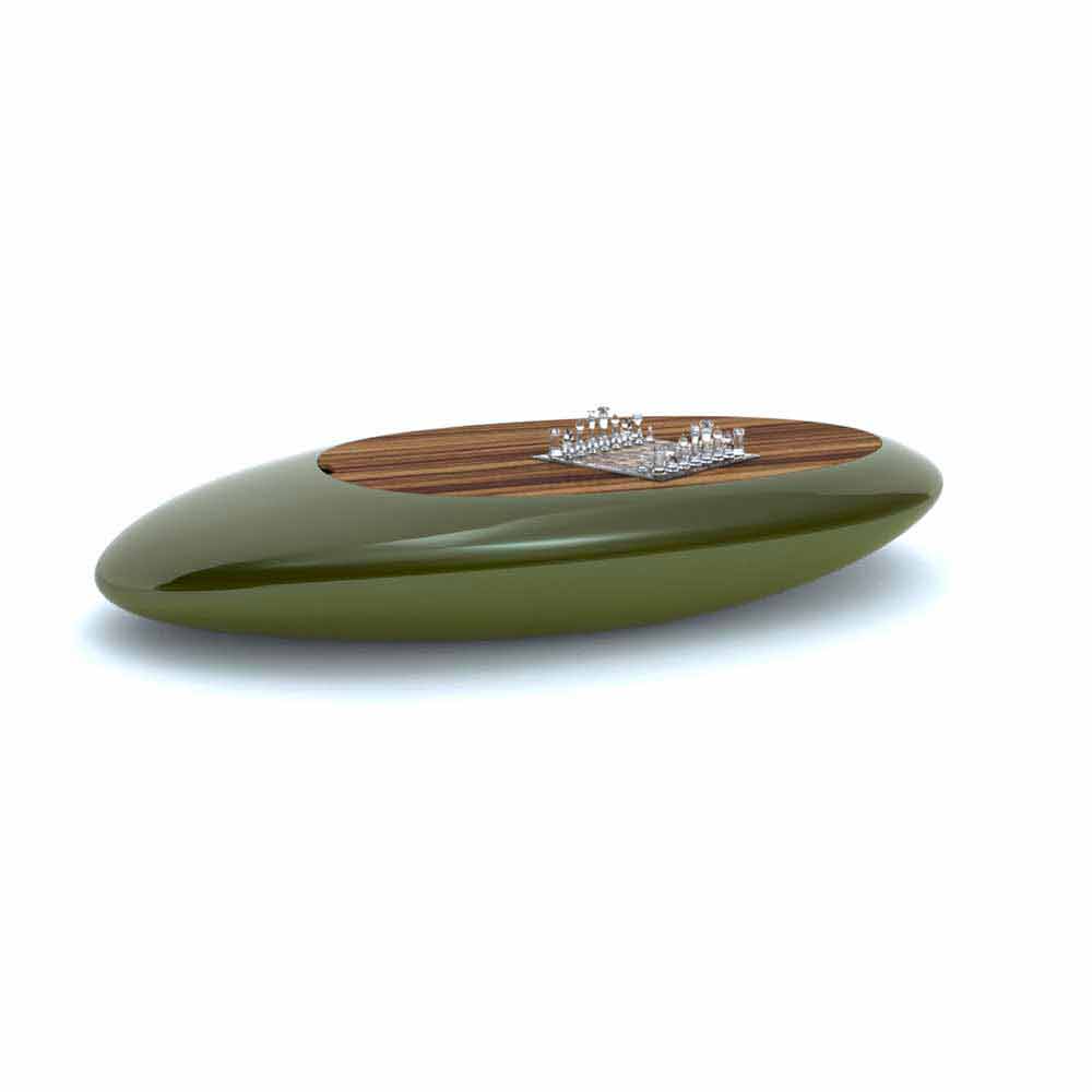 Está concebida de manera que tenga una parte estructural y contenedora al mismo tiempo, y una tapa superior (de madera, vidrio u otro material) apoyada por encastre en la base.