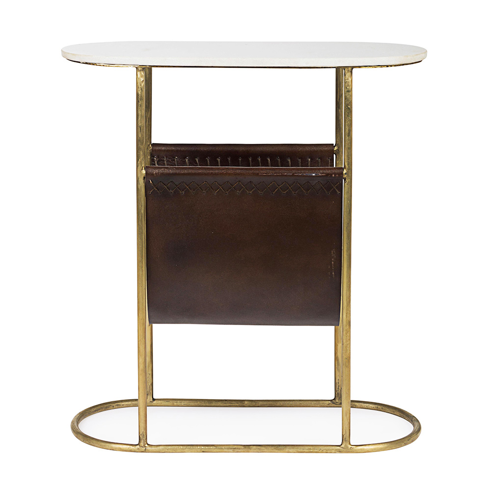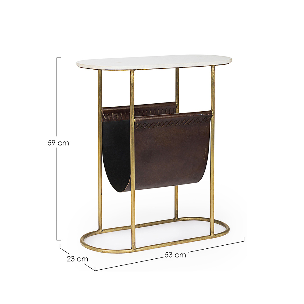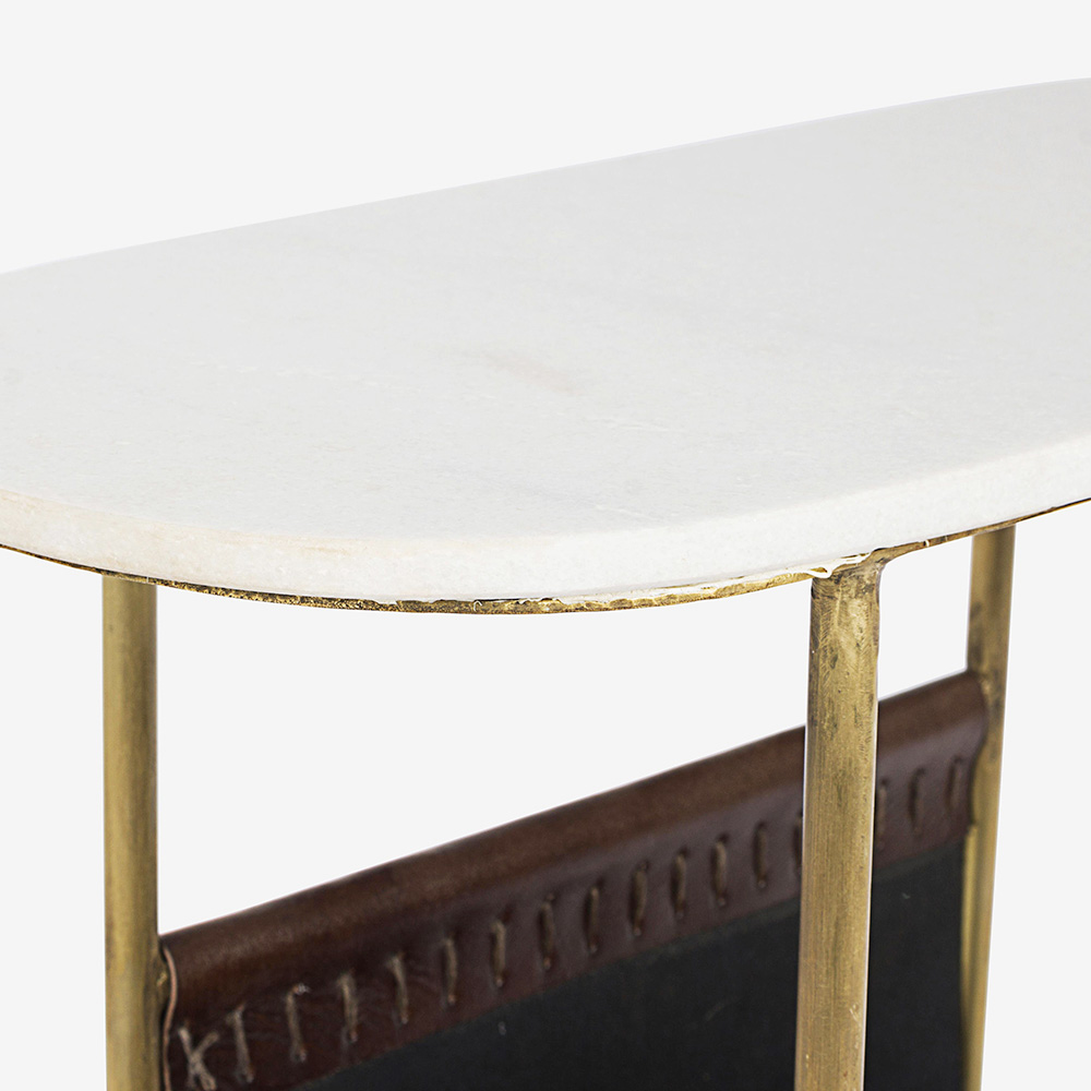 Mesa de centro en acero latón y tapa de mármol con revistero de cuero.