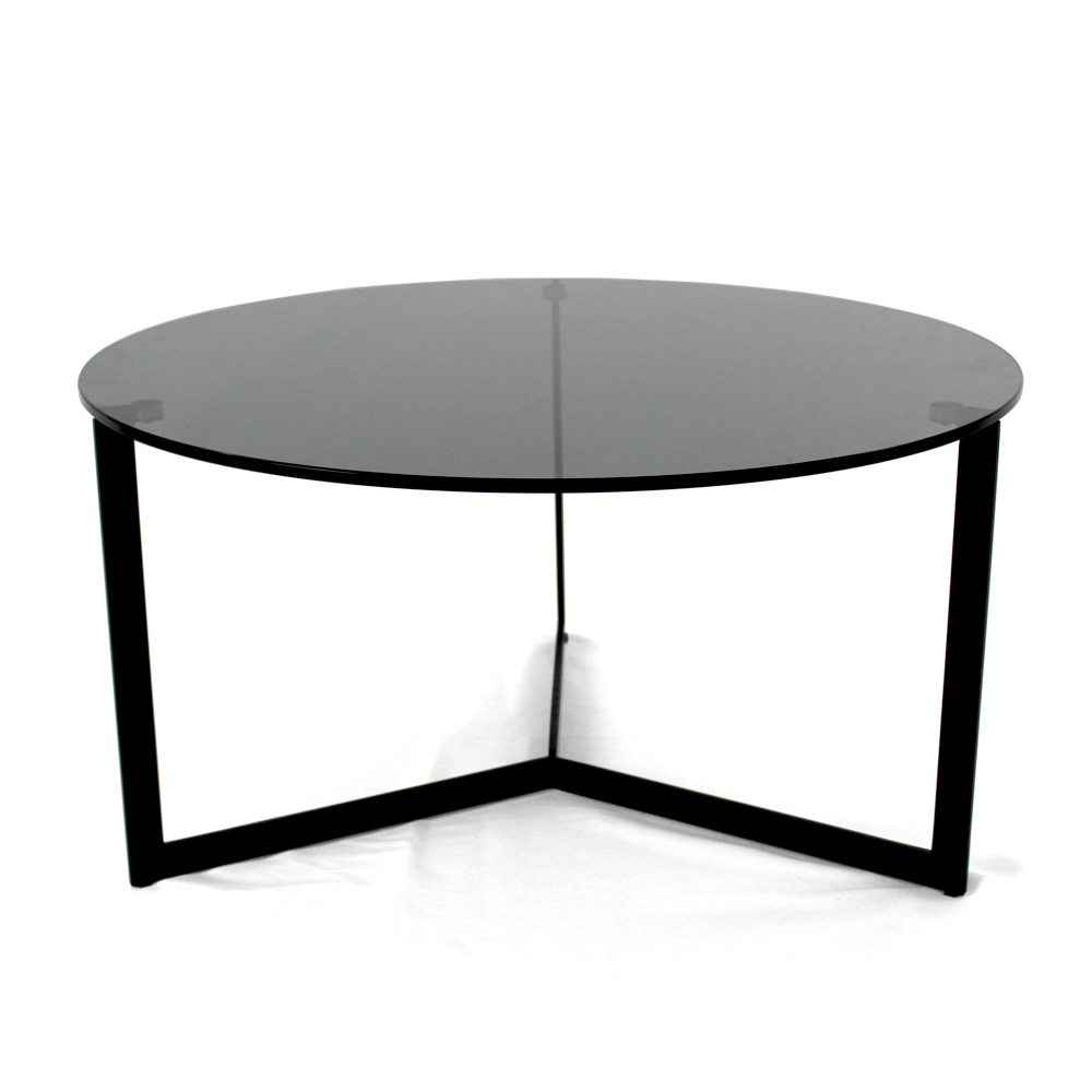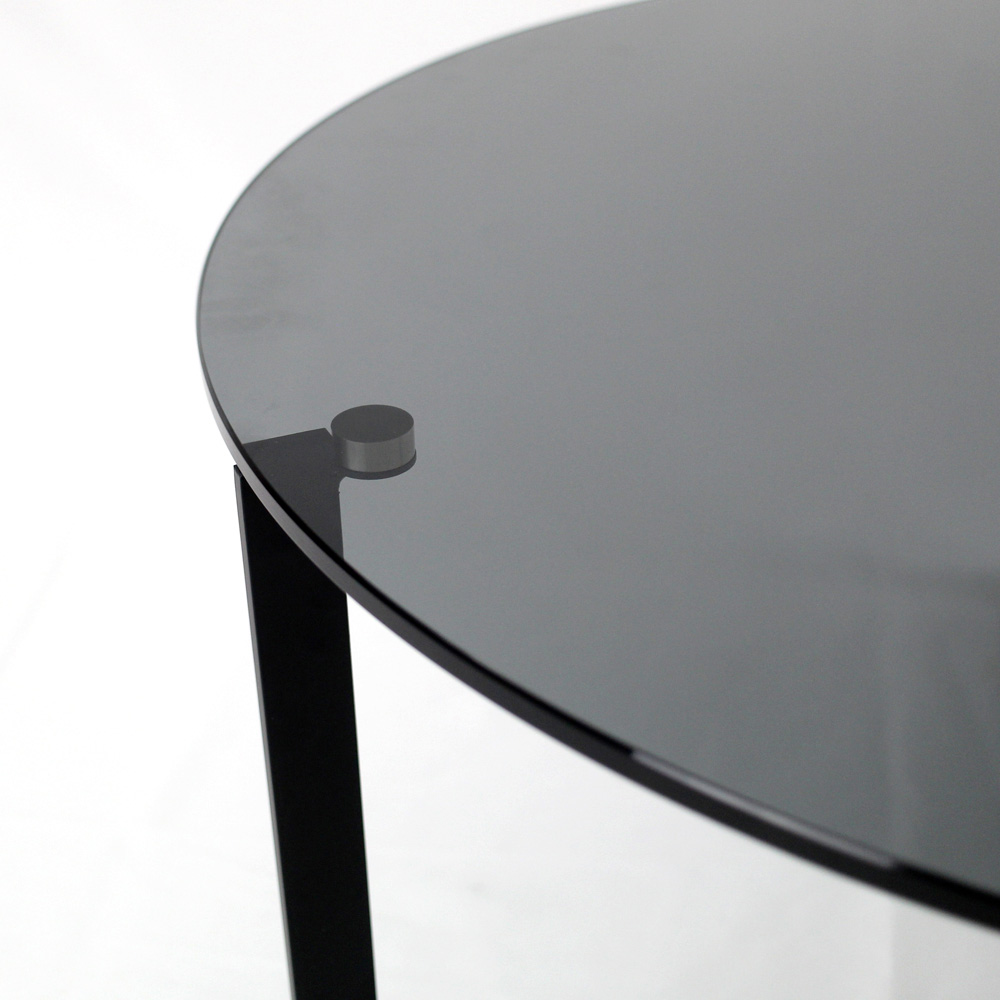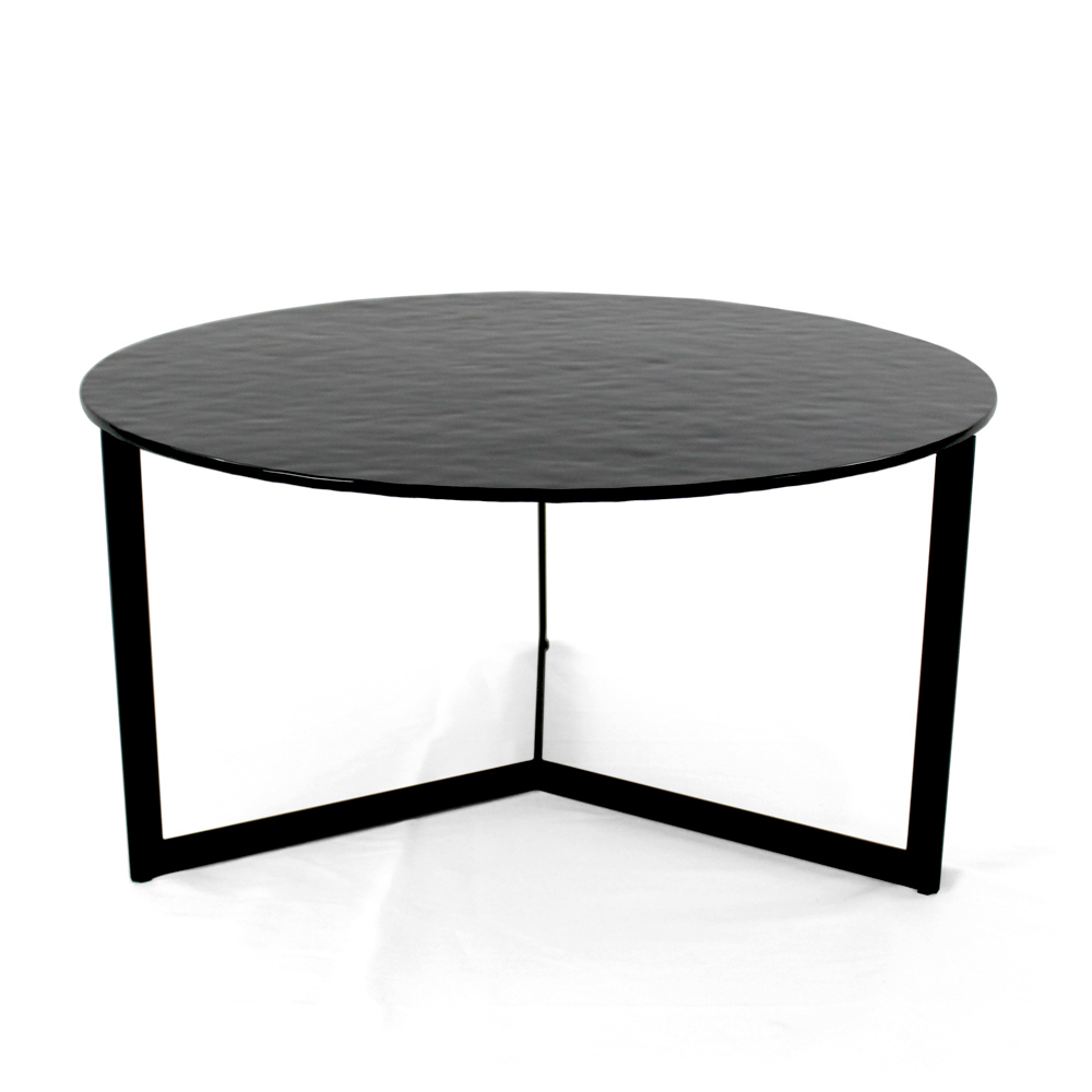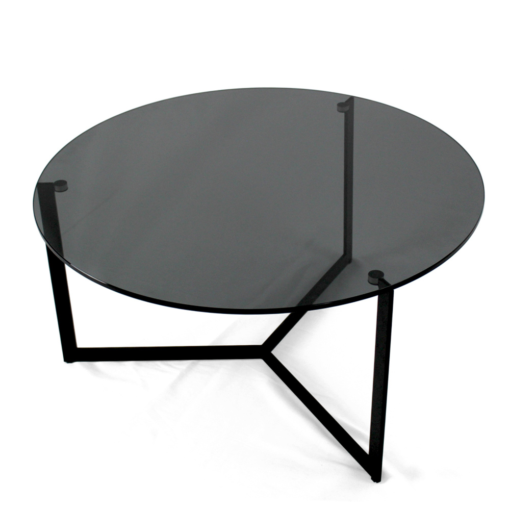 Mesa de centro redonda con base en acero pintado y tapa de cristal.