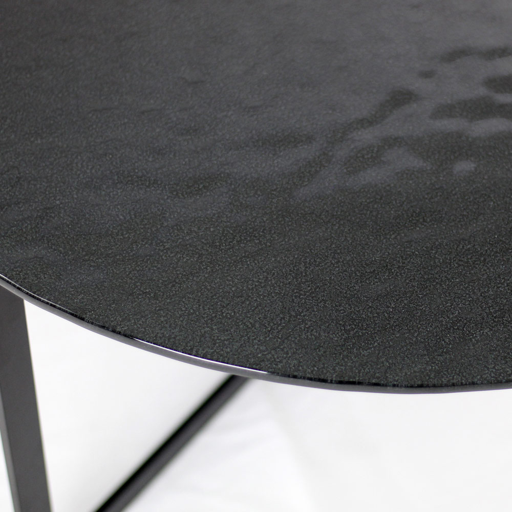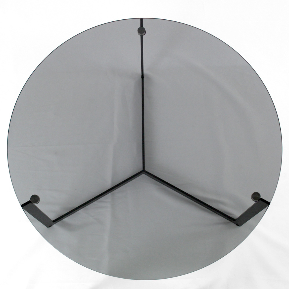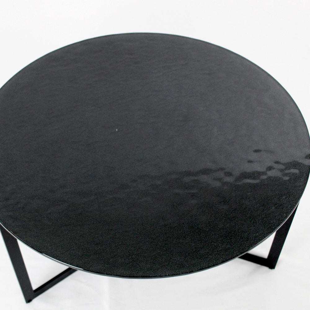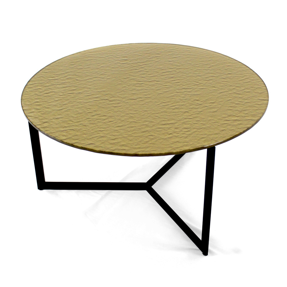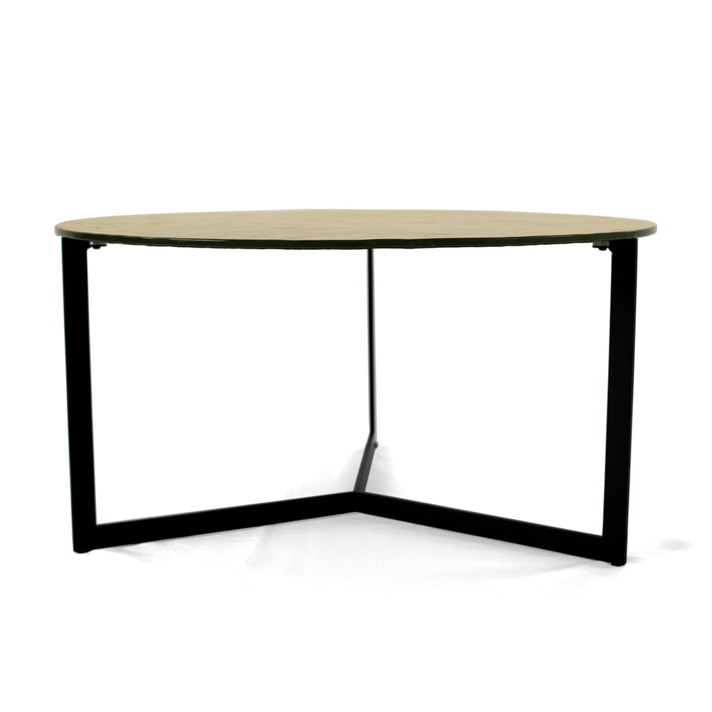 Mesa de centro redonda con base en acero pintado y tapa de cristal.