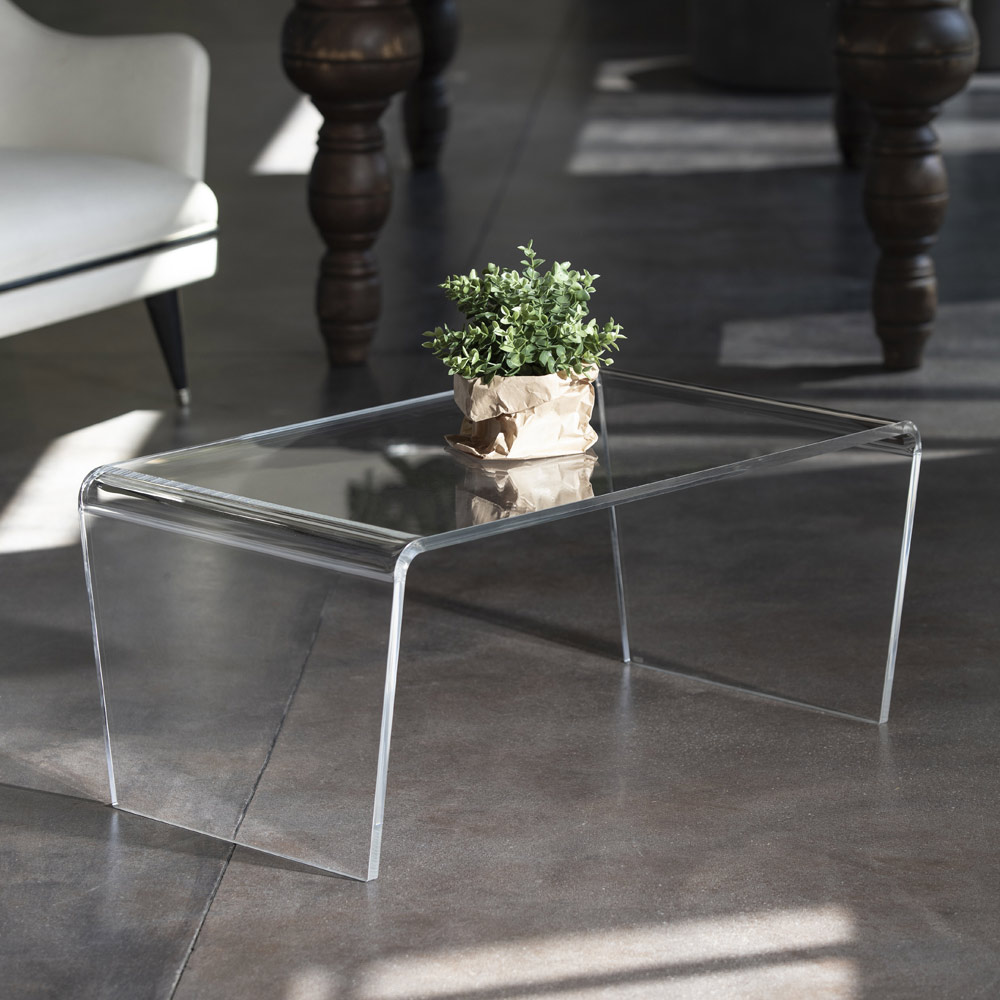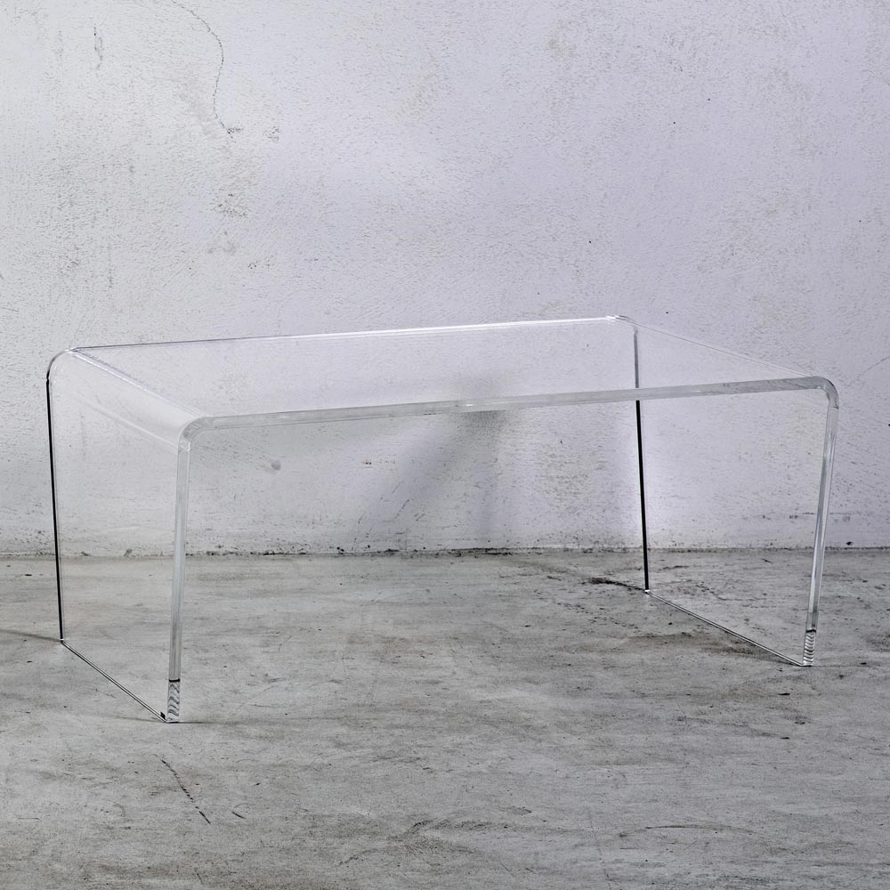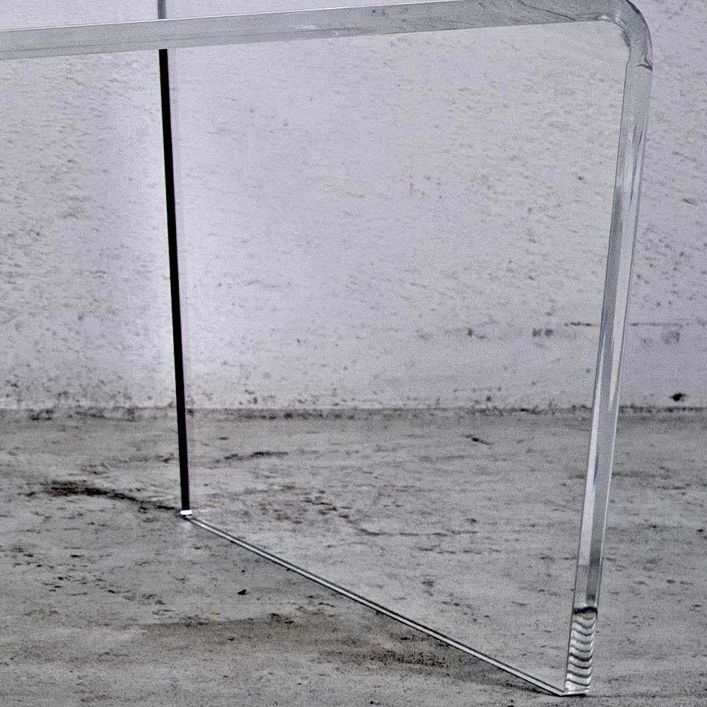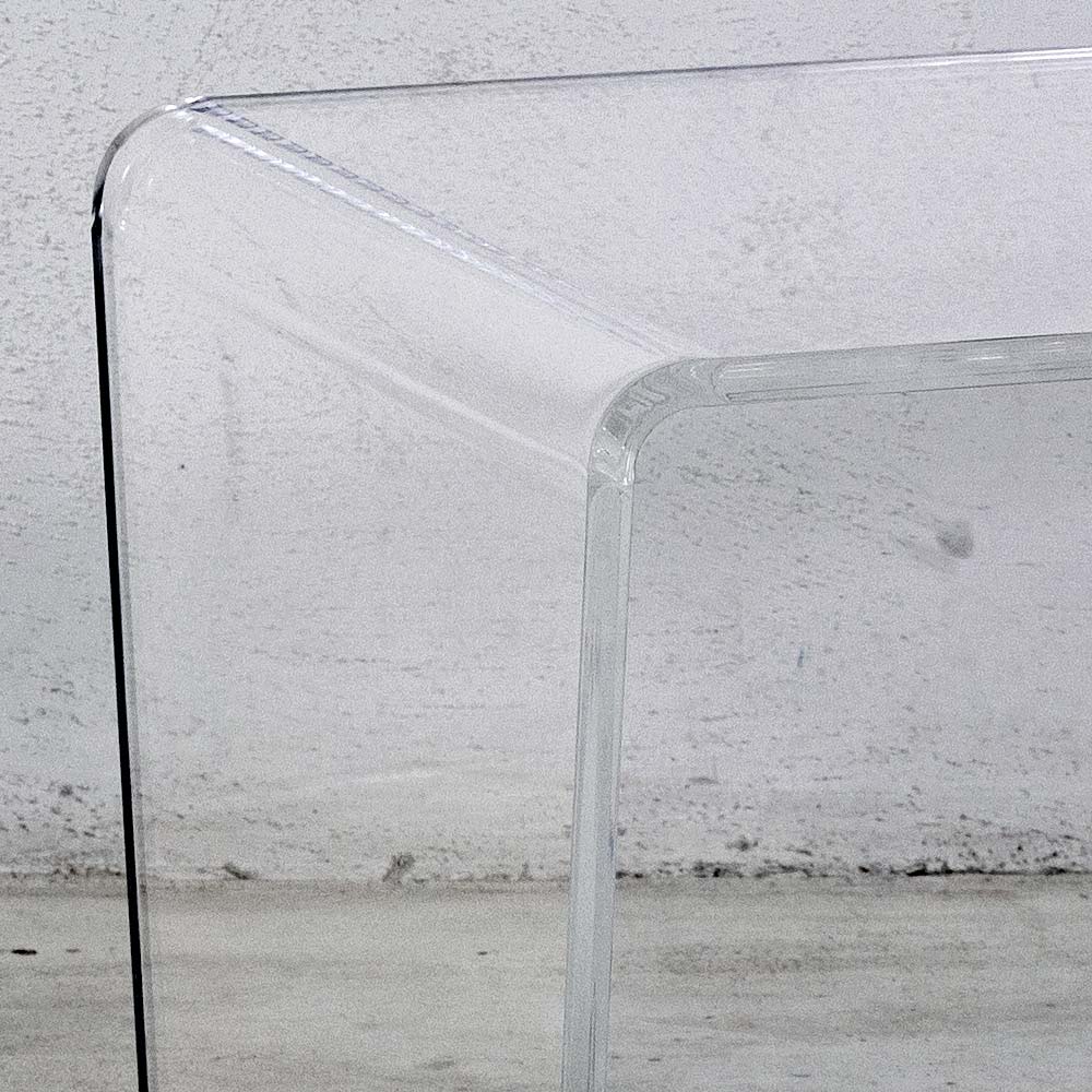 Mesa de centro rectangular en cristal acrílico transparente doblado a mano fabricado en Italia.