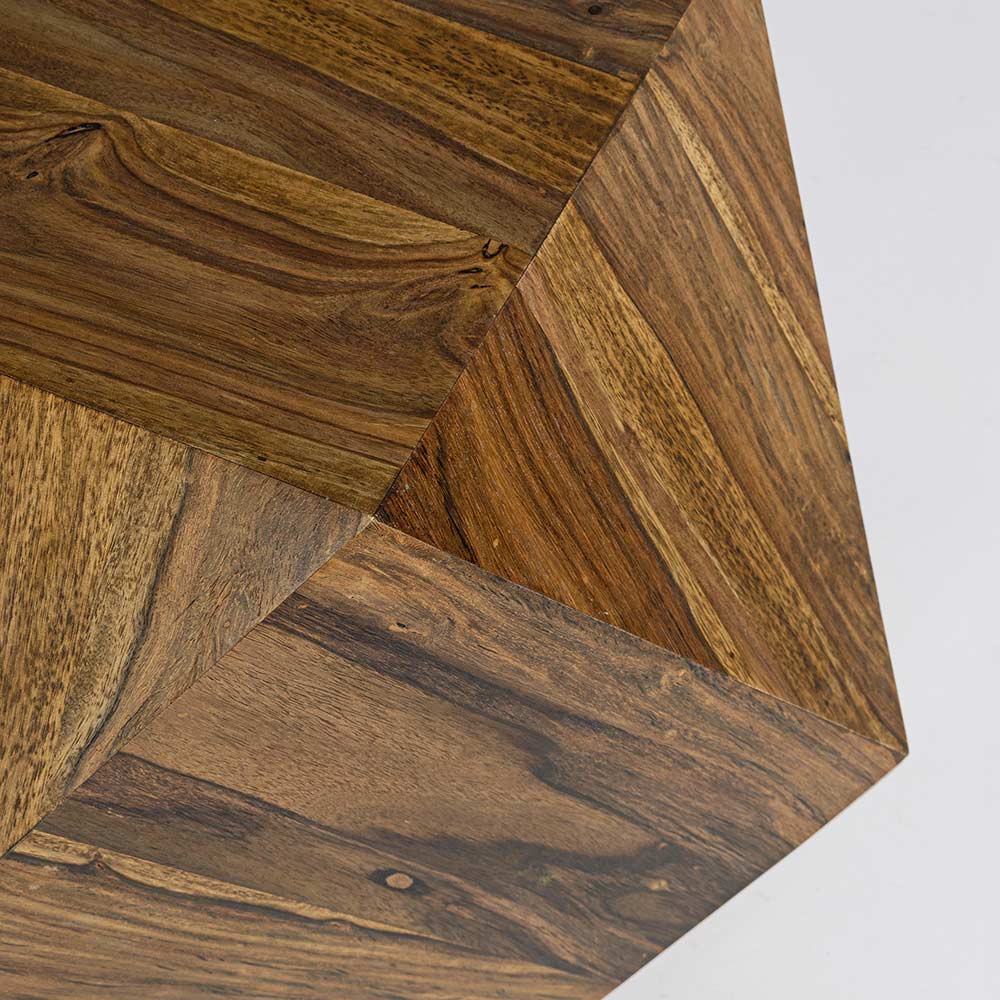Esta mesa de centro dediseño poligonal está realizada íntegramente en madera de sheesham fina con un acabado de barniz de poliuretano.