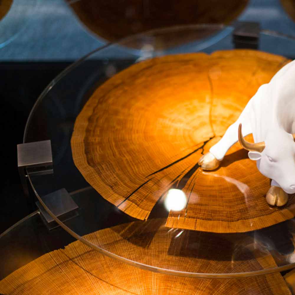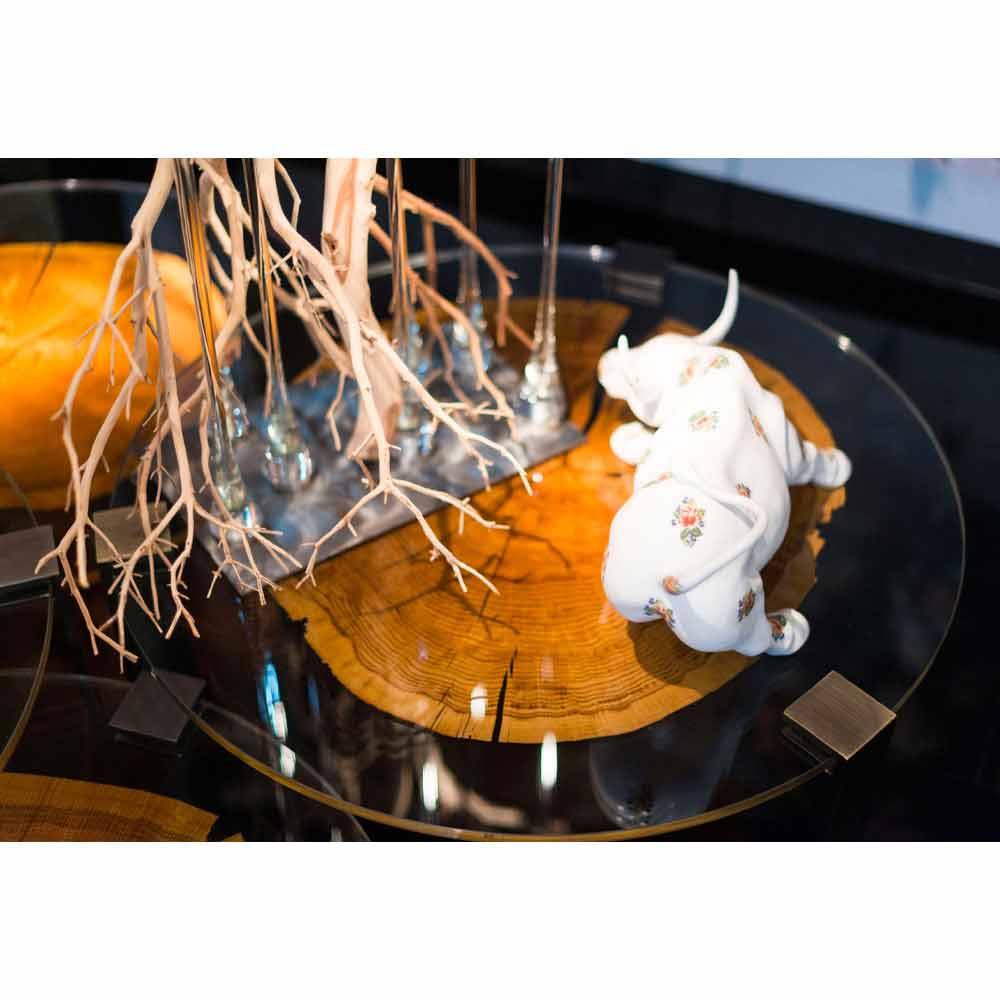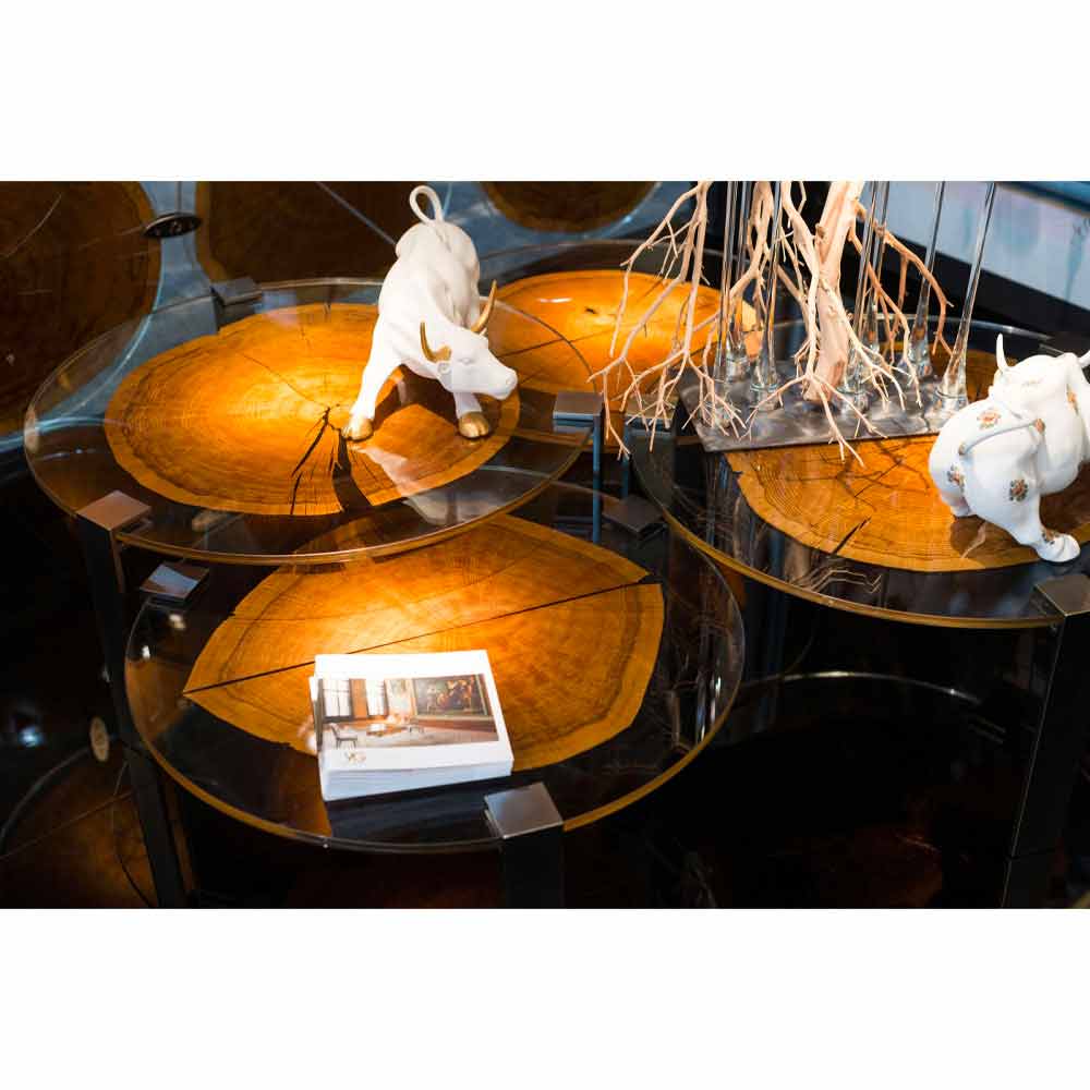 Mesa de centro hecha en Italiacon tablero redondo de vidrio acoplado (5 + 5 mm) en cuyo interior se inserta un delgado trozo de madera cortada , sostenida por 3 patas metálicas con acabado en latón bruñido . De la combinación exclusiva del toque refinado del vidrio, los maravillosos colores de la madera y la estética moderna del metal, nace una solución de decoración única que basa su idea en conceptos de innovación y elegancia para un resultado vanguardista con una fuerte personalidad. contemporánea . Su fuerza está representada por la combinación perfecta de acabados y materiales que aumentan el valor de la mesa de café sin descuidar nunca el aspecto funcional fundamental subrayado por la mano de obra 100% Made in Italy y el uso de materias primas de calidad, lo que permite ofrecer un accesorio de decoración. con una belleza revolucionaria y al mismo tiempo particularmente sólida y resistente .