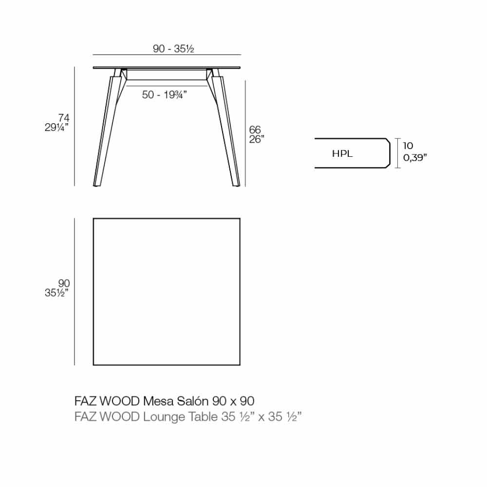 Mesa de centro con patas en madera de fresno claro u oscuro y tapa de hpl en varios acabados y 2 medidas cuadradas.