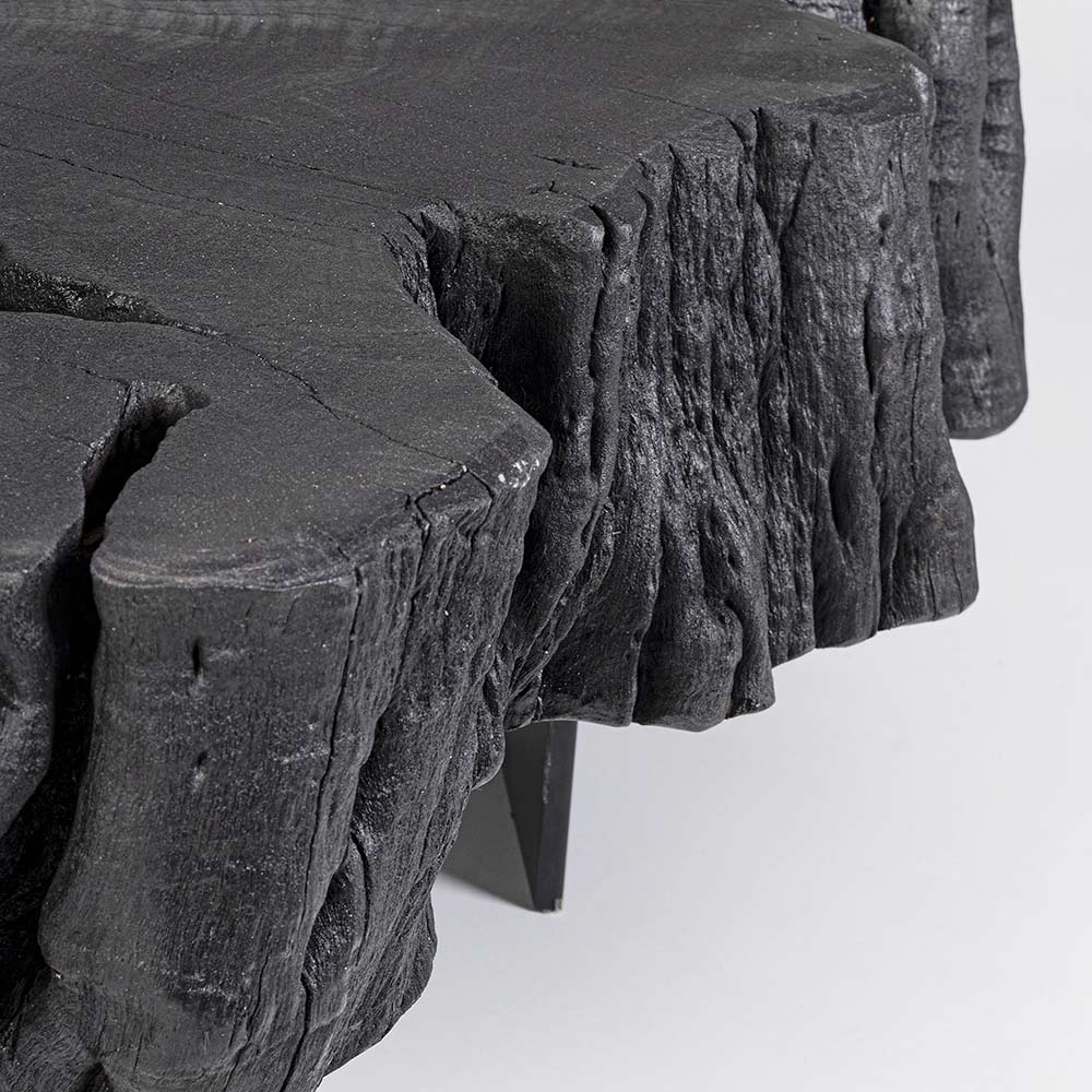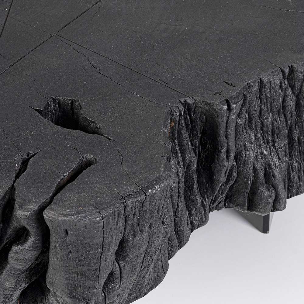 Mesa baja para el salón en acero y baúl de madera de acacia negra.