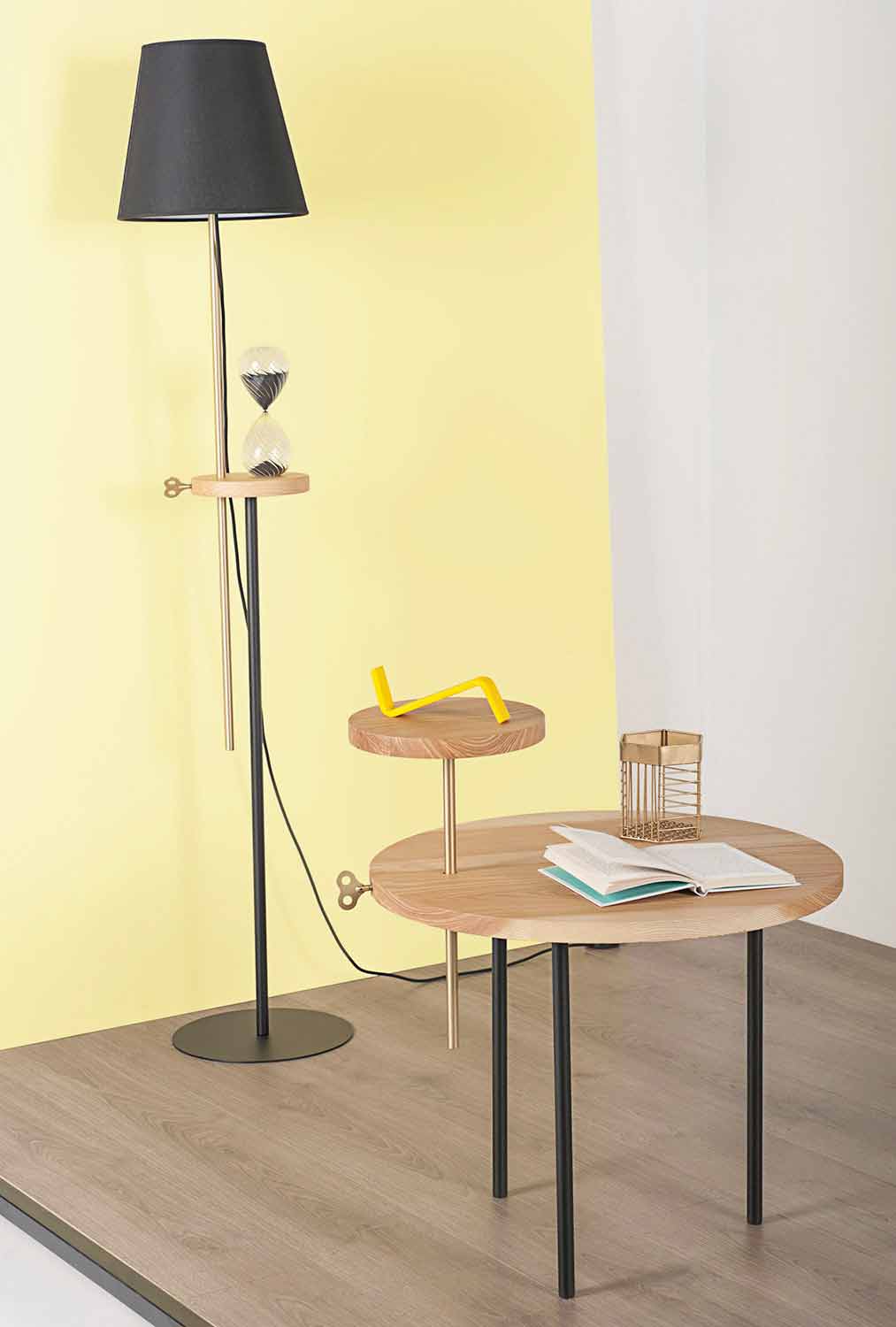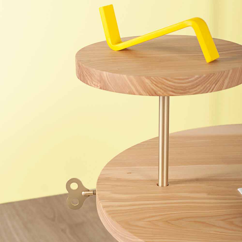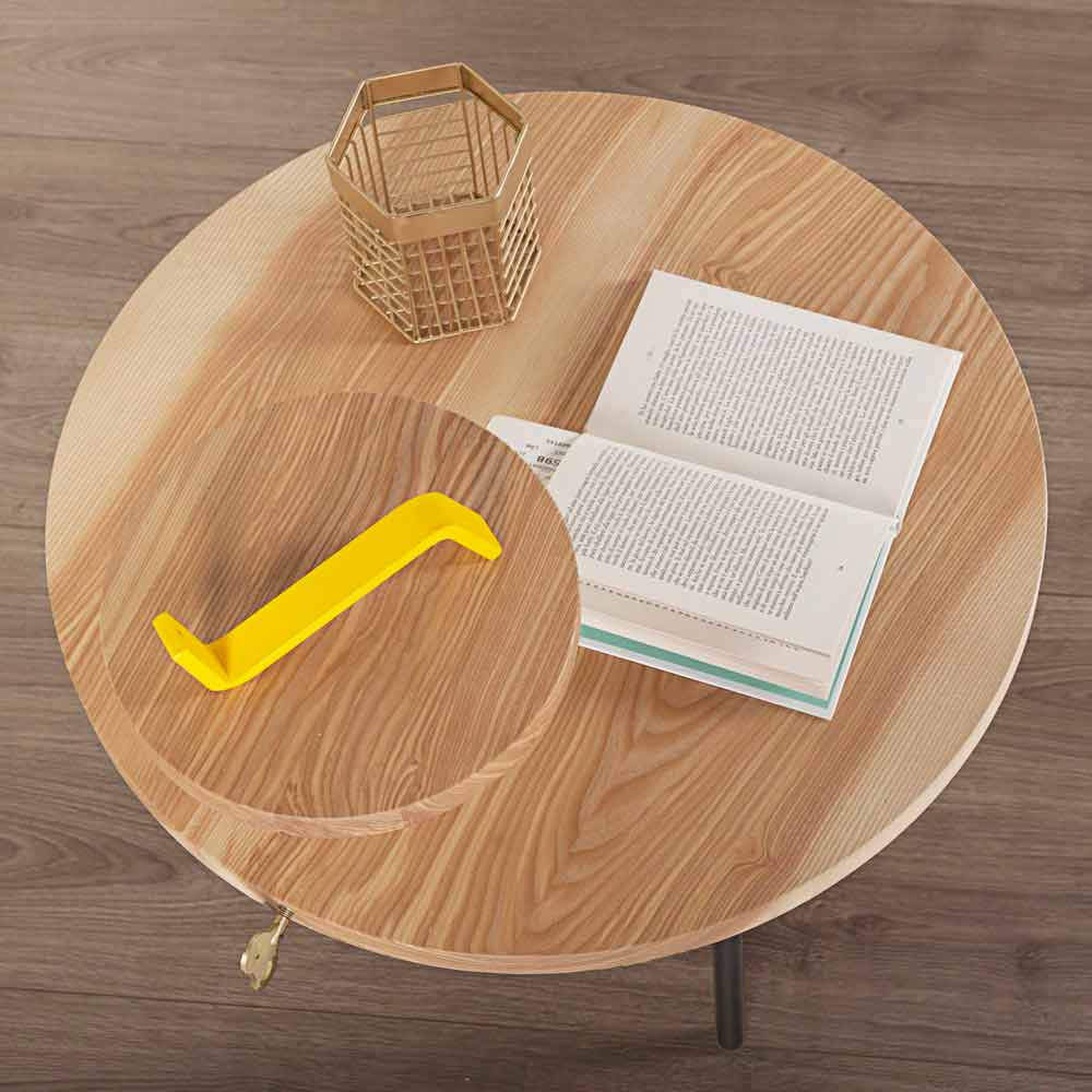La mesa de centro representa el elemento fundamental en cualquier salón ya que capta todas las miradas. Precisamente por esta razón debe elegirse cuidadosamente teniendo en cuenta los espacios disponibles y el estilo de mobiliario circundante. Esta mesa de centro se adapta perfectamente a cualquier ambiente con un diseño moderno e innovador, combinando a la perfección funcionalidad y belleza. Fabricado íntegramente en Italia , el producto está compuesto por una tapa redonda de fresno con un diámetro de 60 cm y una base de acero pintado RAL . Lo que caracteriza especialmente a la mesa de centro es, sin duda, la presencia de una pequeña encimera redonda de fresno colocada sobre la encimera principal que, según las diferentes necesidades, se puede colocar a diferentes alturas gracias al inserto de latón . También tiene una llave colocada en el borde también en latón que le da elegancia y personalidad al producto.