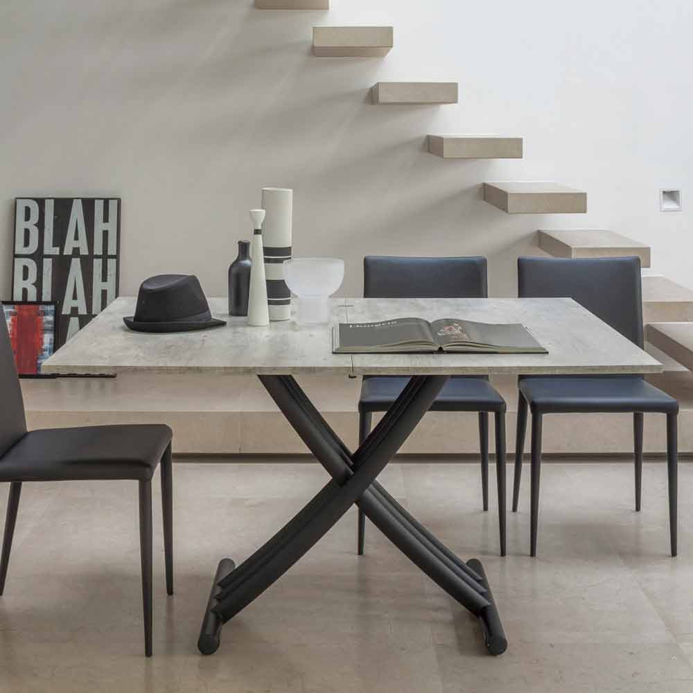 La mesa de centro transformable en mesa de comedor se caracteriza por la posibilidad de regular la altura de 22 cm a 77 cm gracias a un mecanismo de gas . También está equipado con una tapa plegable tipo libro y ruedas retráctiles.