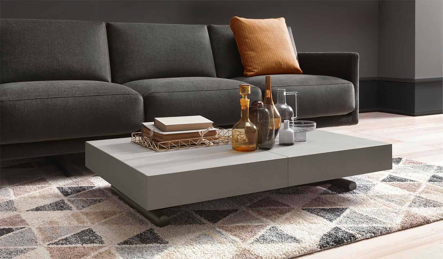 mesa de centro transformable se caracteriza por líneas refinadas y minimalistas capaces de decorar sus ambientes domésticos y contract con elegancia y practicidad.