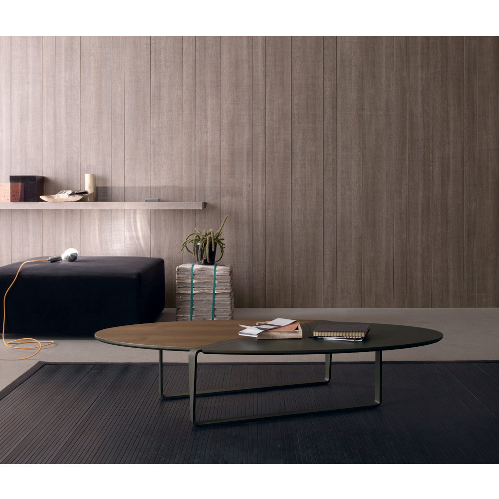 Mesa de centro ovalada en metal y tapa de madera bicolor fabricada en Italia.