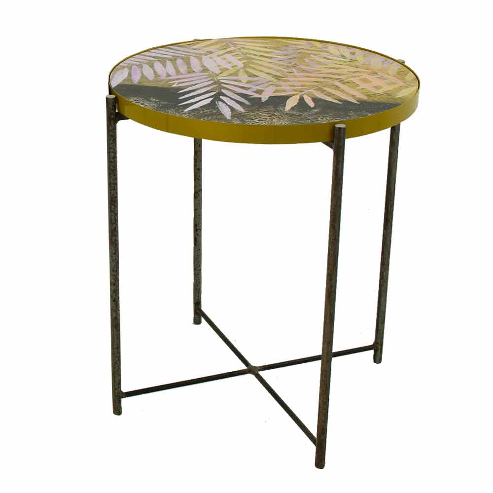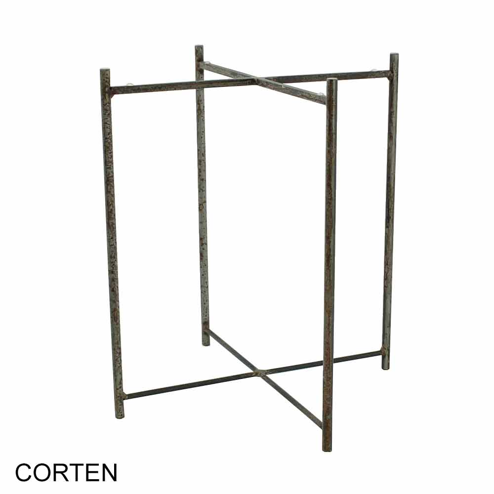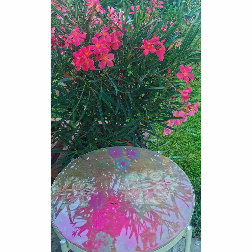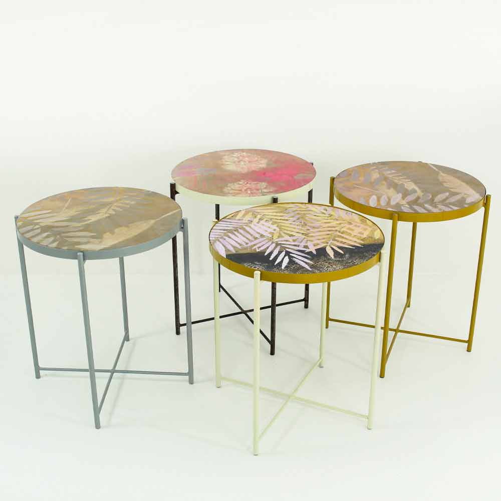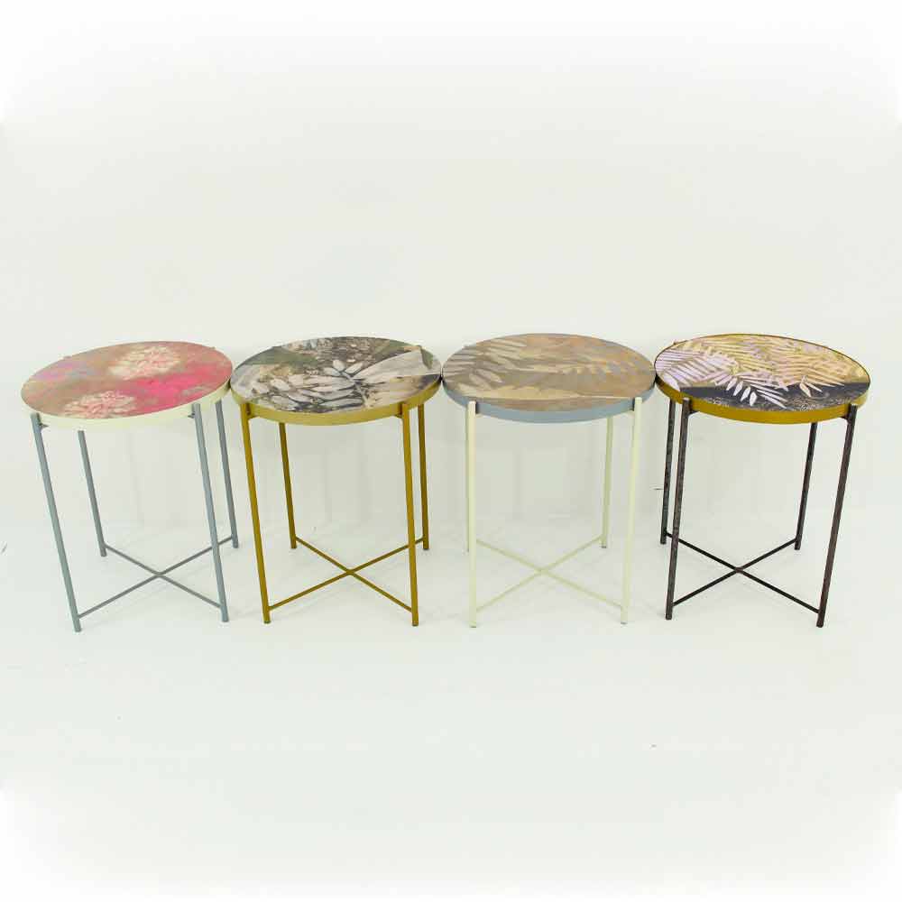 Su estructura está íntegramente realizada en metal pintado en polvo lo que hace que el producto sea perfecto para su uso en interiores pero también en exteriores para amueblar jardines y terrazas con gusto y estilo, mientras que la encimera está decorada a mano y con efecto resina lisa nivelada brillante vitrificada disponible en 6 acabados diferentes y se inserta y recubre lateralmente en una bandeja metálica. La encimera es lo que caracteriza a este artículo ya que tiene la posibilidad de ser extraído para ser intercambiado tan fácilmente con las otras encimeras disponibles permitiendo obtener más tablas diferentes gracias a una sola base.