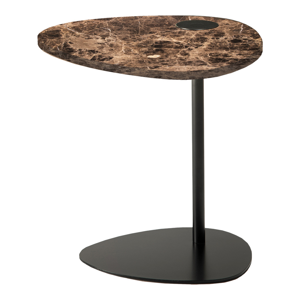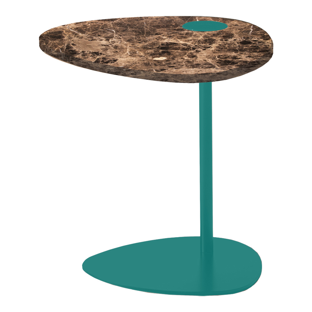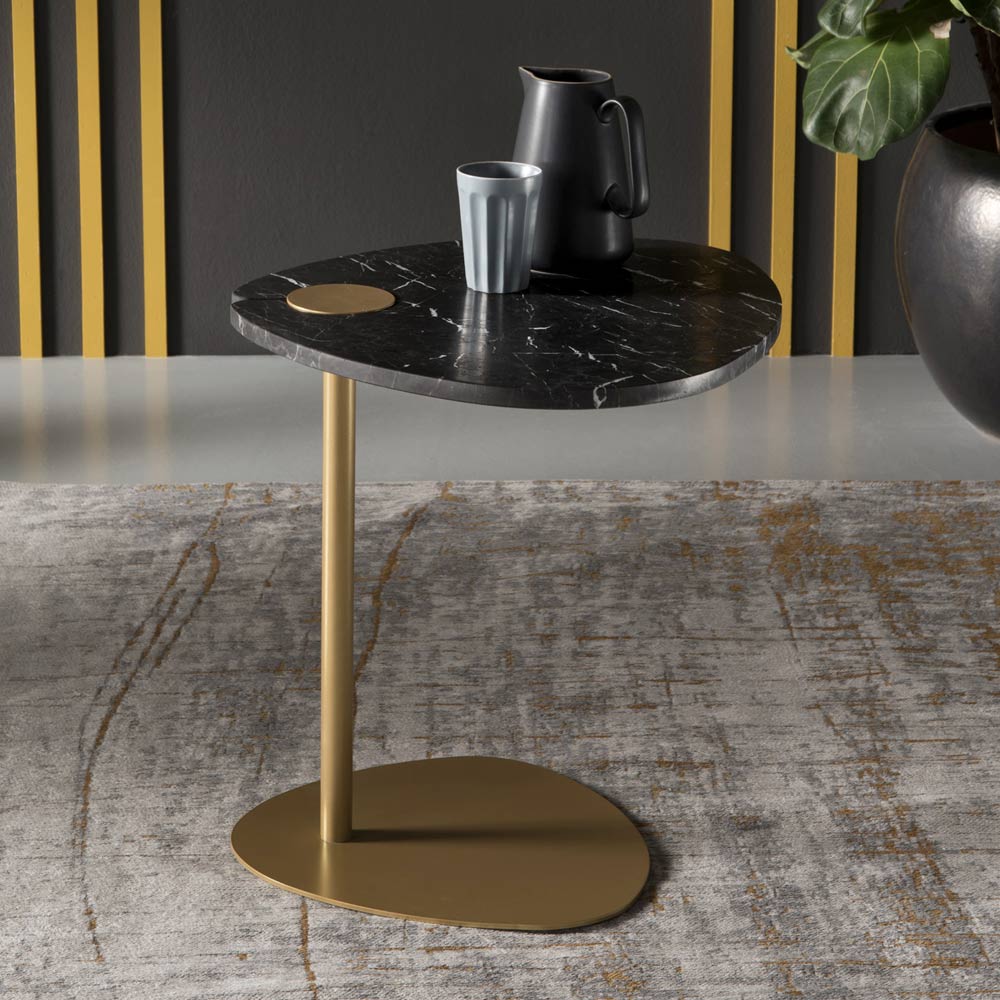 Esta mesita de sofá para el salón está inspirada en las formas irregulares y naturales de los guijarros alisados por el agua. Las particulares e interesantes líneas se diferencian para realzar la estancia y darle un toque de refinamiento. Su original y elegante diseño está compuesto por diferentes materiales pero que se comunican entre sí en una armoniosa ligereza: el fino pero resistente metal de la estructura sostiene la encimera de mármol.