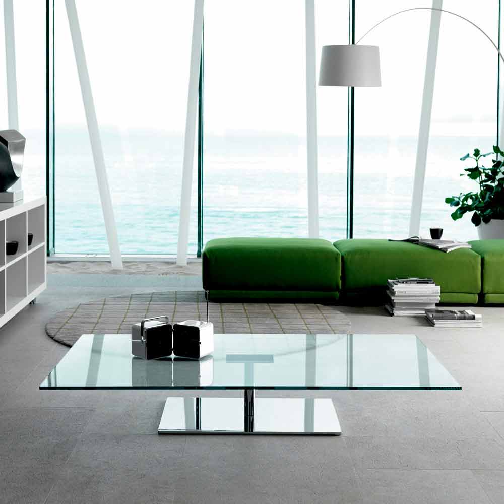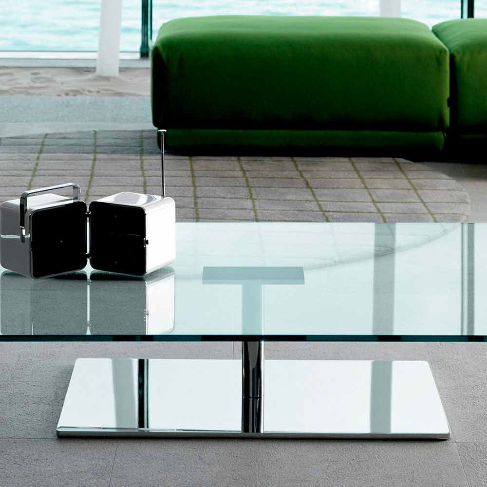Esta mesita baja para salón de diseño rectangular se caracteriza por la tapa realizada íntegramente en cristal y una base de soporte de metal en acabado cromado o bronce que crea maravillosos efectos luminosos y tridimensionales.