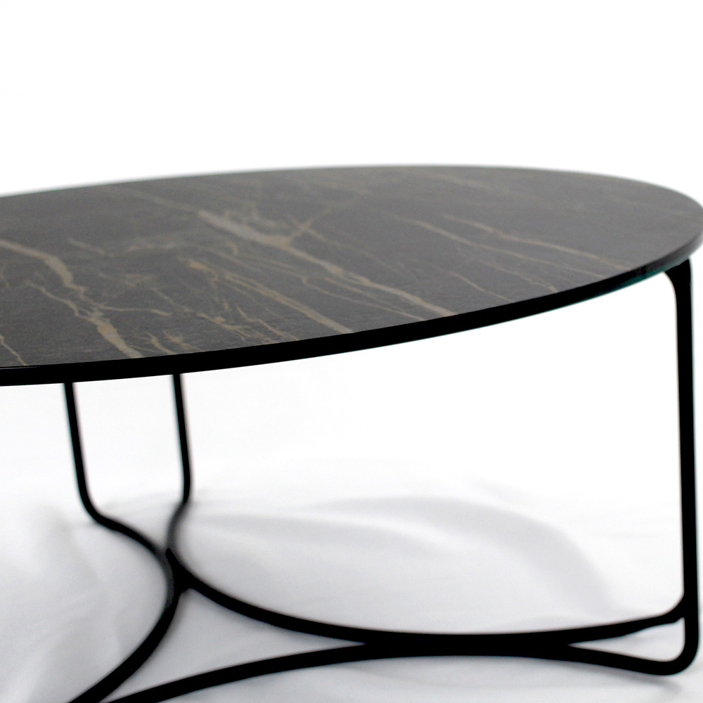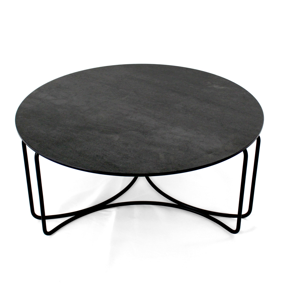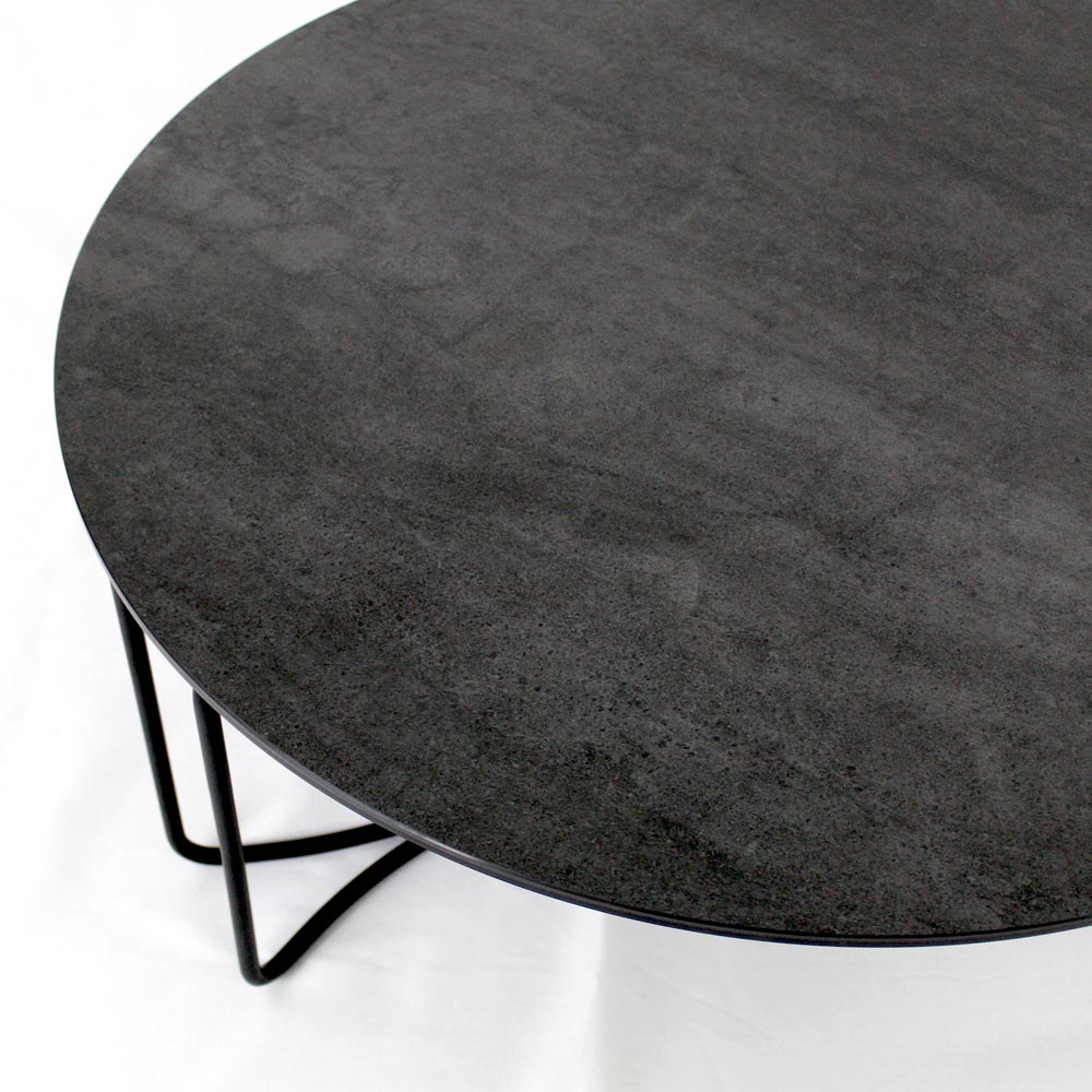 Mesita redonda con base de acero pintado y encimera de gres porcelánico.