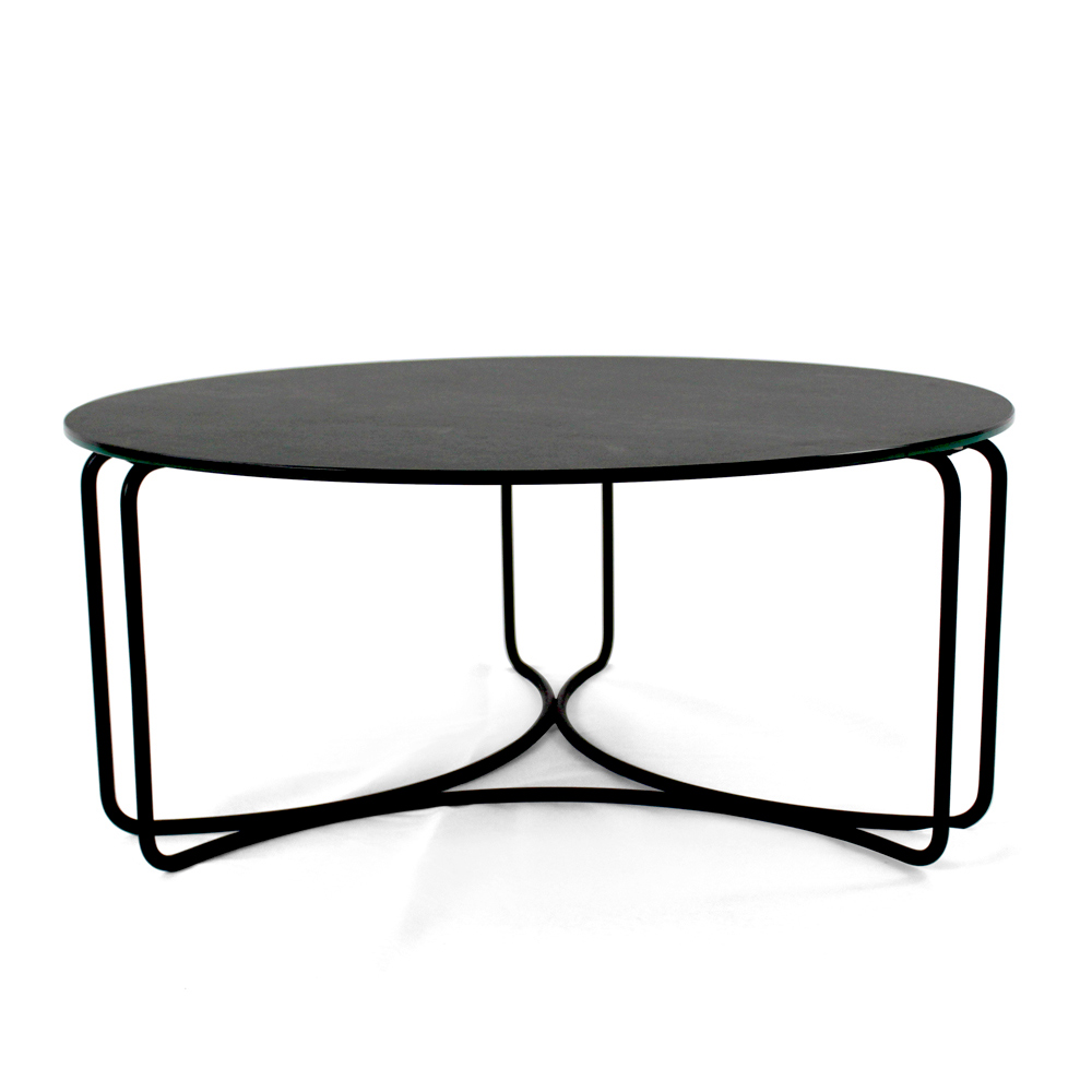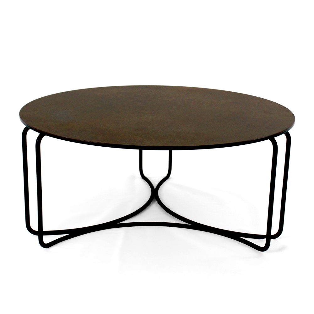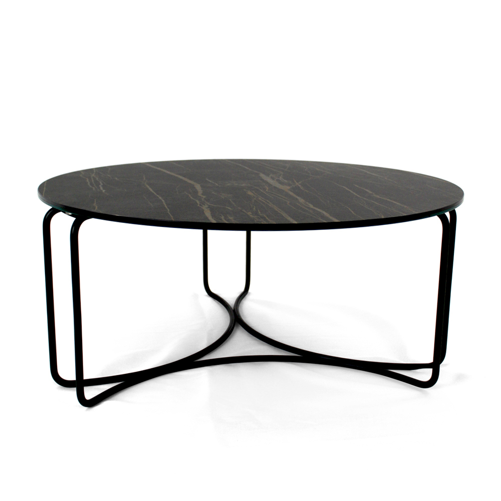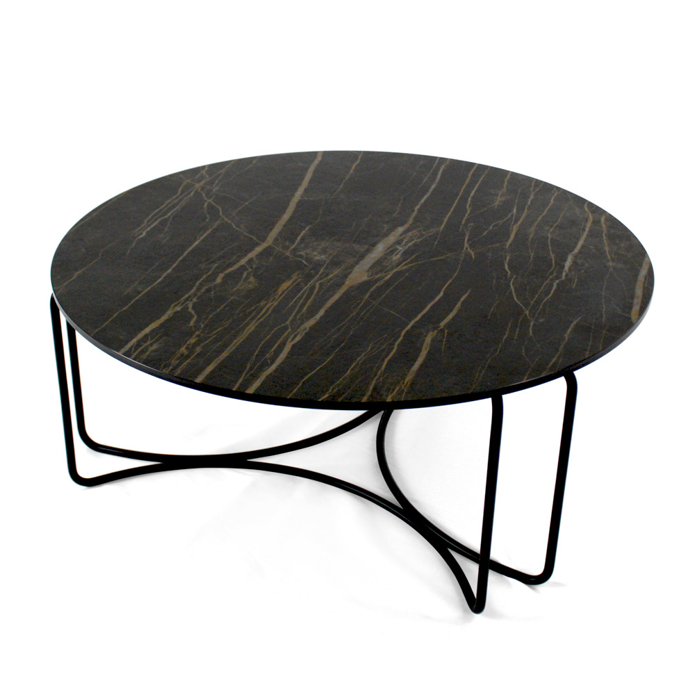 Mesita redonda con base de acero pintado y encimera de gres porcelánico.