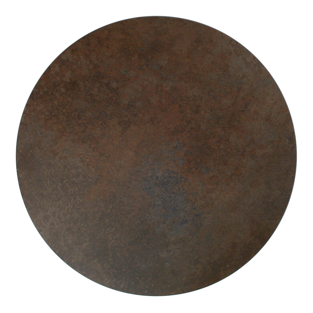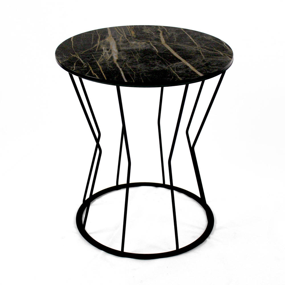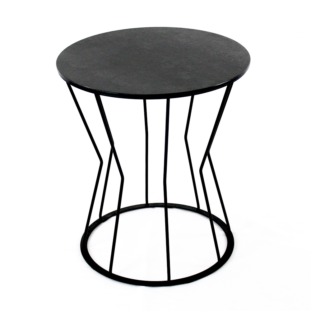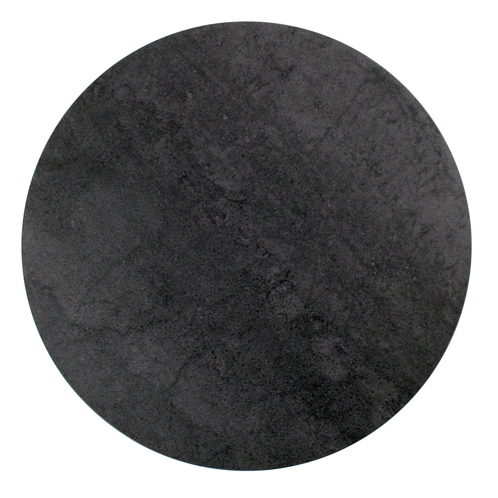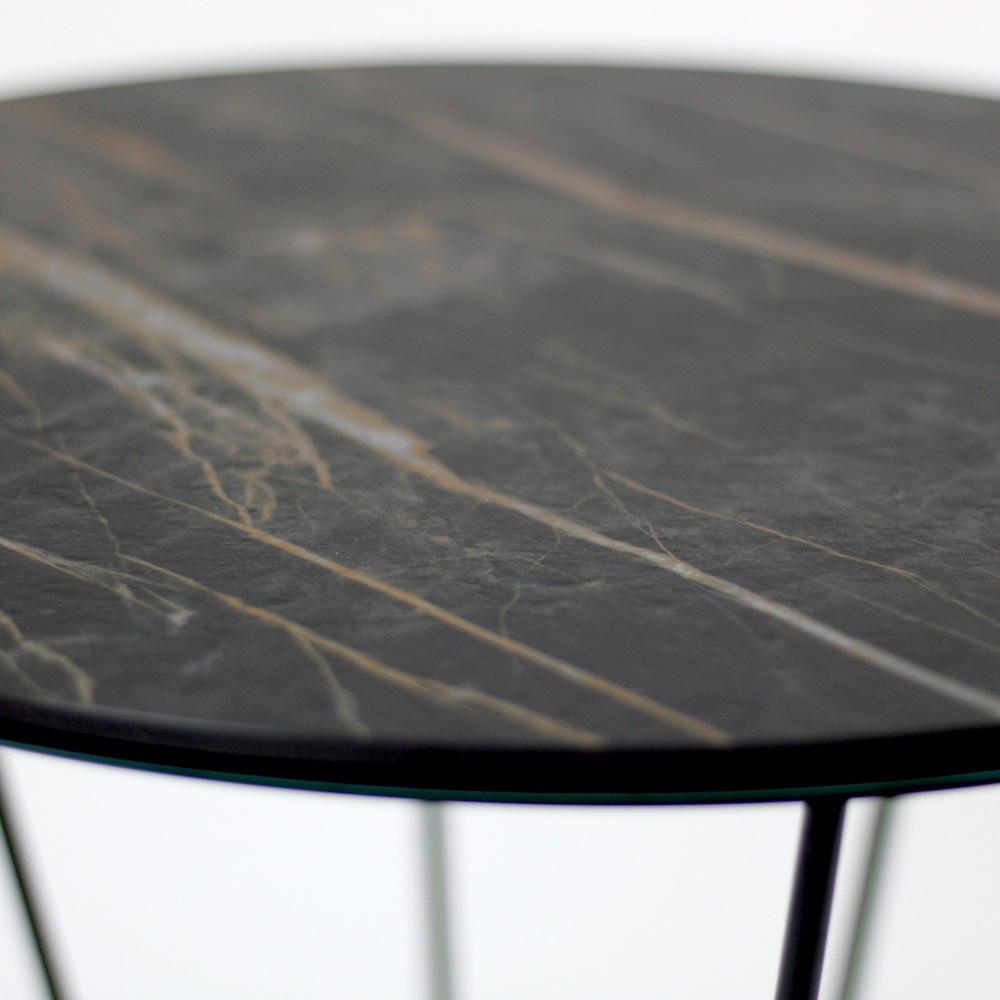 Mesita redonda con base de acero pintado y encimera de gres porcelánico.