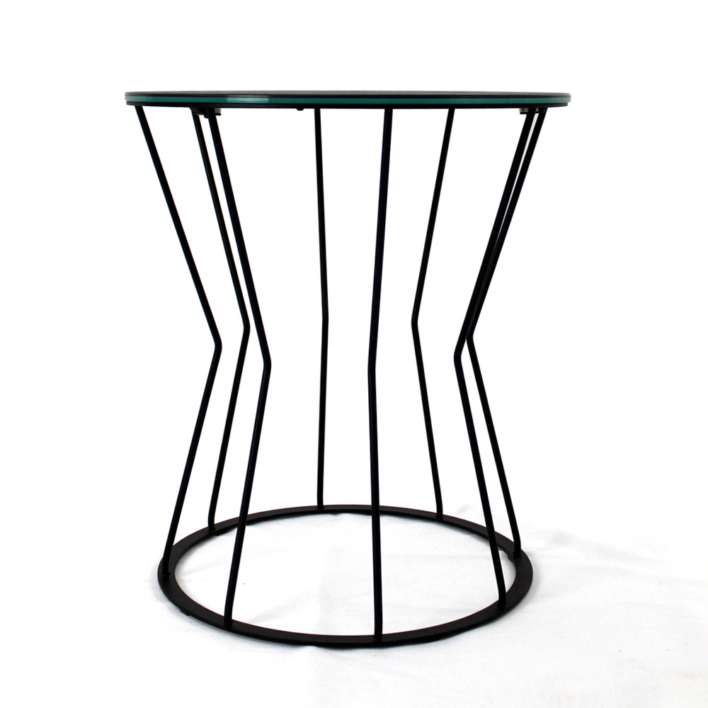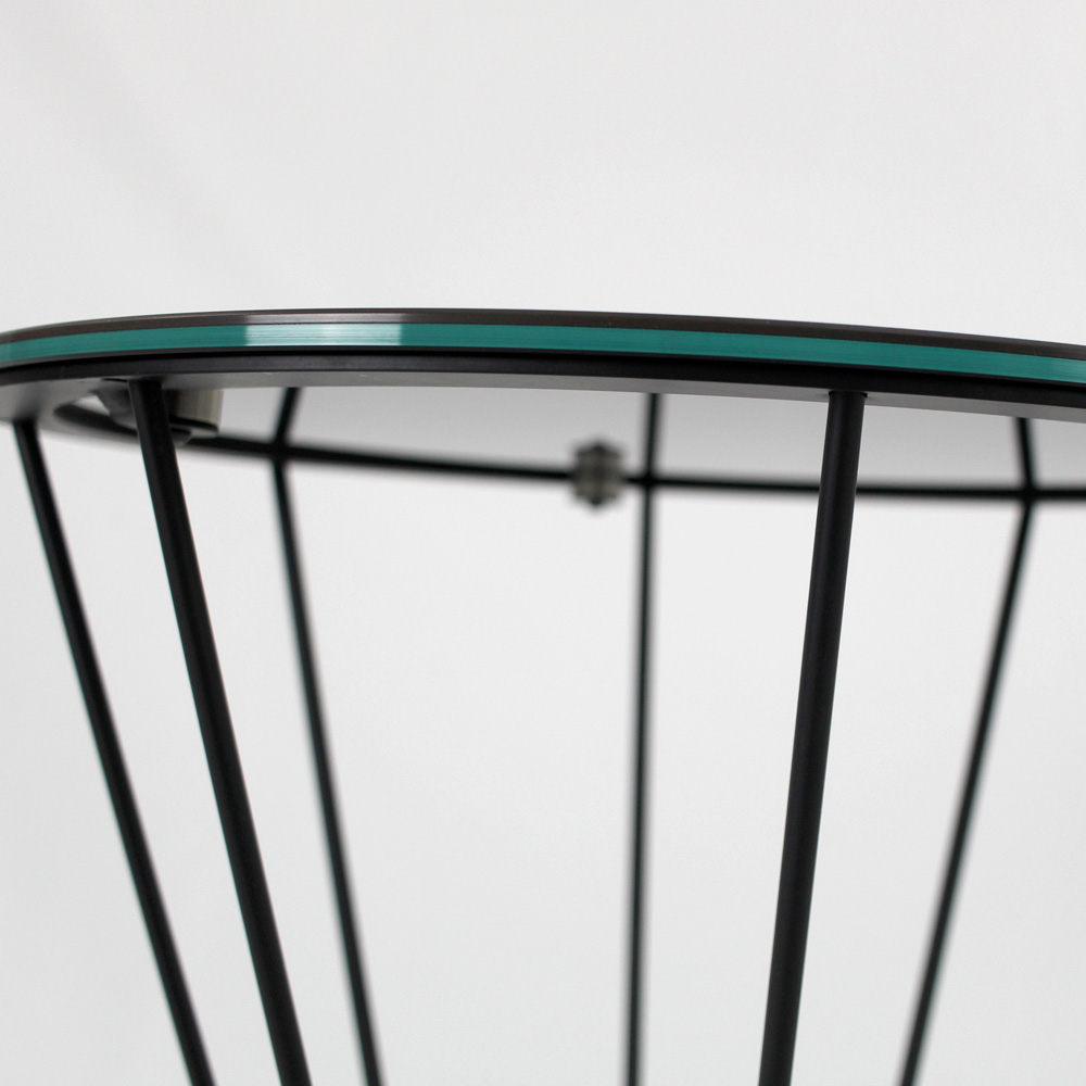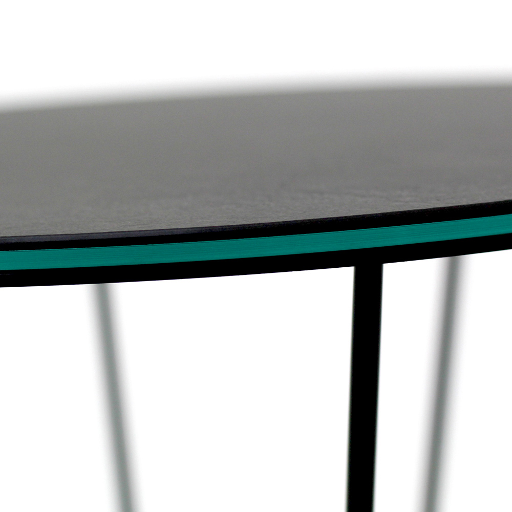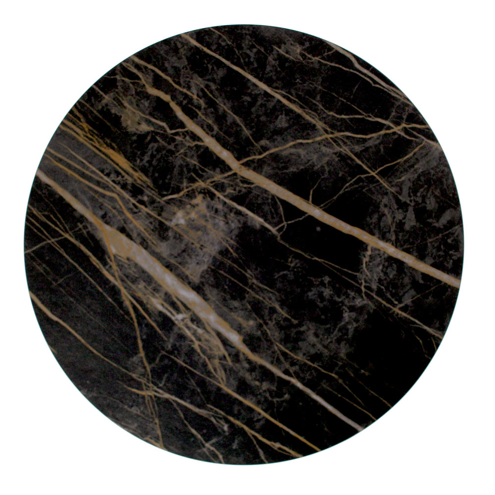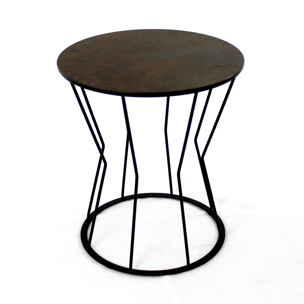 Mesita redonda con base de acero pintado y encimera de gres porcelánico.