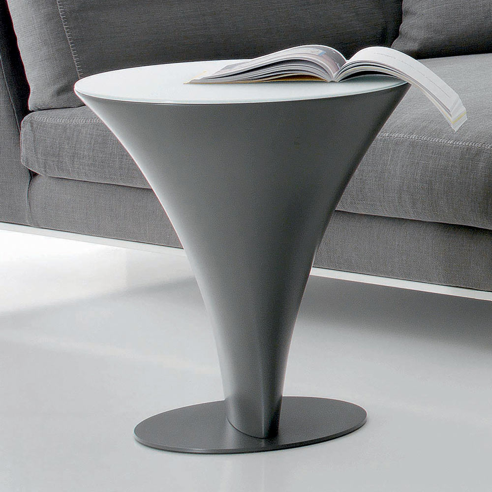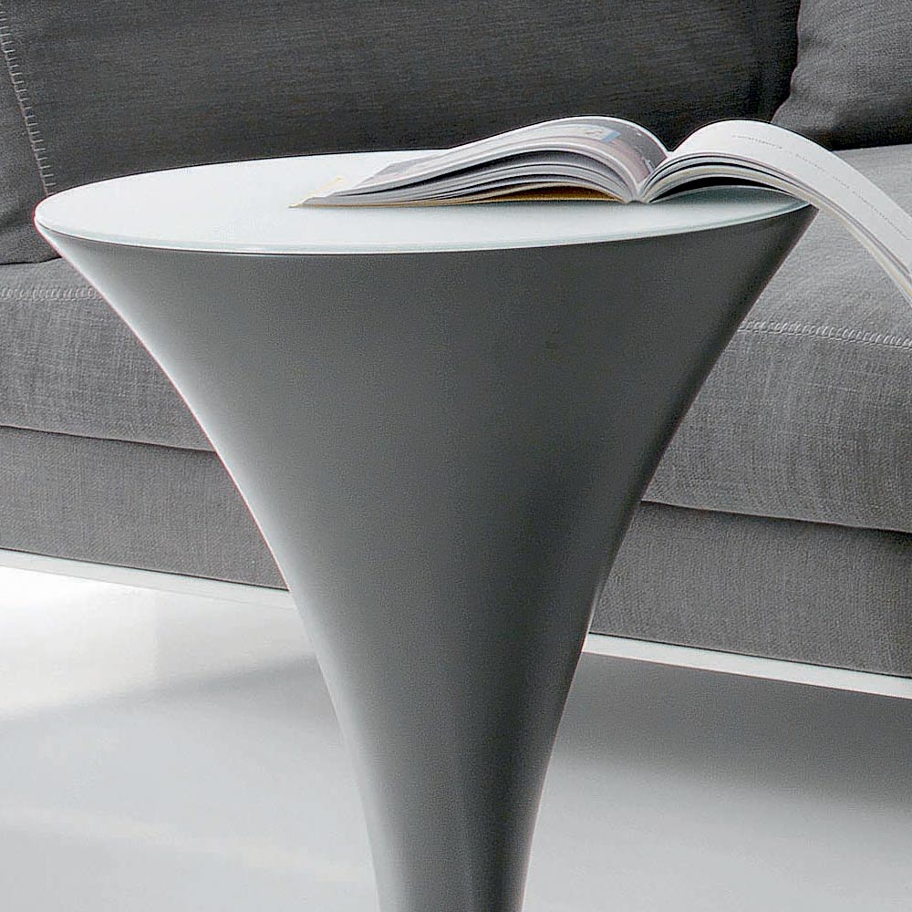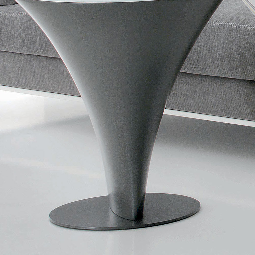 Esta mesita redonda tiene una estructura en poliuretano y base de metal pintado con vidrio esmerilado. La peculiaridad del complemento viene dada por la sólida base que se estrecha al suelo anclándose a un lastre que le da estabilidad, dándole una original forma de barco que se ve reforzada por el brillo de la tapa de cristal.
