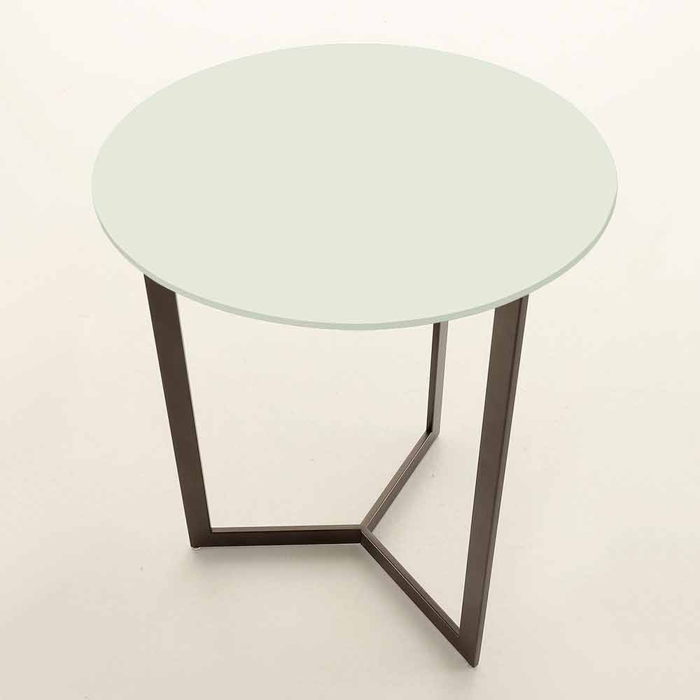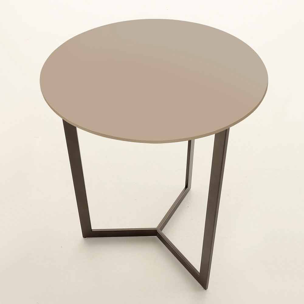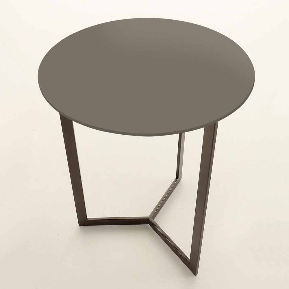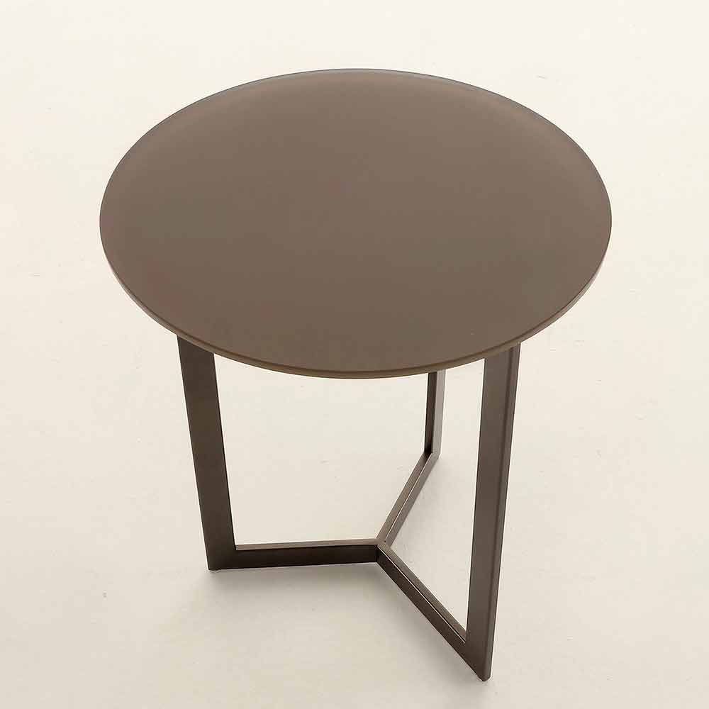 Mesa de centro simple y elegante fabricada en Italia con tapa redonda en vidrio satinado antihuellas y estructura en metal pintado marrón .