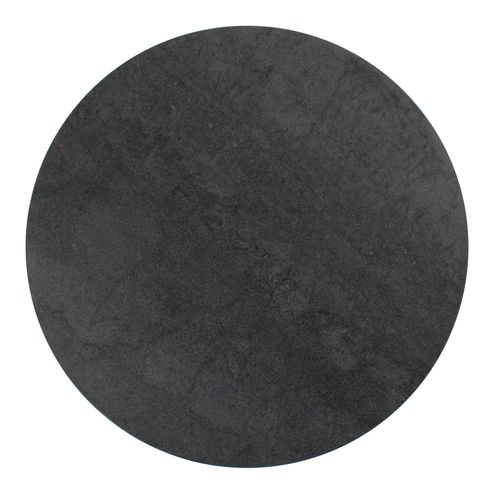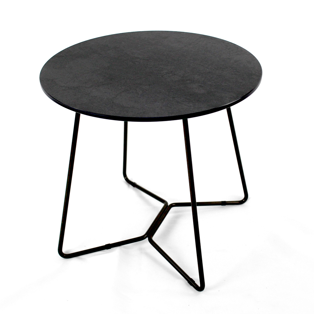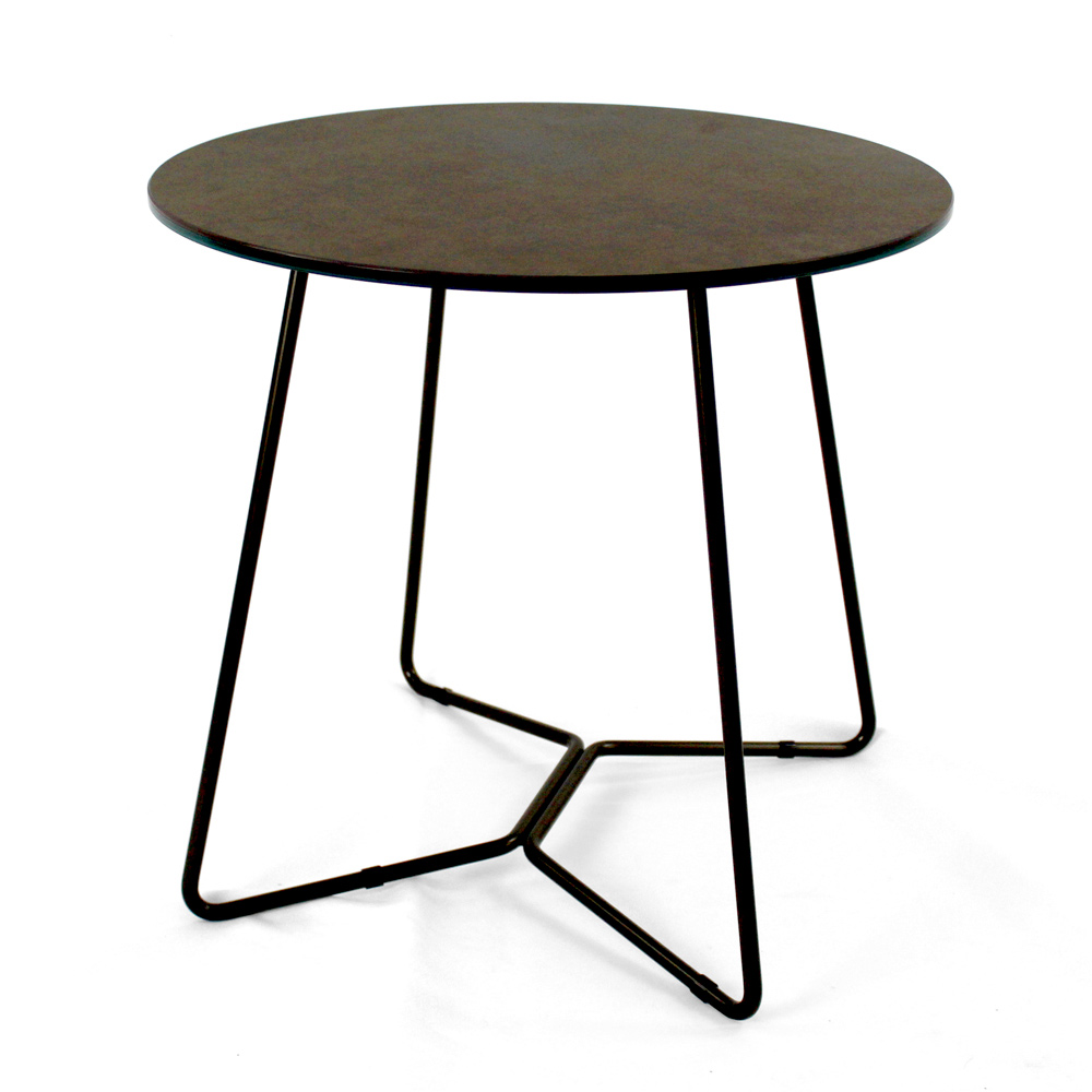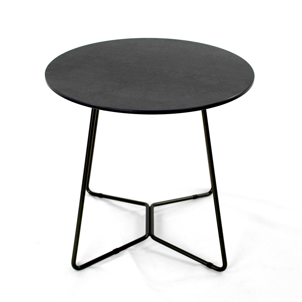 Mesita redonda con base de acero pintado y encimera de gres porcelánico.