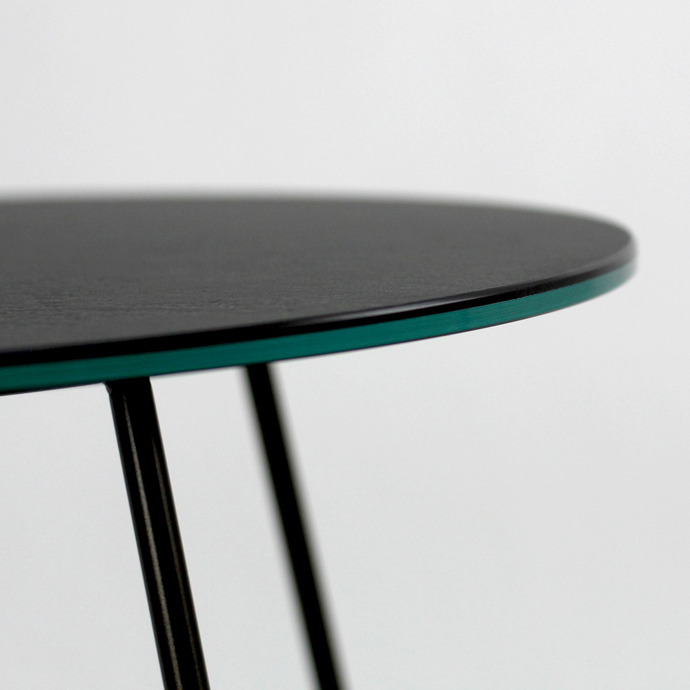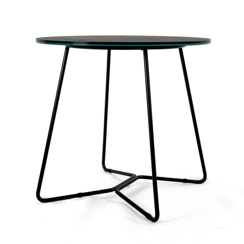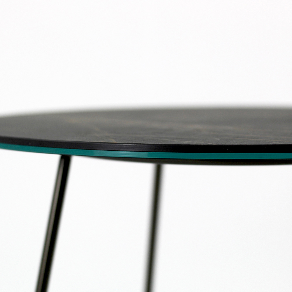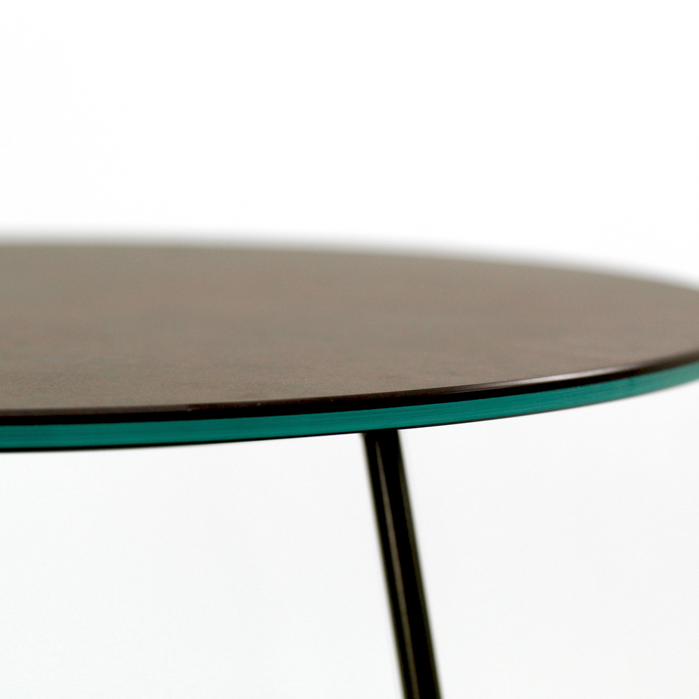 Mesita redonda con base de acero pintado y encimera de gres porcelánico.