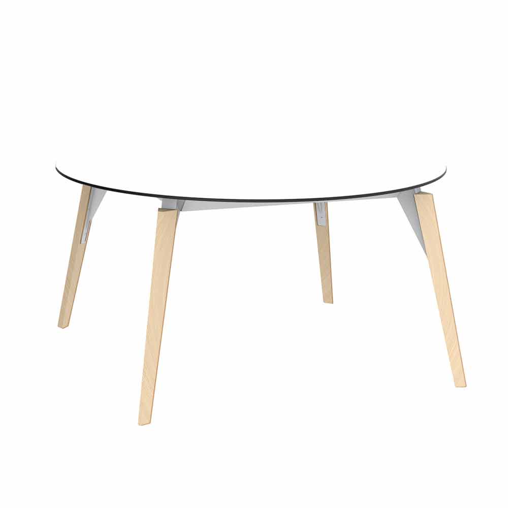 Mesita redonda con patas en madera de fresno claro u oscuro y tapa de hpl en varios acabados y 2 medidas.