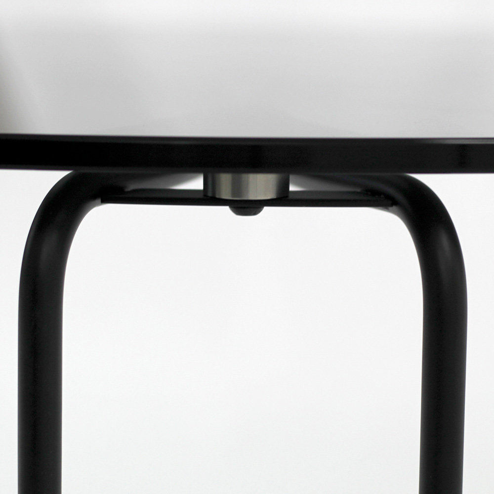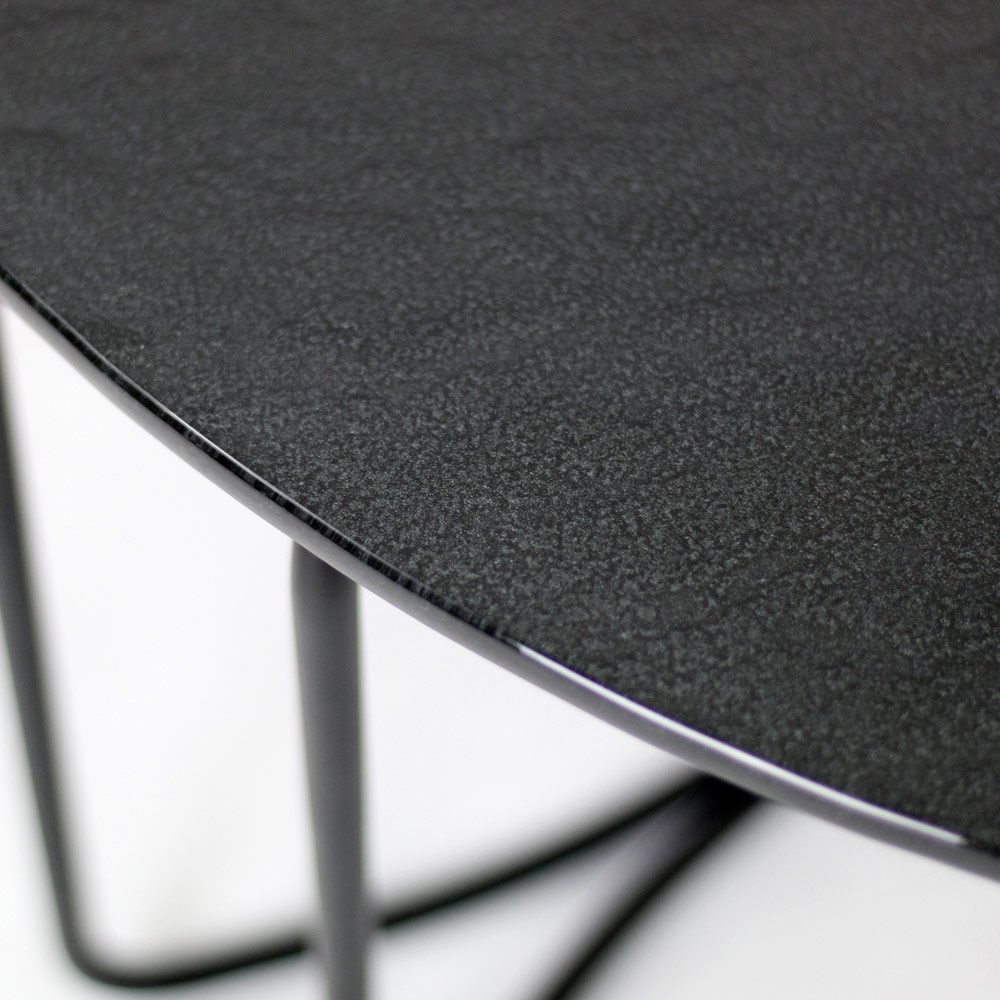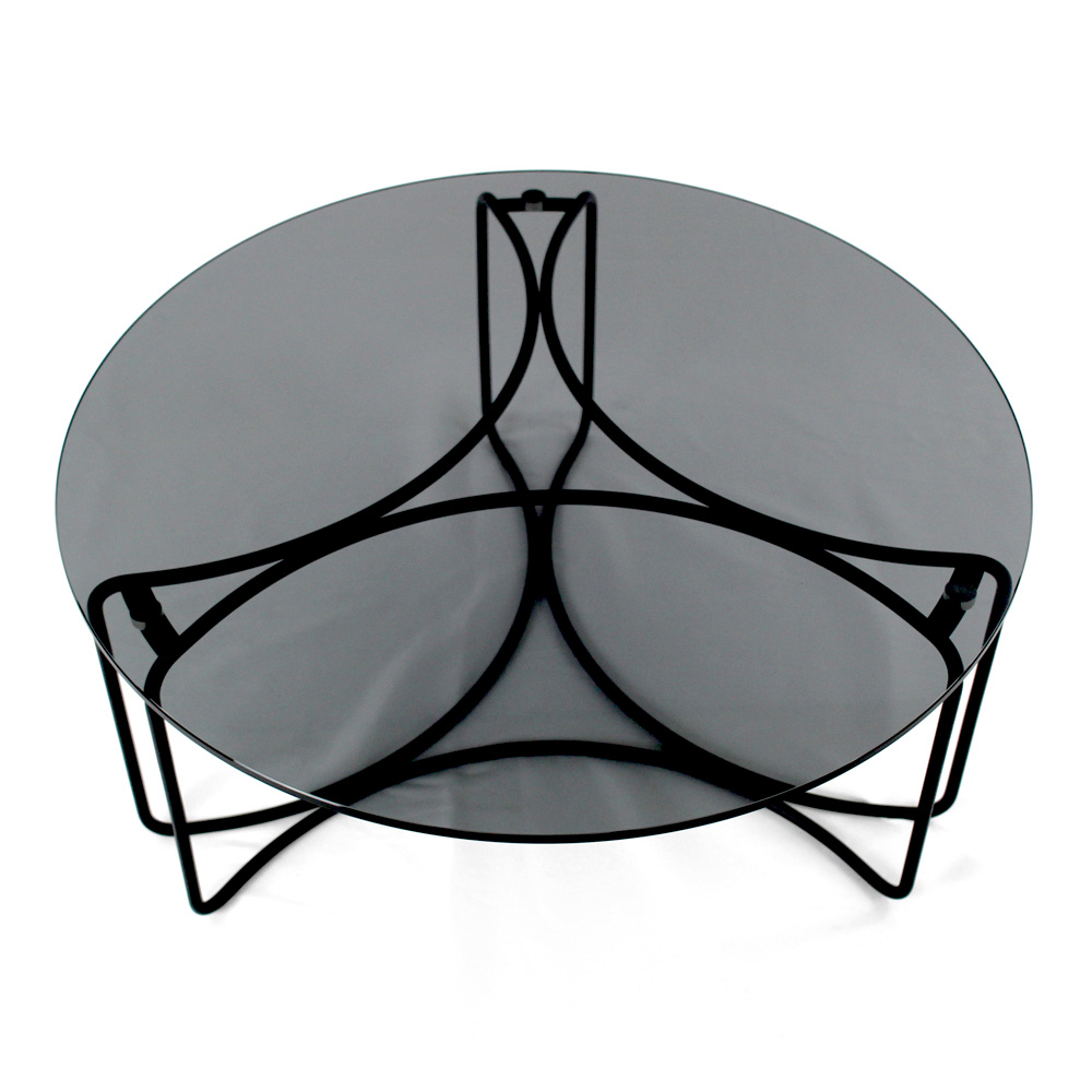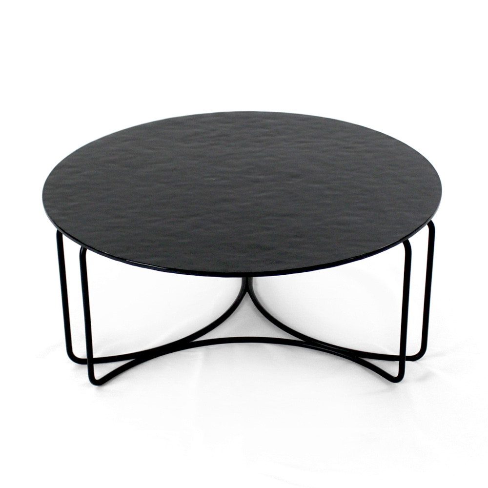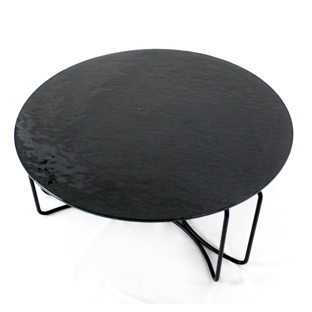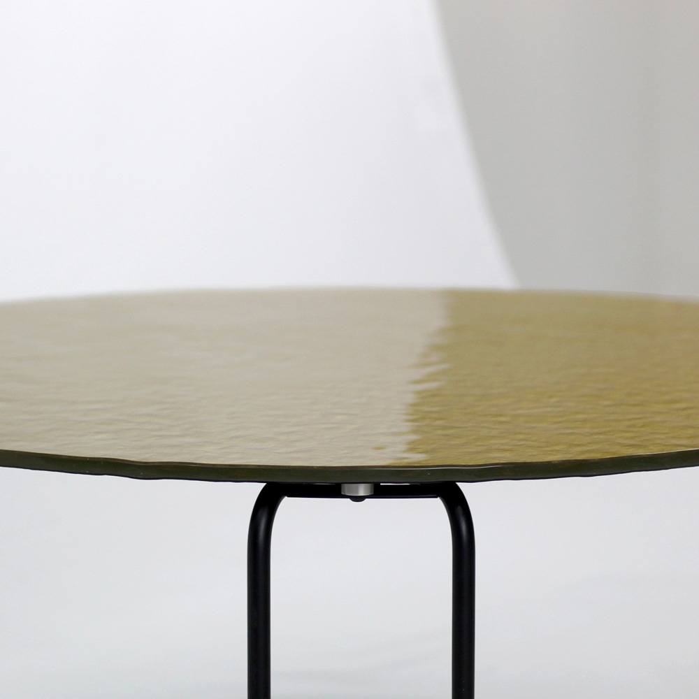 Mesita redonda con base de acero pintado y tapa de cristal.