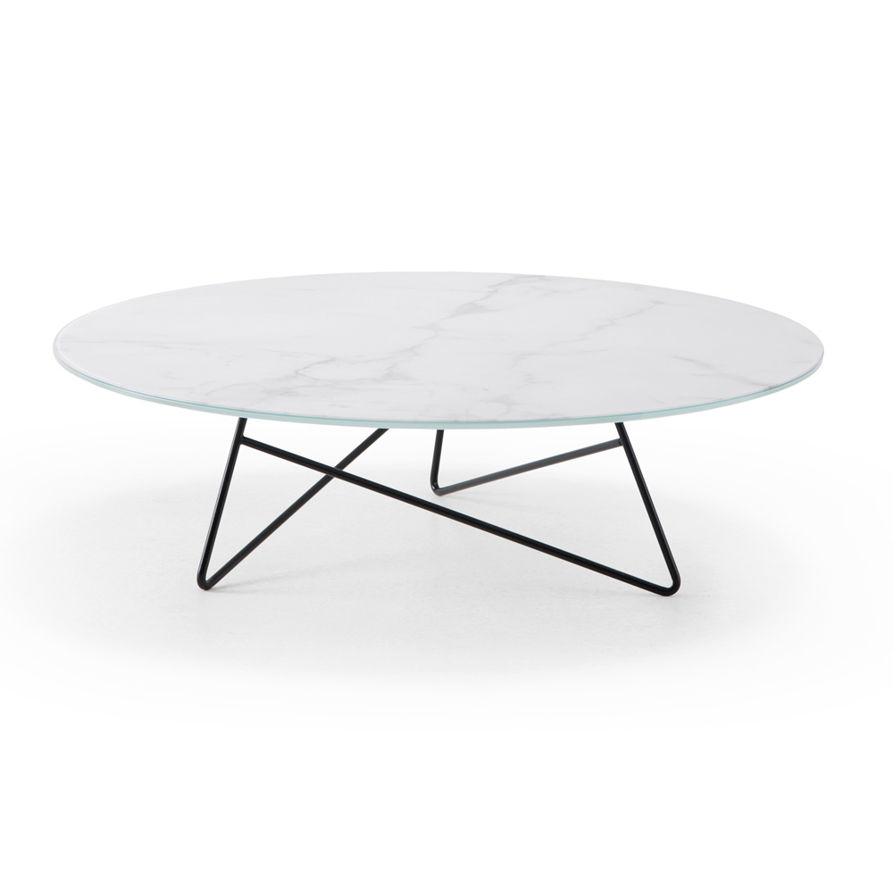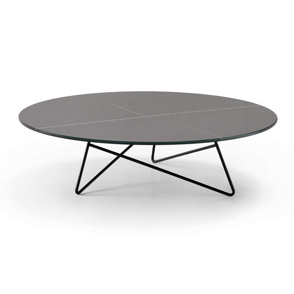 Realizada con una base de metal pintado en varios colores RAL y una base de mármol de vidrio blanco o negro , la mesa de centro es extremadamente refinada y lujosa.