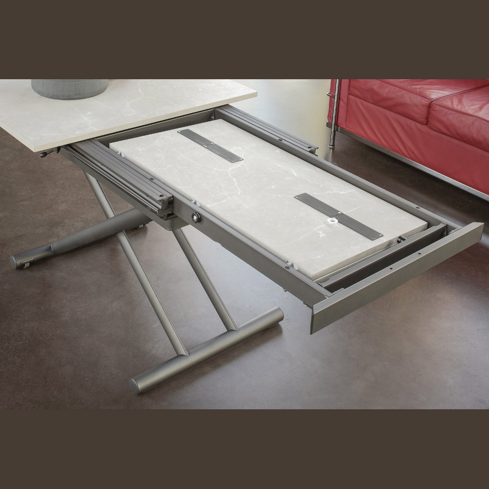Pero la verdadera magia ocurre cuando se transforma. Con una simple acción, esta pieza versátil se eleva y expande, transformándose en una mesa de comedor espaciosa y acogedora. El mecanismo es fluido e intuitivo, diseñado para ofrecer la máxima funcionalidad sin sacrificar el estilo.