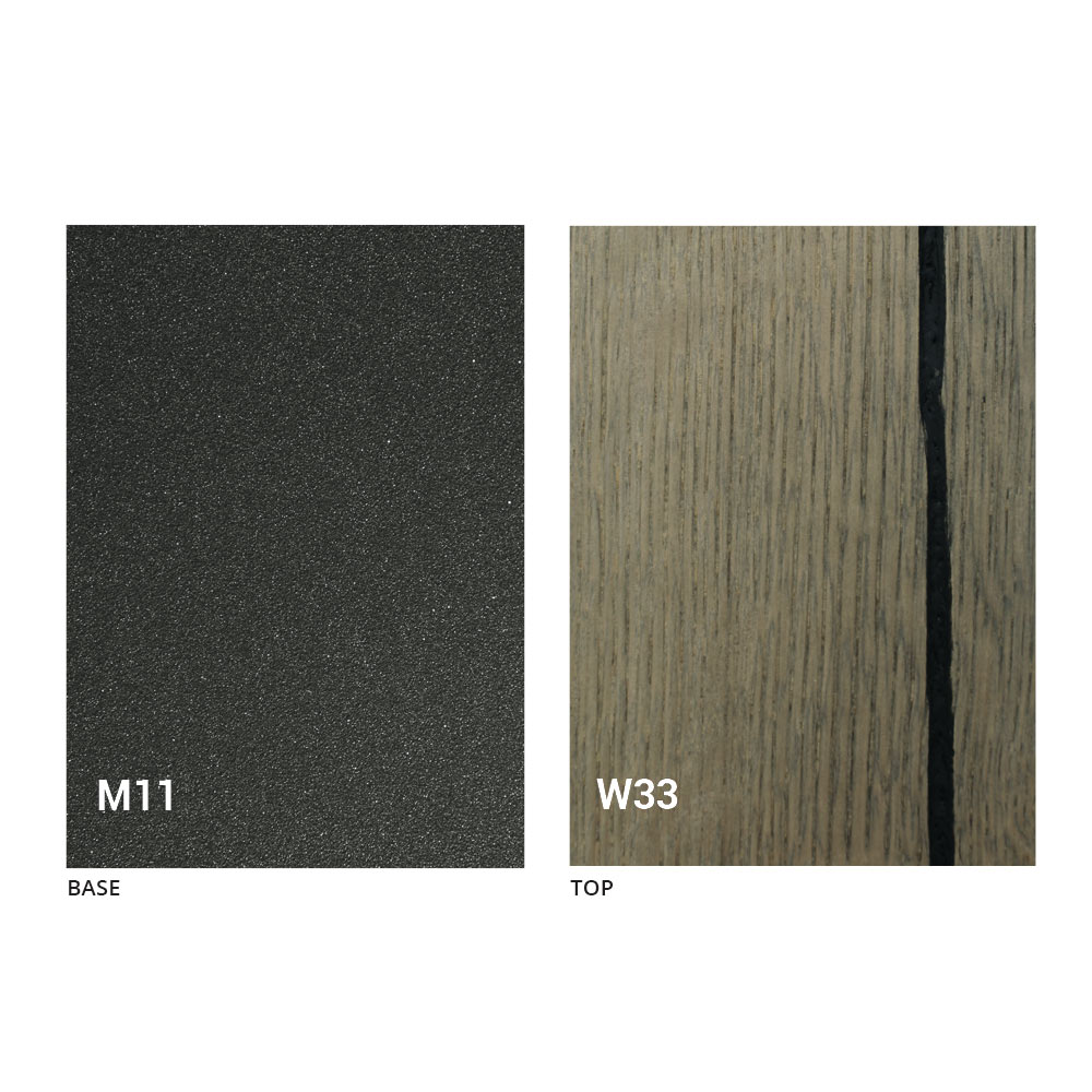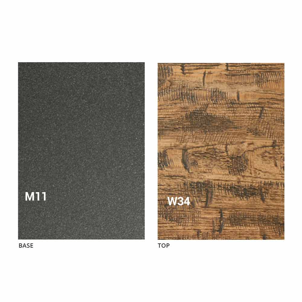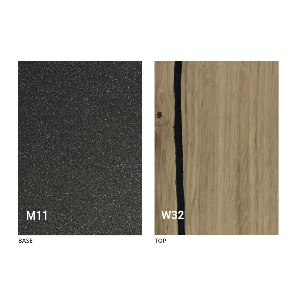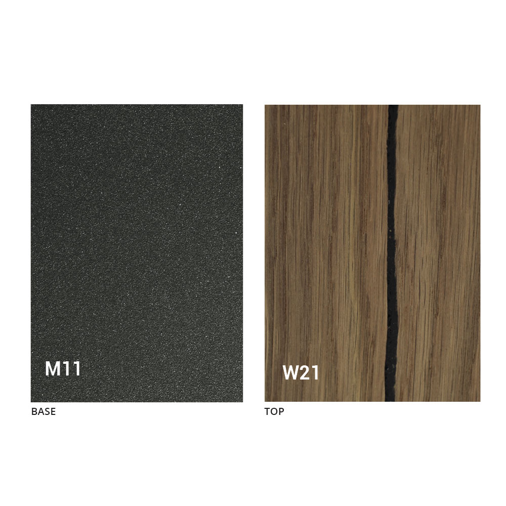 Con una tapa de madera macizay una base de metal pintado en grafito en relieve.