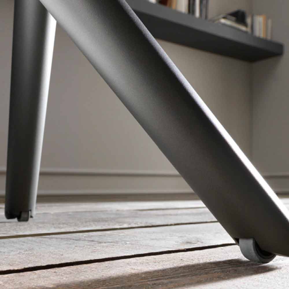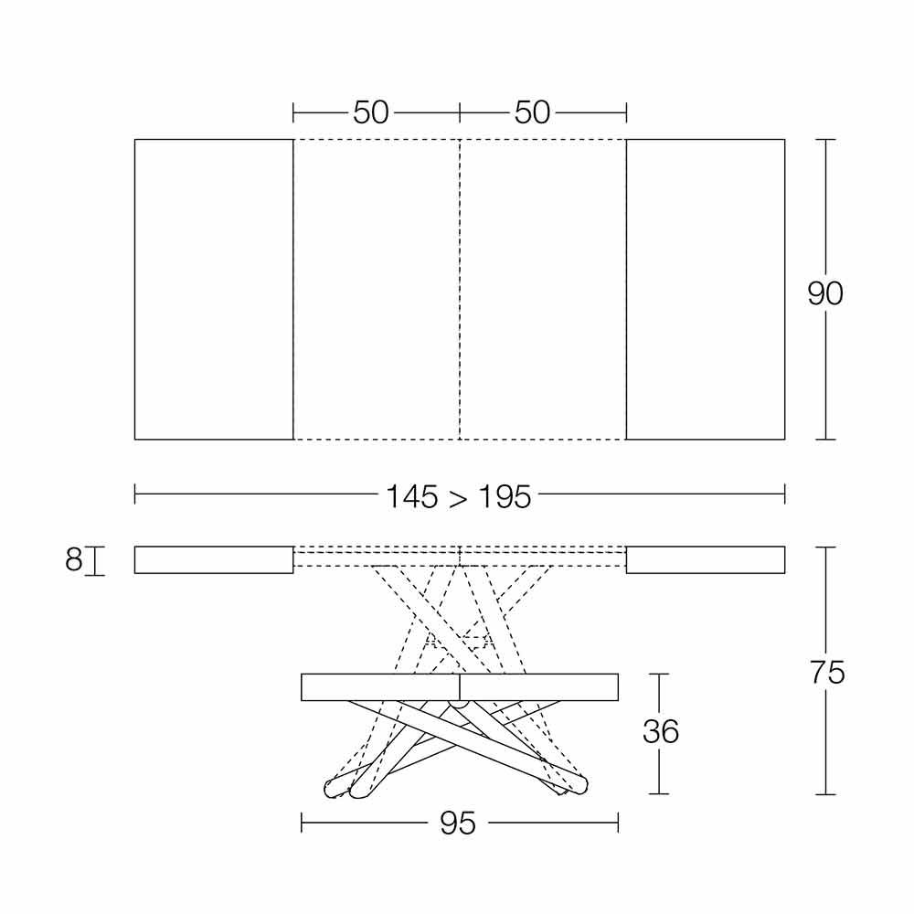 Una característica peculiar es la transformación de mesa de centro a mesa de comedor o cocina con un mecanismo de gas regulable en altura al milímetro de 36 cm a 75 cm.