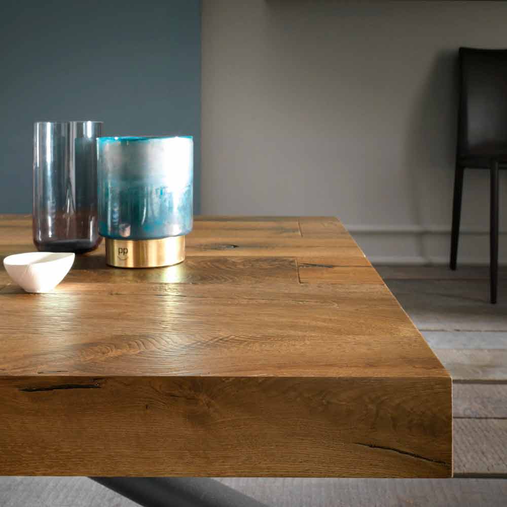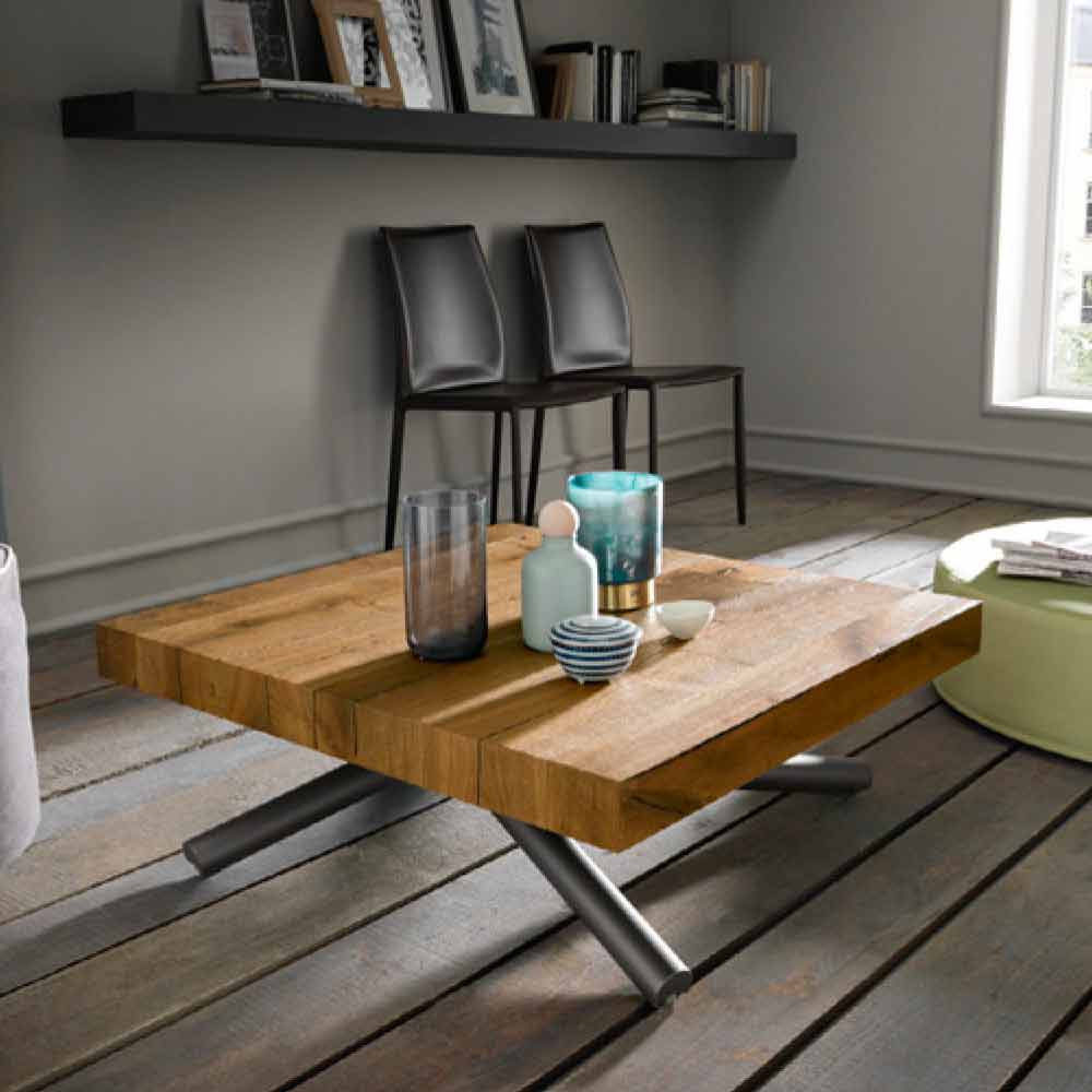 Esta mesa de centro transformable unifica la modernidad del concepto y el diseño entrelazado de las patas de metal, con la parte más naturalista y valiosa del grueso tablero (8 cm) en roble macizo.
