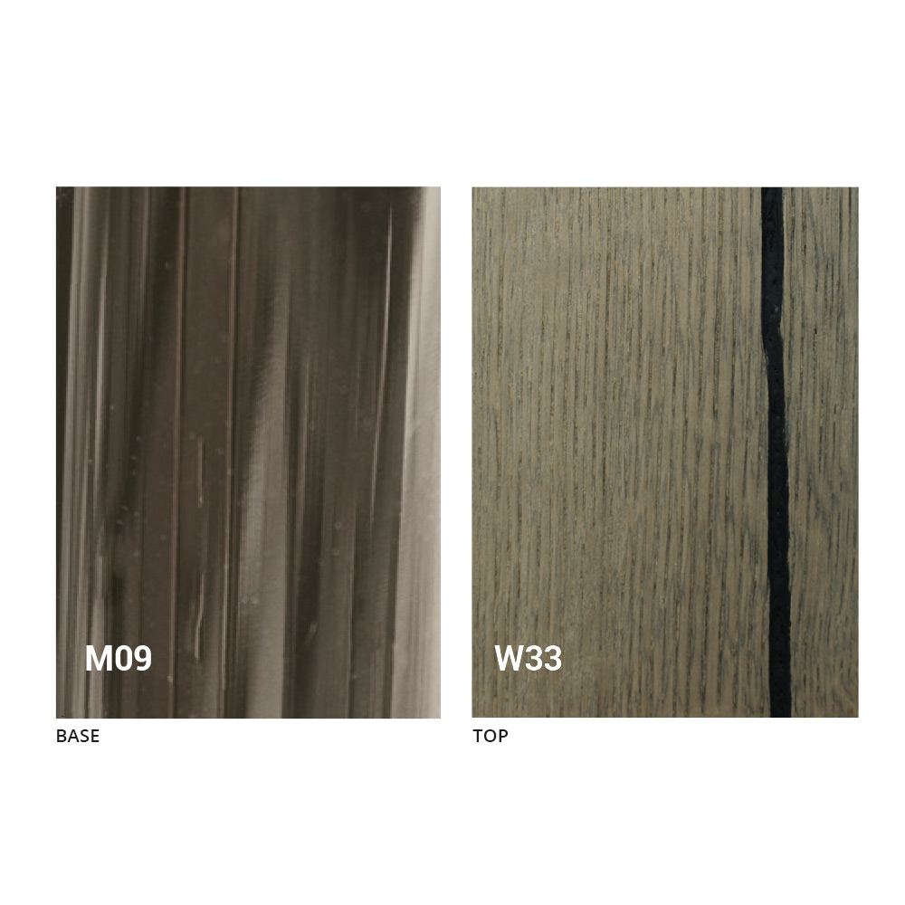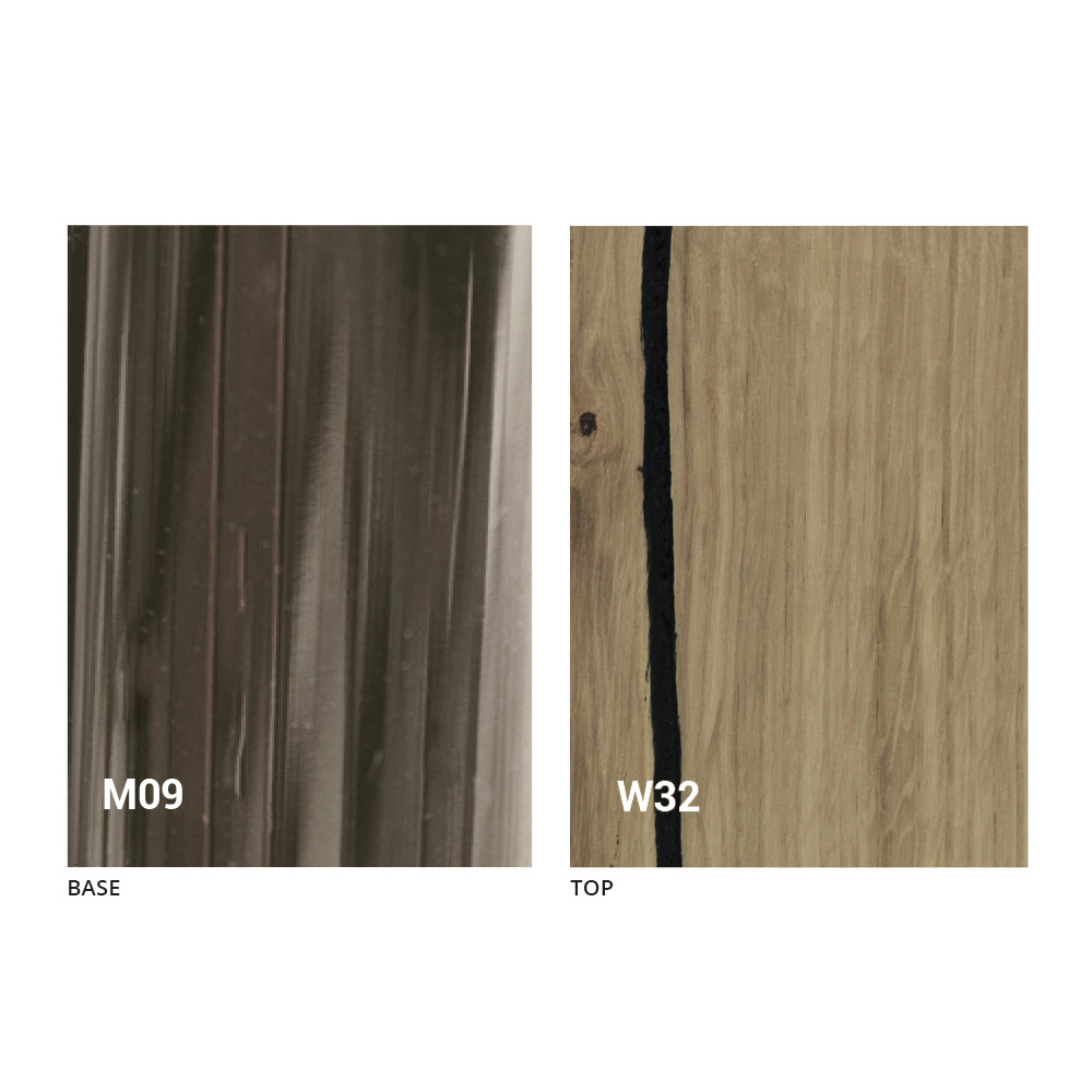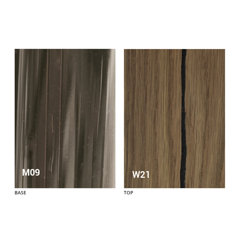 Caracterizado por una tapa de madera maciza (grosor de 12 cm) y una base de metal cromado negro brillante .