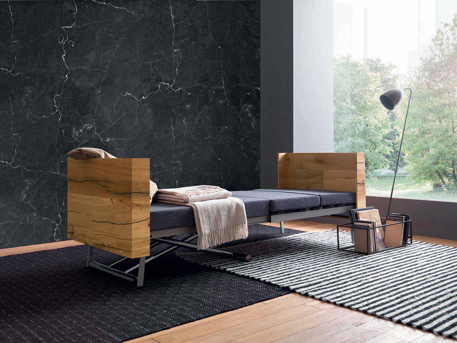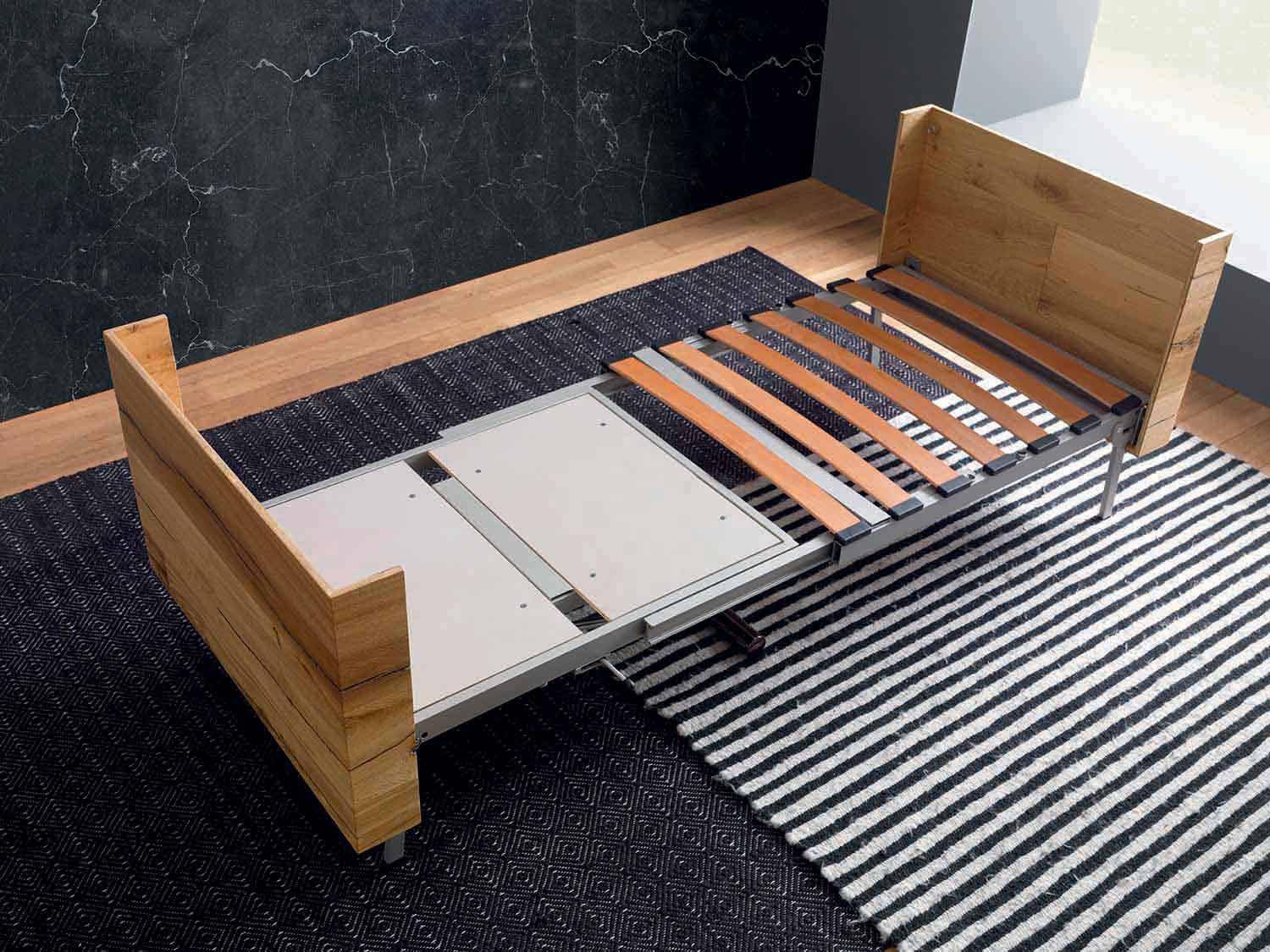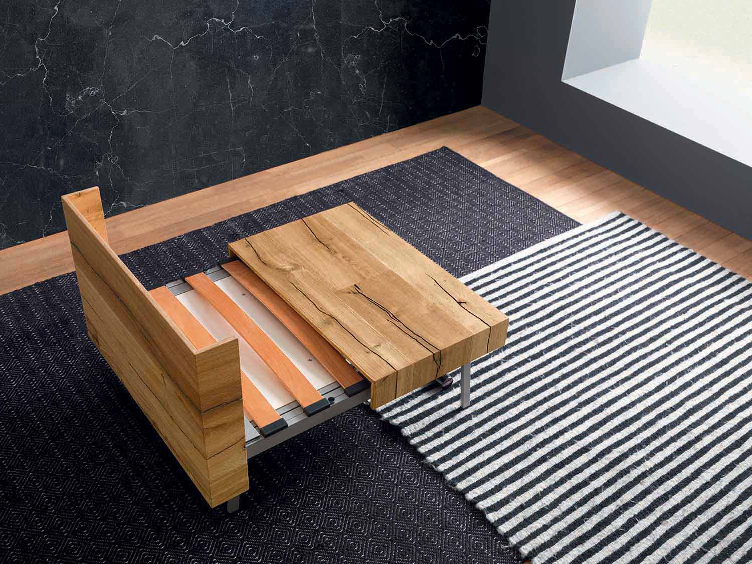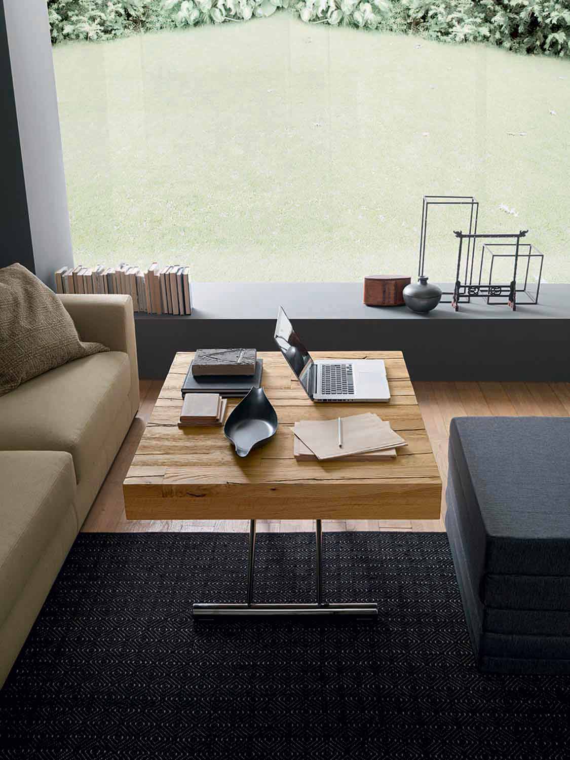 Esta mesa de centro transformable se caracteriza por líneas elegantes y versátiles capaces de moverse en altura para cumplir la función de una mesa de comedor que, si es necesario, evoluciona dando forma a una cómoda cama de diseño refinado.