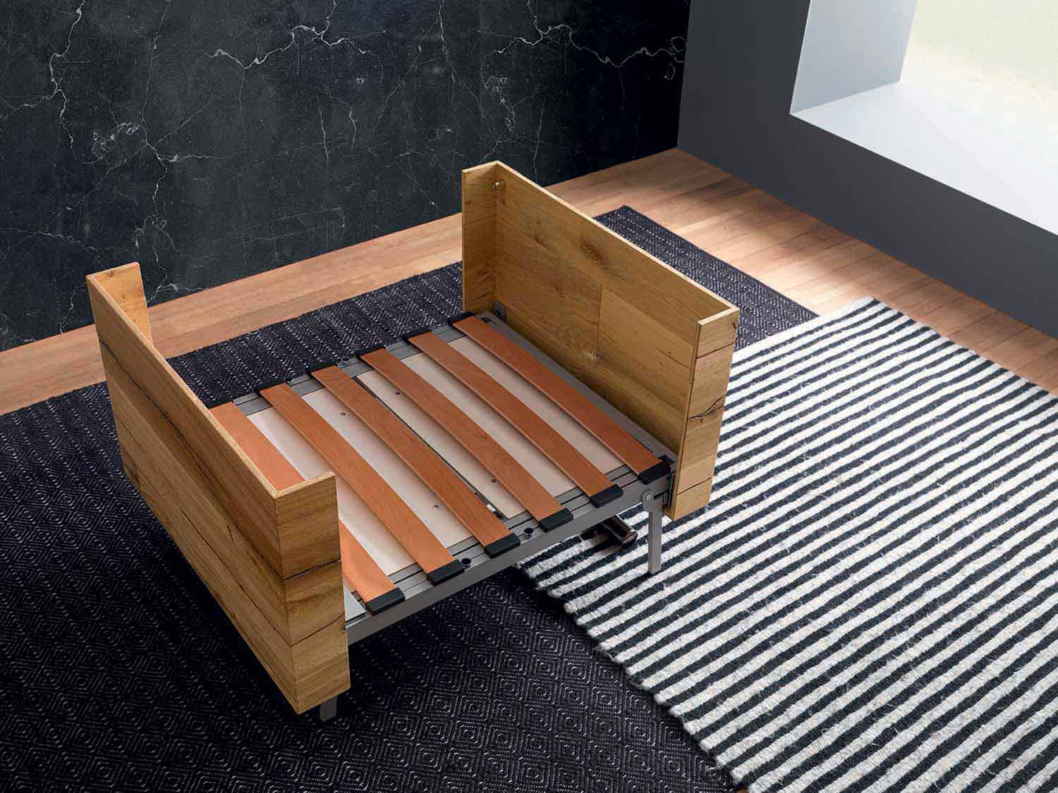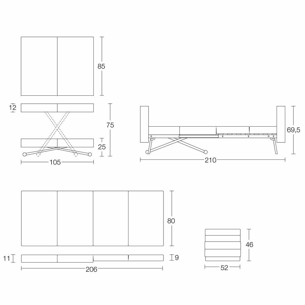 Equipado con puf convertible en colchón (espuma de poliuretano ignífuga D 35), revestido de tejido gris. Base de listones y panel de madera contrachapada. Patas de apoyo plegables. Tavoletto se convierte en una cama de 210 cm de largo .