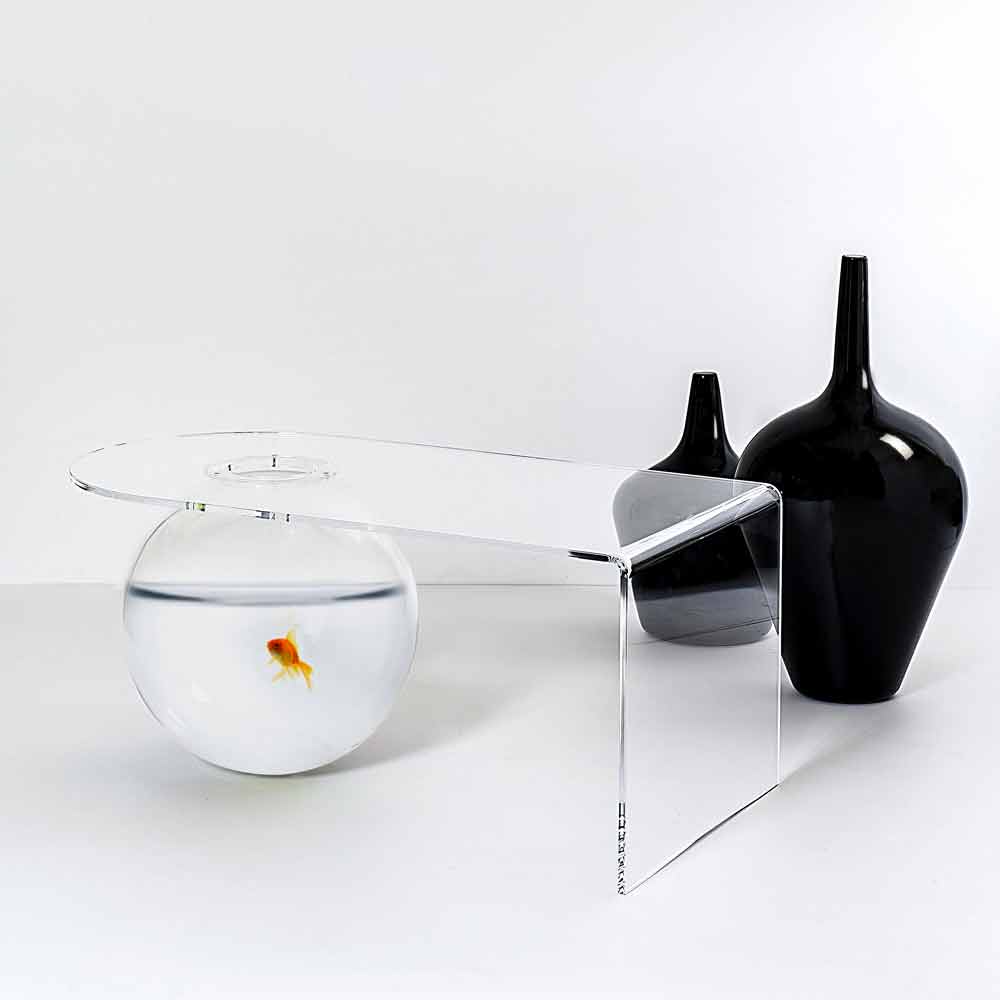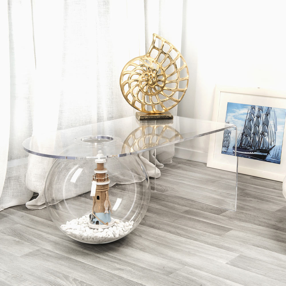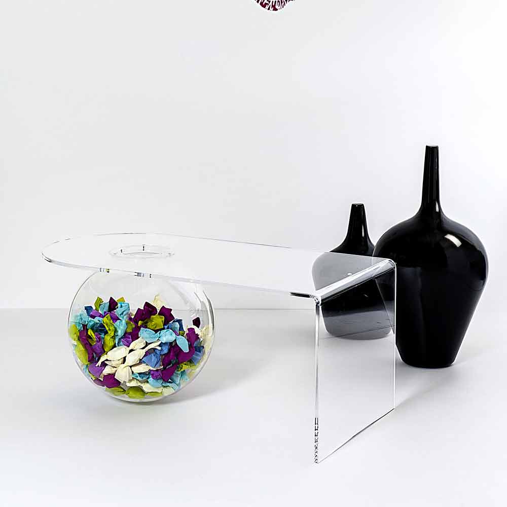 Mesa de centro transparente moderna del diseño L90xH40xP48 cm Bolly, hecho en Italia Mesa de vidrio de plexiglás PMMA de polímero 100% virgen, cortado con láser, termoformado a altas temperaturas y ensamblado a una estructura esférica utilizable como florero para flores, como acuario o simplemente como contenedor. El plexiglás es a prueba de golpes, indeformable, inalterable y térmico. El brillo y el brillo se mantienen constantes y sin cambios a lo largo del tiempo. El plexiglás de PMMA de polímero virgen utilizado es no tóxico, hipoalergénico, inodoro y antibacteriano. 100% reciclable Diseñado, diseñado y fabricado en Italia, con materiales italianos.