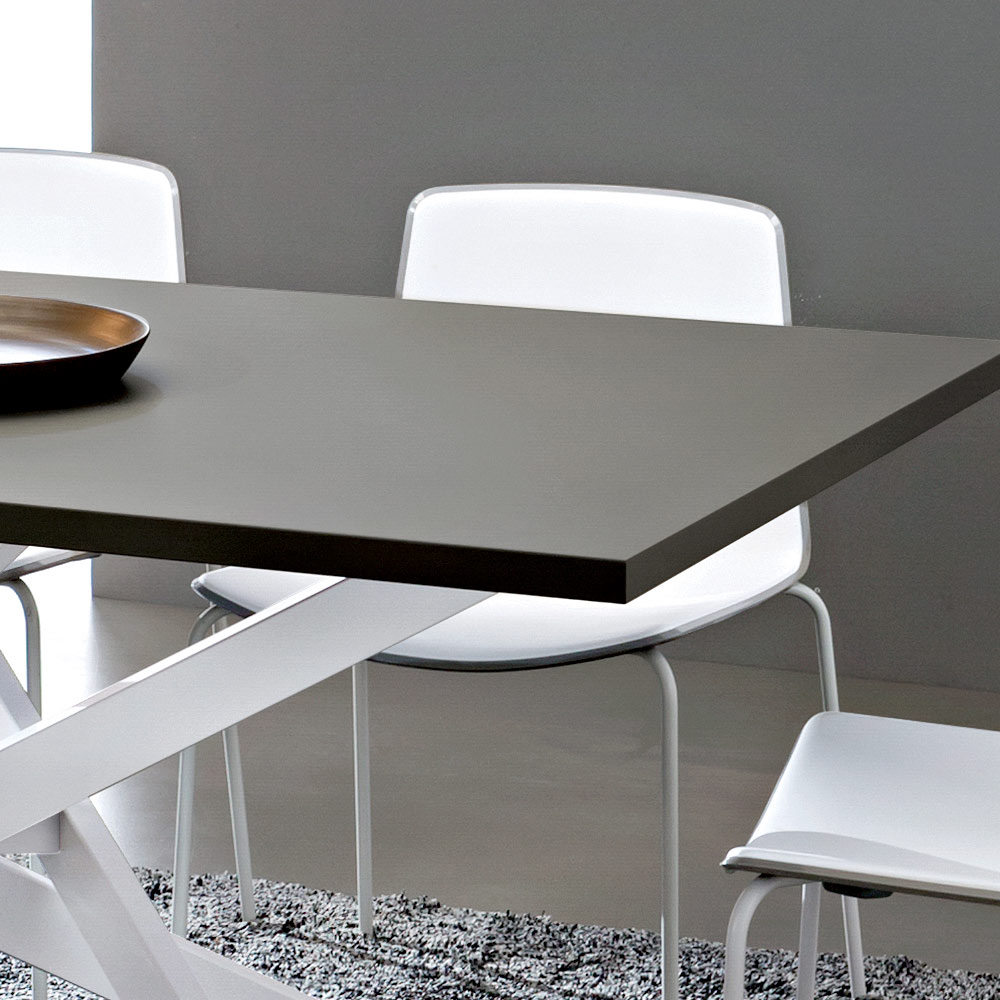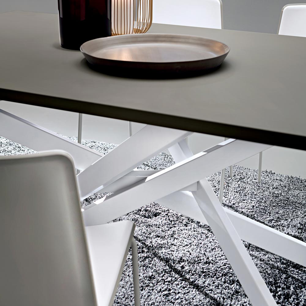 Mesa de comedor fabricada en Italia con tapa en fenix y base en metal pintado con polvos epoxi blancos. Un mueble de alma sencilla y versátil cuyo diseño se ve enriquecido y singularizado por la particular forma de las patas que, gracias a la insólita forma entretejida, confieren a la mesa su verdadera personalidad moderna y exclusiva . El matiz elceptivo de la base también hace que cada combinación de colores sea perfecta, por lo que es ideal para las más variadas situaciones de decoración moderna en las que encaja perfectamente, dando al ambiente un toque innovador y refinado . A nivel visual, su peculiaridad es el tablero de estratificado fenix que, mediante el uso de resinas innovadoras , ofrece una superficie resistente, agradable al tacto y extremadamente opaca , elementos que, además de aumentar el lado funcional de la mesa, subrayan y completar la 'estética.