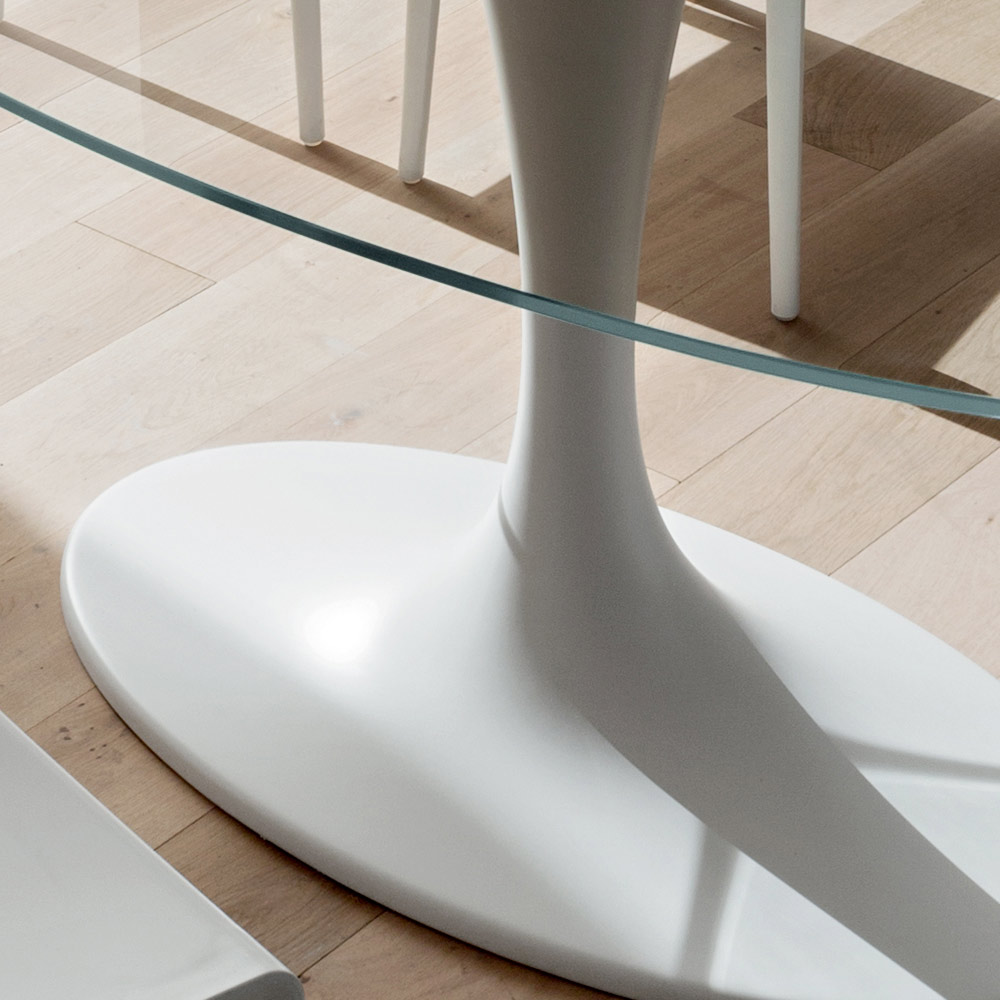 Mesa de comedor fabricada en Italia con tapa ovalada en vidrio templado (espesor 12 mm) acabado transparente brillante con brida de acero encolado y base en mármol mineral (mármol sintético), material obtenido mezclando polvos de mármol. Del encuentro entre materias primas de calidad y formas originales, nace una solución de decoración extremadamente creativa que hace de cada comedor o cocina un ambiente casi futurista. Lo que caracteriza su estética, convirtiéndolo en un producto único en su género, es la base de mármol sintético que, además de ofrecer una excelente estabilidad, lo enriquece con su marcada personalidad moderna junto con la tapa de cristal, un elemento especialmente versátil y a la vez elegante. . El resultado final es un mueble ecléctico e inusual , ideal para quienes aman amueblar los espacios de su hogar con elementos de estilo vanguardista y refinado que llaman la atención gracias a su alma revolucionaria para crear así una maravillosa armonía de estilos.