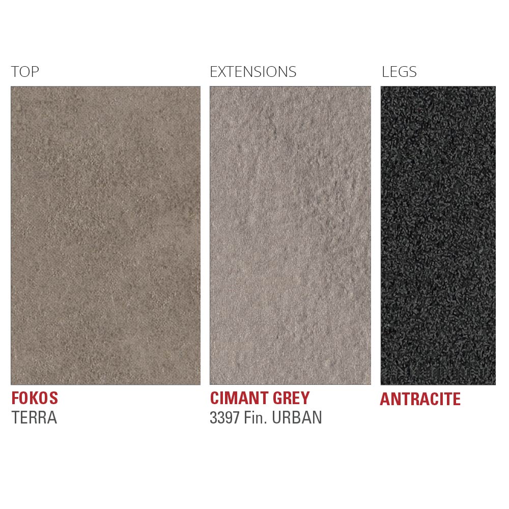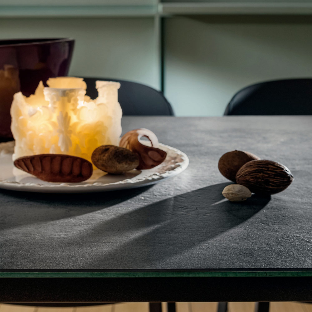 Mesa de comedor fabricada en Italia con sobre de laminam (gres porcelánico) con soporte de cristal y patas de aluminio lacado epoxi en acabado antracita. Su peculiaridad está representada por la tapa de laminam, una superficie cerámica revolucionaria creada a partir de una mezcla de gres porcelánico que permite obtener una tapa resistente a los disolventes, desinfectantes y detergentes, así como a los arañazos y abrasiones profundas. Además, es especialmente sencillo y rápido de limpiar, consiguiendo mantener siempre inalteradas sus peculiares características. Su diseño se caracteriza por líneas sencillas enriquecidas por texturas y acabados extremadamente elegantes que lo convierten en una solución ideal para completar tus espacios con estilo y personalidad, obteniendo funcionalidad y una estética exclusiva en un solo artículo. Junto a la estética cautivadora y refinada, encontramos un fuerte lado funcional subrayado por la parte superior extensible gracias a las extensiones a juego que ofrece la posibilidad de recibir a un mayor número de invitados que vuelven a ocupar un espacio más pequeño una vez cerrado.
