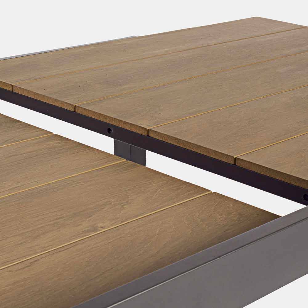 Estructura de aluminio pintado en polvo (poliéster). Tablero en polywood (material compuesto con apariencia similar a la madera) 90% poliestireno 10% sbs color teca. Extensión retráctil. Tornillos de acero galvanizado. Piernas para montar.