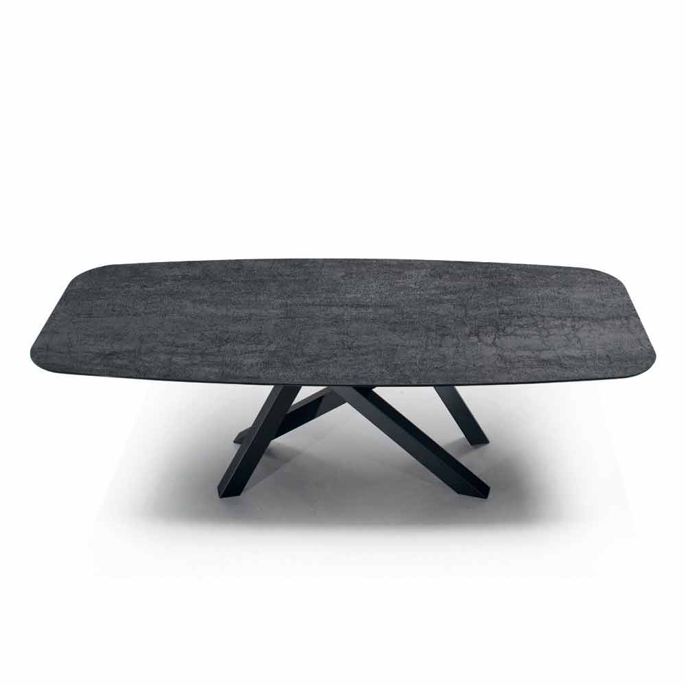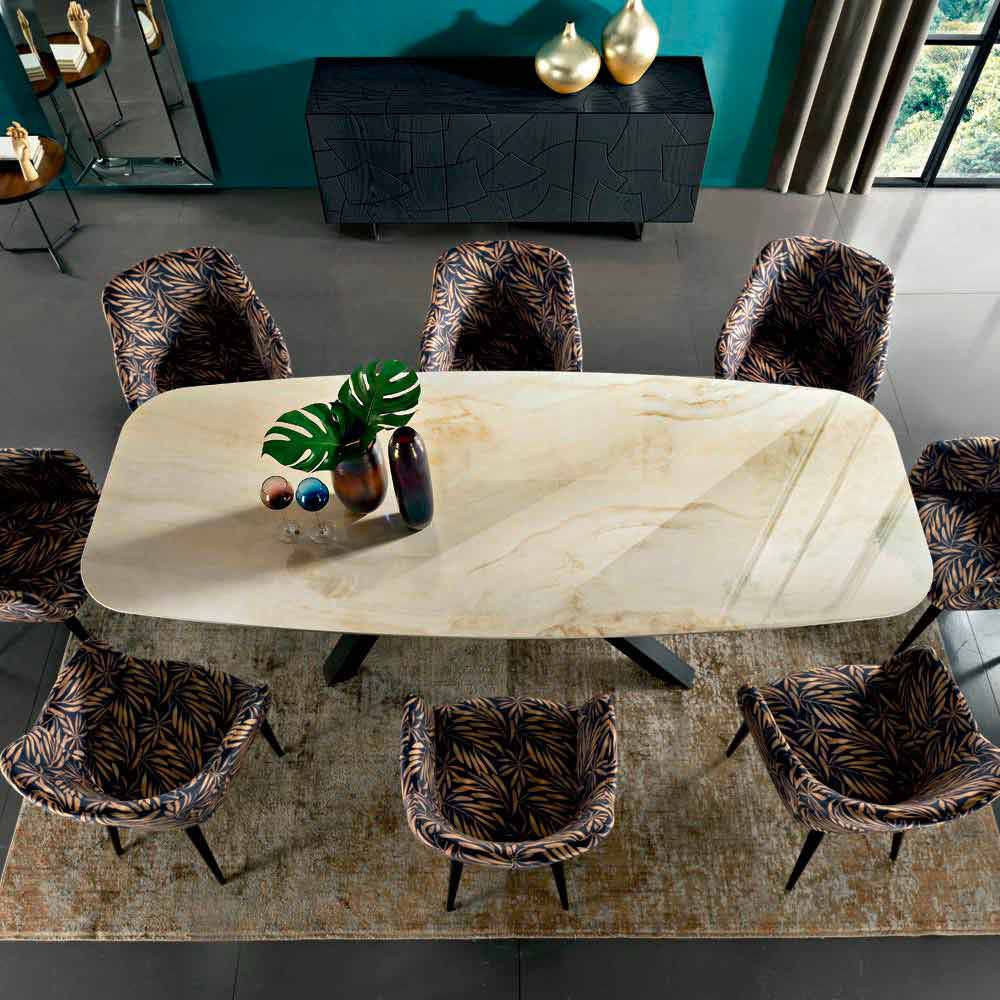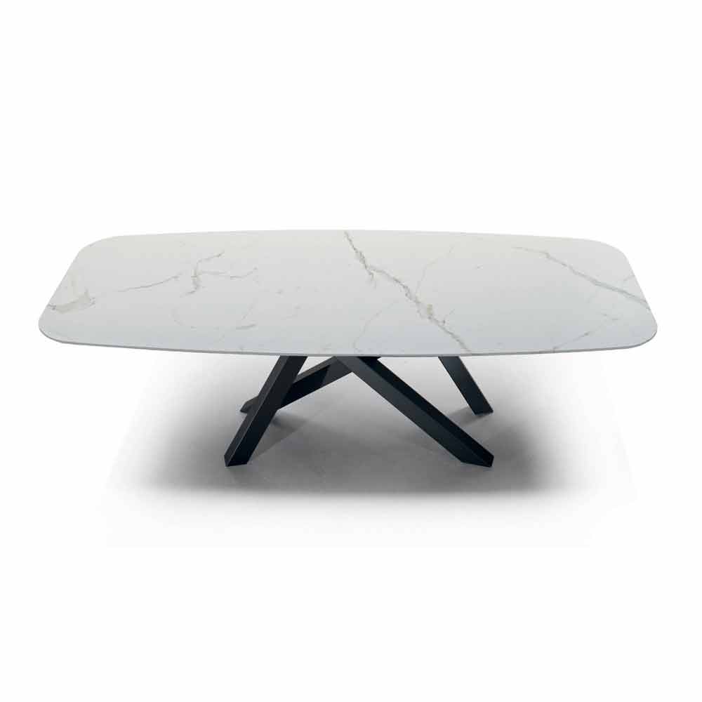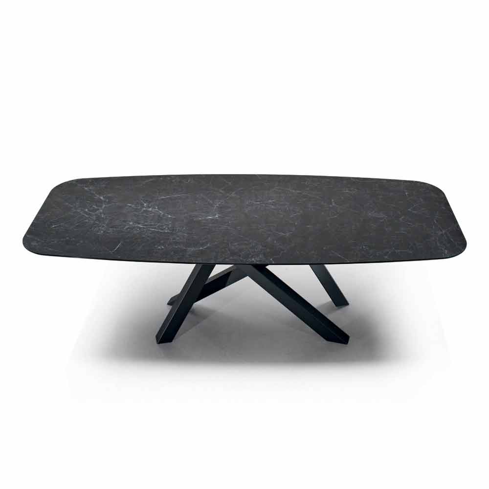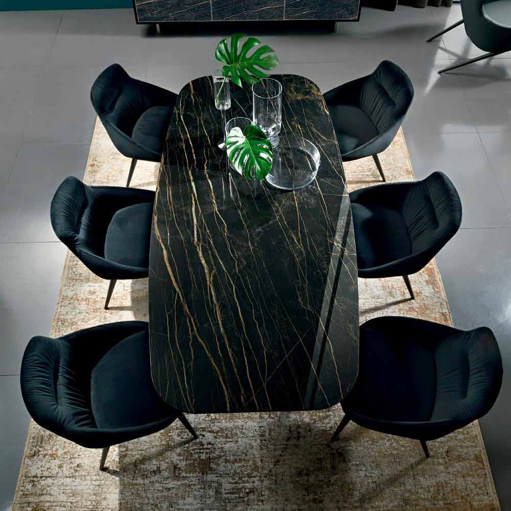 Mesa de comedor moderna y elegante fabricada artesanalmente en Italia con tapa en forma de barril de cerámica laminada obtenida a partir de una lámina de vidrio biselado y una lámina de cerámica y base de acero pintado de negro . Gracias a su estética cautivadora y refinada , este maravilloso mueble aporta a cada ambiente un toque exclusivo gracias a la especial atención al detalle y al uso de materias primas de alta calidad 100% Made in Italy . De hecho, la cerámica laminam, además de completar con elegancia el aspecto de la mesa, es un material que presenta numerosas peculiaridades que lo convierten en una opción ideal para proporcionar al mismo tiempo una sólida superficie de apoyo y un diseño elegante capaz de revolucionar todos los ambientes. con personalidad.
