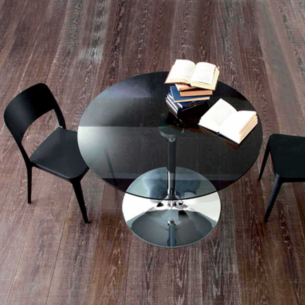 Mesa de comedor fabricada en Italia con tapa redonda de cristal (10 mm de espesor) y base de columna central en metal acabado cromado .