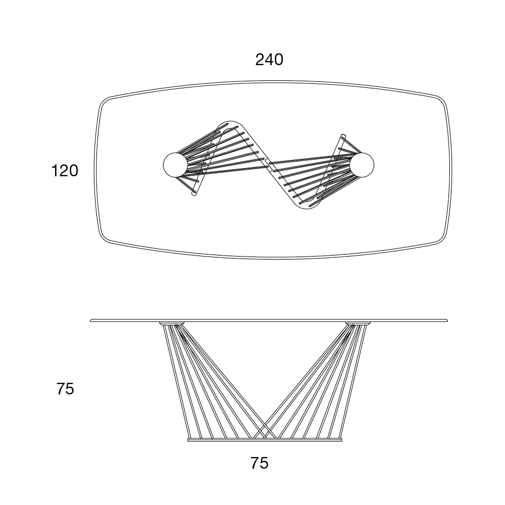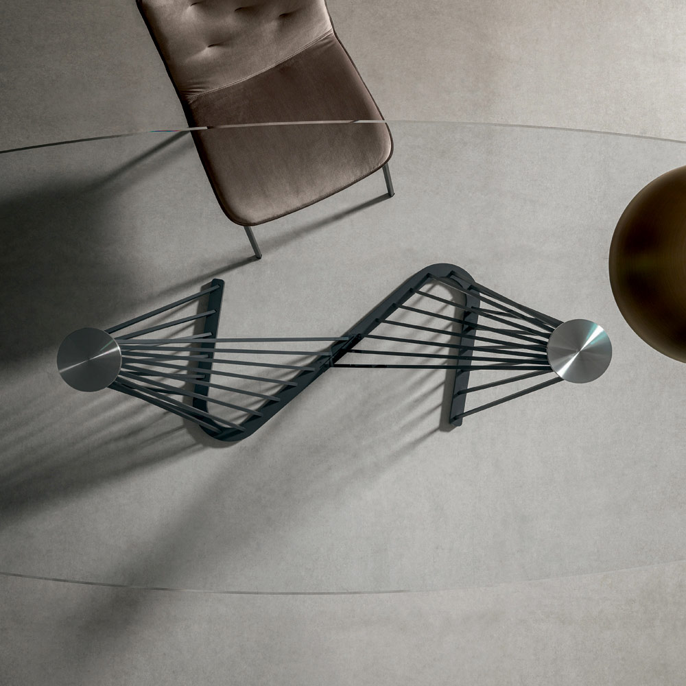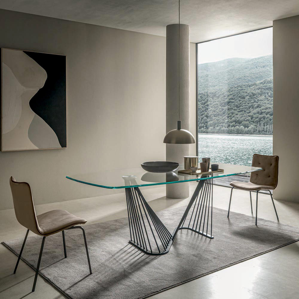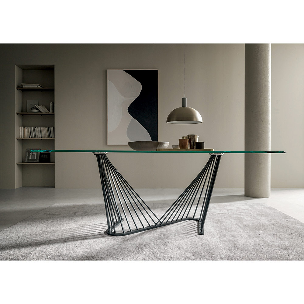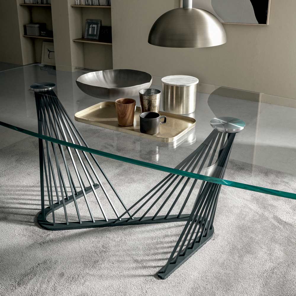Esta mesa de comedor tiene una estructura con base de varilla metálica cuadrada, con recubrimiento en polvo de grafito gofrado y una tapa en forma de barril en vidrio templado transparente extraclaro con borde biselado. Su peculiaridad viene dada por la estructura formada por una serie de cordones metálicos de desigual longitud y estirados para soportar la tapa de cristal. Su diseño con líneas sinuosas y elegantes le da musicalidad y elegancia al ambiente.