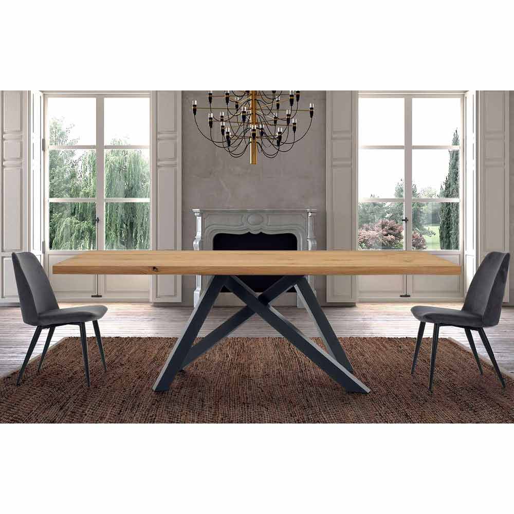 Mesa de comedor fabricada en Italia con tapa de madera chapada y base de acero lacado grafito . Un diseño marcado por líneas geométricas sencillas y versátiles que se entrelazan para dar vida a este maravilloso y elegante complemento de decoración de estilo contemporáneo capaz de completar con gusto y personalidad cualquier comedor o cocina moderna. Su punto fuerte está representado por la base y su particular forma que enriquece la estética de la mesa dándole un carácter original y exclusivo . La elegancia atemporal de la madera y sus vetas confieren también al aspecto final del producto un alma rústica y a la vez original, creando así un artículo