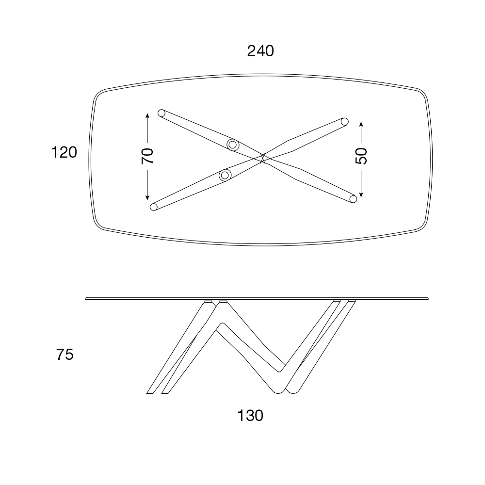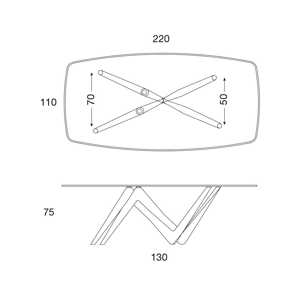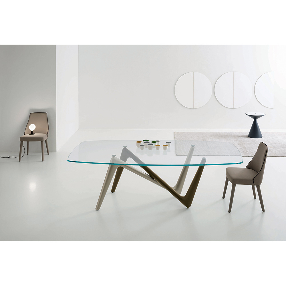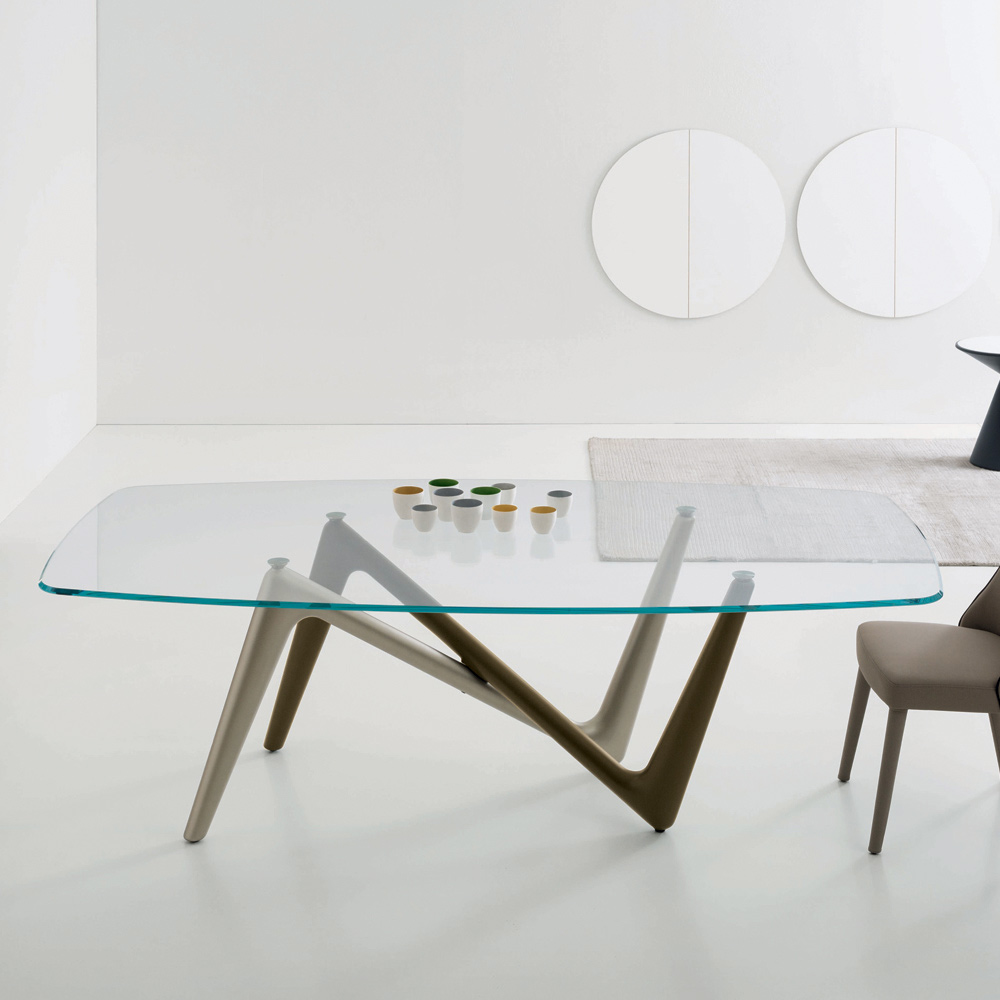 Esta mesa de comedor tiene una estructura con patas en poliuretano rígido pintado de titanio y bronce metálico y una tapa en forma de barril en vidrio templado transparente extraclaro con borde biselado. Su peculiaridad viene dada por su imagen dinámica e innovadora tanto en términos de estética como de funcionalidad: la estructura se entrelaza para sostener ligeramente la encimera, dándole un aspecto escultural y refinado. Su diseño versátil y exclusivo es ideal para recibir a los huéspedes con el máximo confort.