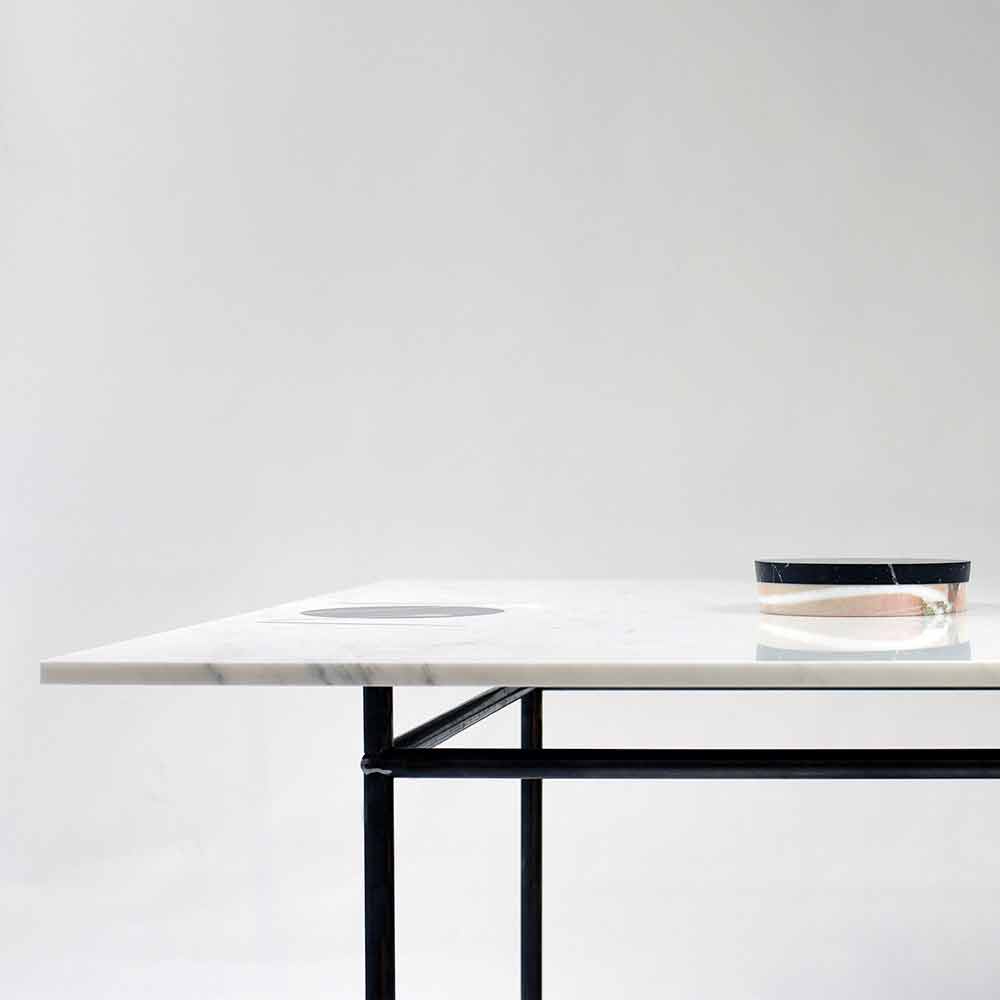 Esta mesa de comedor está inspirada en el concepto de estar en la mesa considerado principalmente como un momento de compartir comidas y un agradable momento cultural de convivencia. La mesa del comedor quiere volcar esta filosofía, enfocándose en la imposibilidad de reunirse debido al ritmo frenético de la vida contemporánea en favor de una comida silenciosa consumida en la intimidad de todos. De ahí nace un original complemento de decoración con un mensaje profundo, que se caracteriza por la presencia de un agujero en la zona central del tablero en el que se puede insertar el jarrón en relieve realizado en mármol estratificado de diferentes acabados. NB: el jarrón en relieve surge de la superposición de mármoles con diferentes esencias cuidadosamente elegidas entre los materiales de desecho de otros procesos, garantizando al mismo tiempo calidad ambiental y de diseño. Por este motivo, cada jarrón será diferente del otro y se diferenciará del que se muestra en la foto. La encimera de mármol Michelangelo , con espesores mínimos, está adornada con inserciones en mármol marquinia negro y latón reproducido con la antigua y tradicional técnica de incrustaciones, realizado con piedras naturales y metales preciosos. Esto es precisamente lo que hace único el diseño del complemento : una decoración divertida que quiere ironizar el tema de las jerarquías en la mesa y hacernos reflexionar sobre cómo la comida representa un medio capaz de mantener importantes relaciones sociales en el hogar. Para concluir la obra, una estructura simple y minimalista en metal pintado diseñada para sostener la encimera.