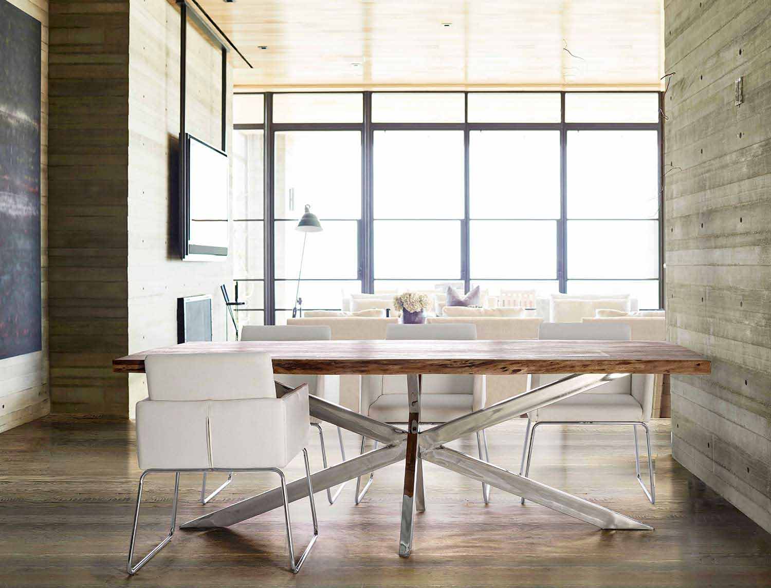Mesa de comedor de diseño fabricada en madera y acero inoxidable.