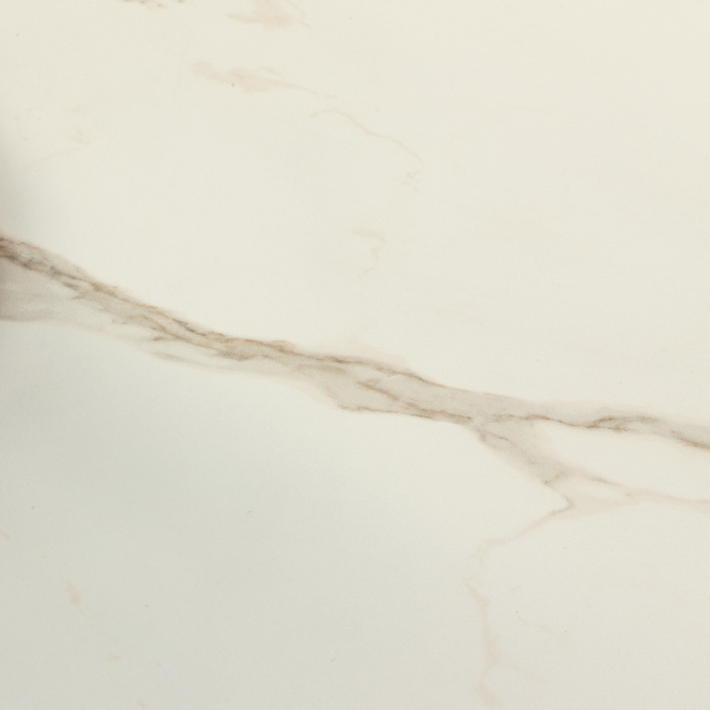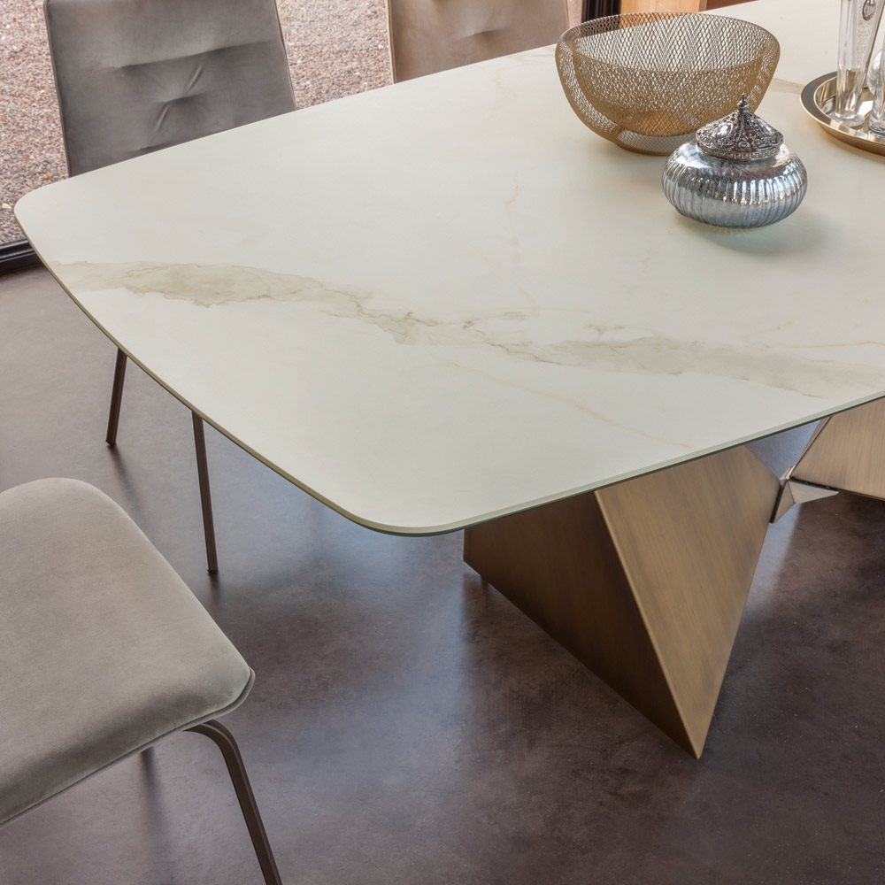 Mesa de salón realizada con patas de metal acabado latón cepillado , tapa de cerámica mate oro calacatta de 3 mm , íntegramente Made in Italy. Destaca por sus formas inesperadas y su elegante diseño. Tiene una tapa de cerámica sostenida por una base de metal con recubrimiento en polvo. El diseño armonioso con líneas curvas en la parte superior y cantos perfectos en la base aporta un equilibrio que enriquece el ambiente con una nota de elegancia.